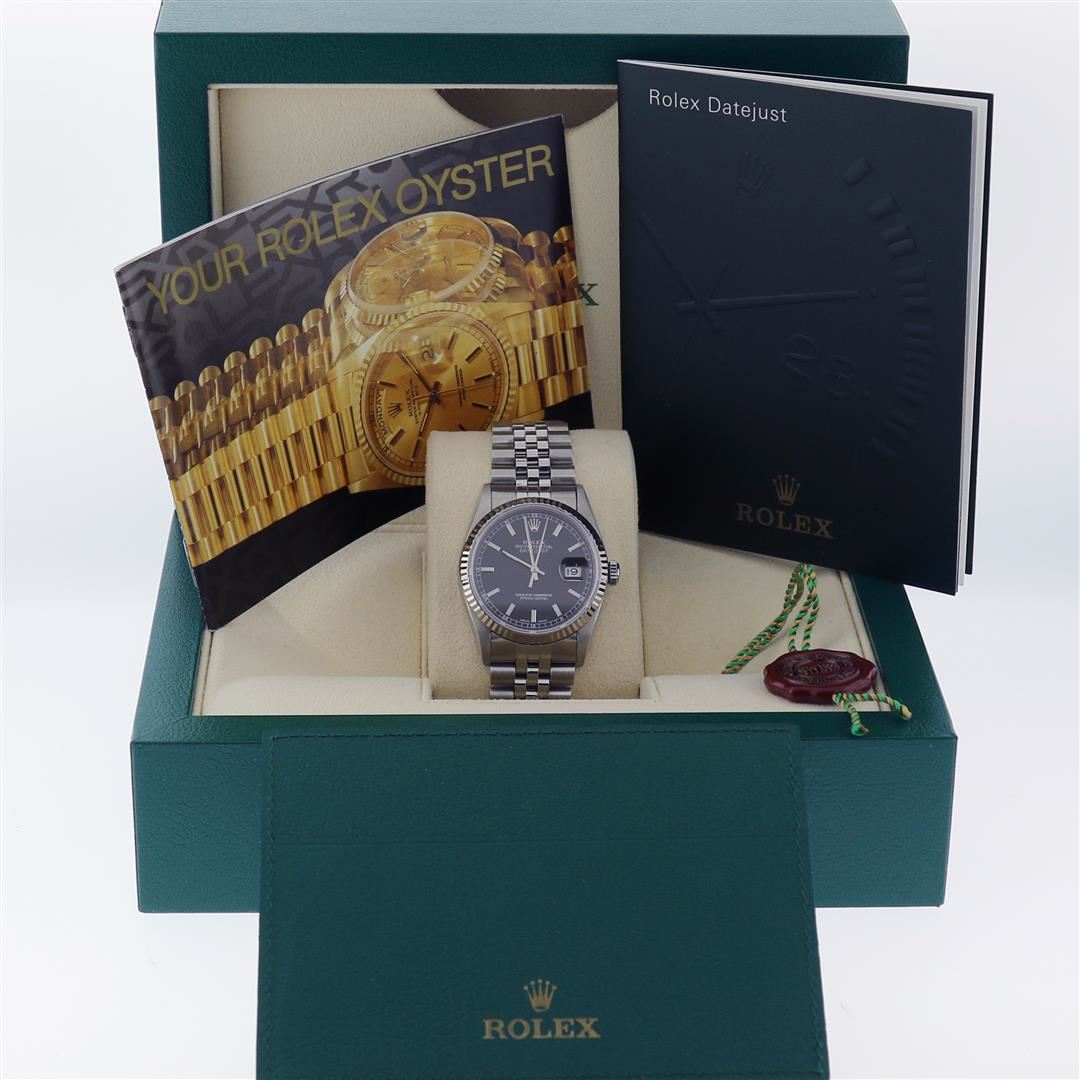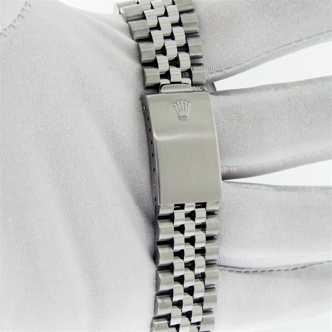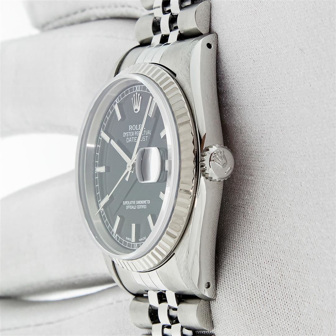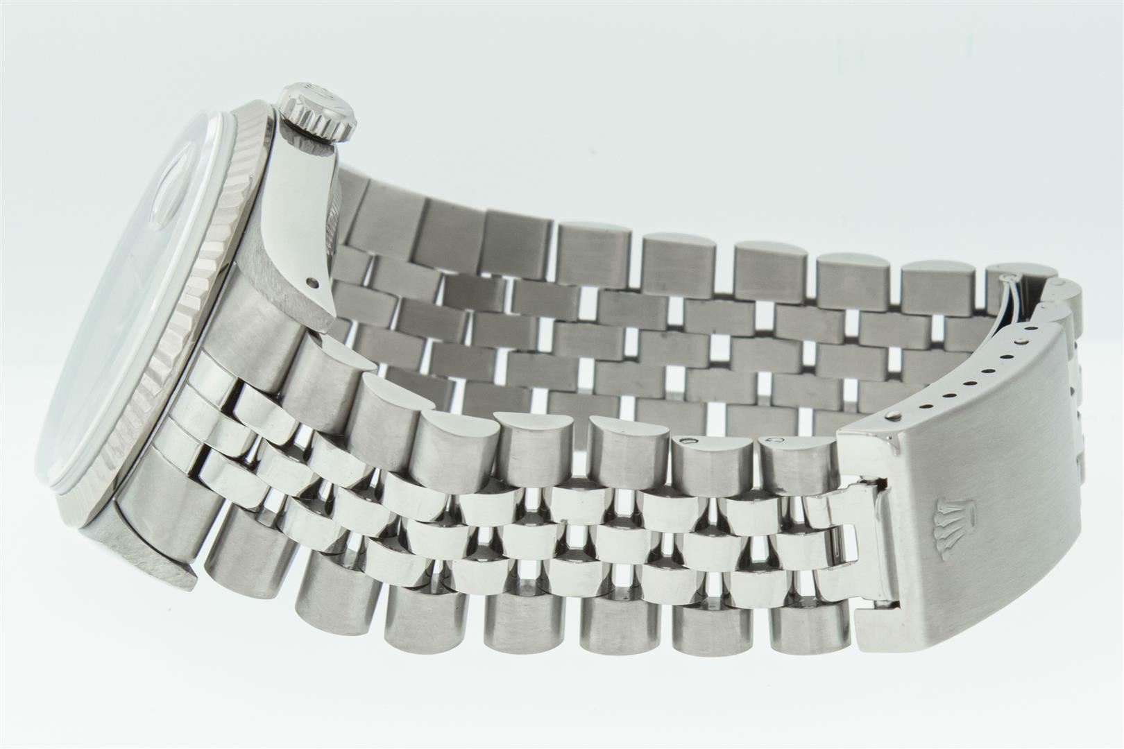 One Men's Pre Owned Stainless Steel Rolex Datejust Polished, Serviced & Electronically Tested, Rolex Stainless Steel Case: 36mm, Rolex Stainless Steel Crown, Rolex Bezel: 14K White Gold Fluted Bezel. Custom Crystal: New Acrylic Cyclops Lens. Rolex Hands: Luminescent Hands. Rolex Movement: Automatic Winding Movement. Rolex Dial: Black Index With Square Roman Track. Date Window: 3 O'Clock Position Date Display, Quickset, Model: Datejust, Condition: G-6 Extra Fine. Rolex Bracelet: Stainless Steel Jubilee Band. Bright Polish & Satin Finish. 7.0 Inch Length, Adjustable. Standard Clasp, With Rolex Logo. This Watch Has Been Serviced Time Tested And Is In Excellent Condition It Is Free Of All Scratches And Dents.