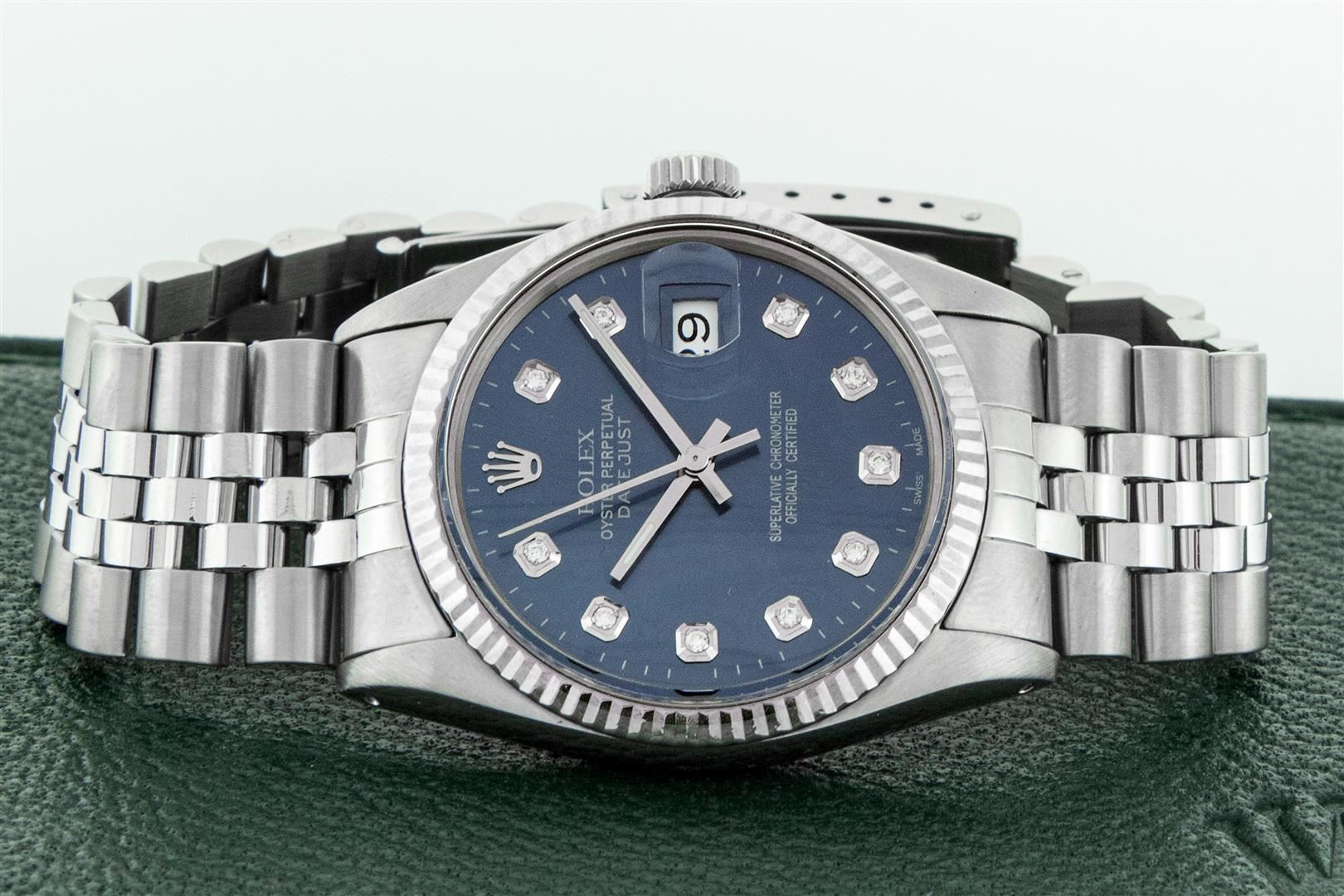 One Men's Pre Owned Stainless Steel Rolex Datejust Polished Bright with Satin Finish, Serviced & Electronically Tested, Rolex Stainless Steel Case: 36mm, Rolex Stainless Steel Crown, Rolex Bezel: White Gold Fluted Bezel. Custom Crystal: New Acrylic Cyclops Lens. Custom Hands: New Luminescent Hands. Rolex Movement: Automatic Winding Movement. Custom Dial: Refinished Blue Diamond Dial With Custom Added Diamond Hour Markers, Diamond Count: 10 Diamond in Dial G To H In Color, SI-VS Clarity. Date Window: 3 O'Clock Position Date Display, Quickset, Model: Datejust, Condition: G-6 Extra Fine. Rolex Bracelet: Stainless Steel Jubilee Band. Bright Polish & Satin Finish. 7.0 Inch Length, Adjustable. Standard Clasp, With Rolex Logo. This Watch Has Been Serviced Time Tested And Is In Excellent Condition It Is Free Of All Scratches And Dents. This Watch Comes With A Rolex Box.