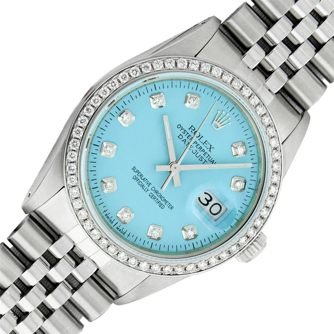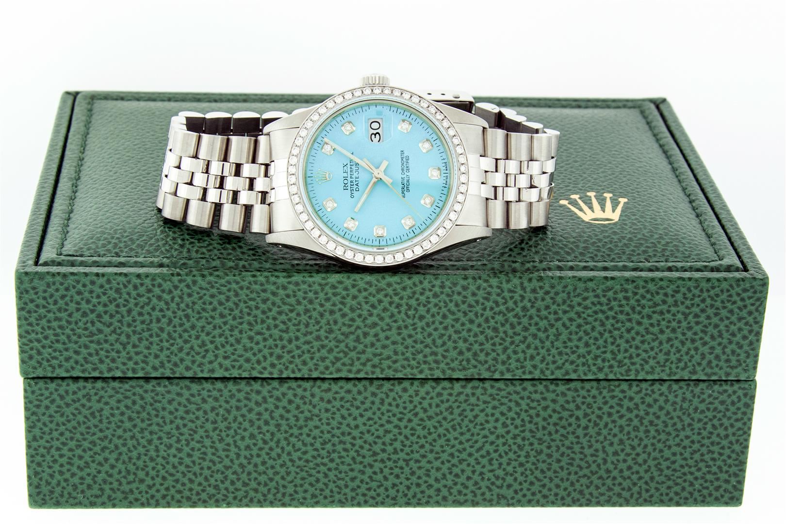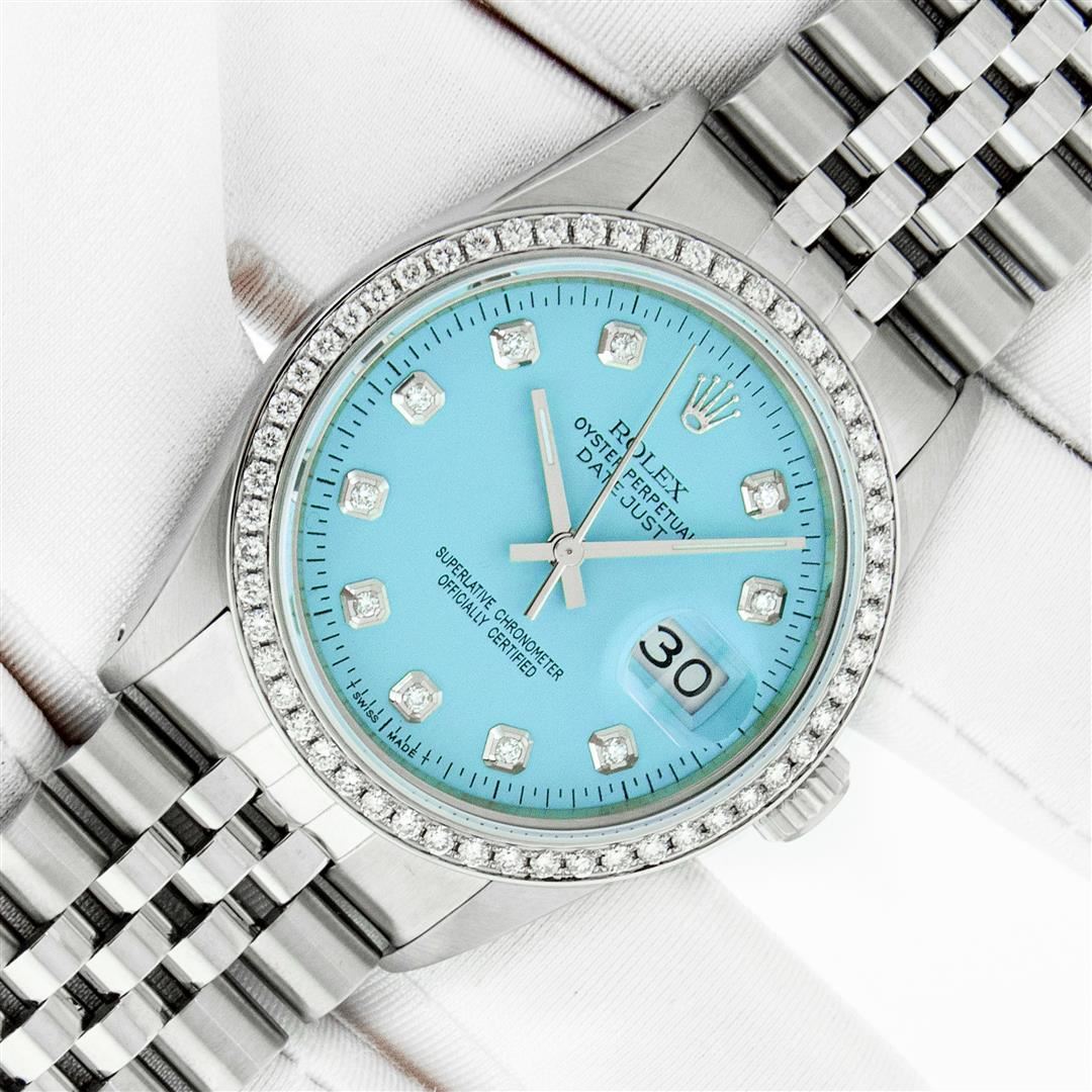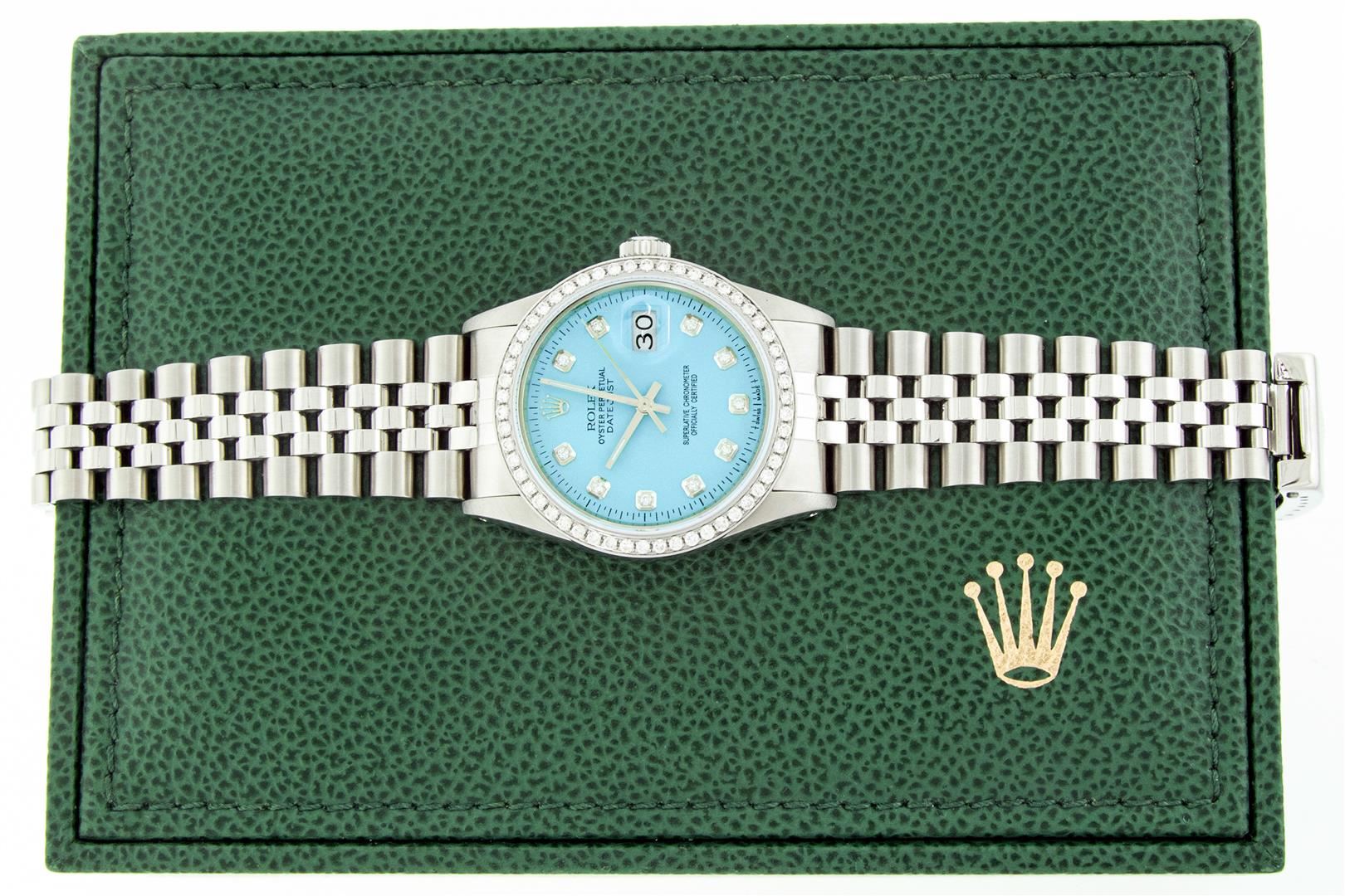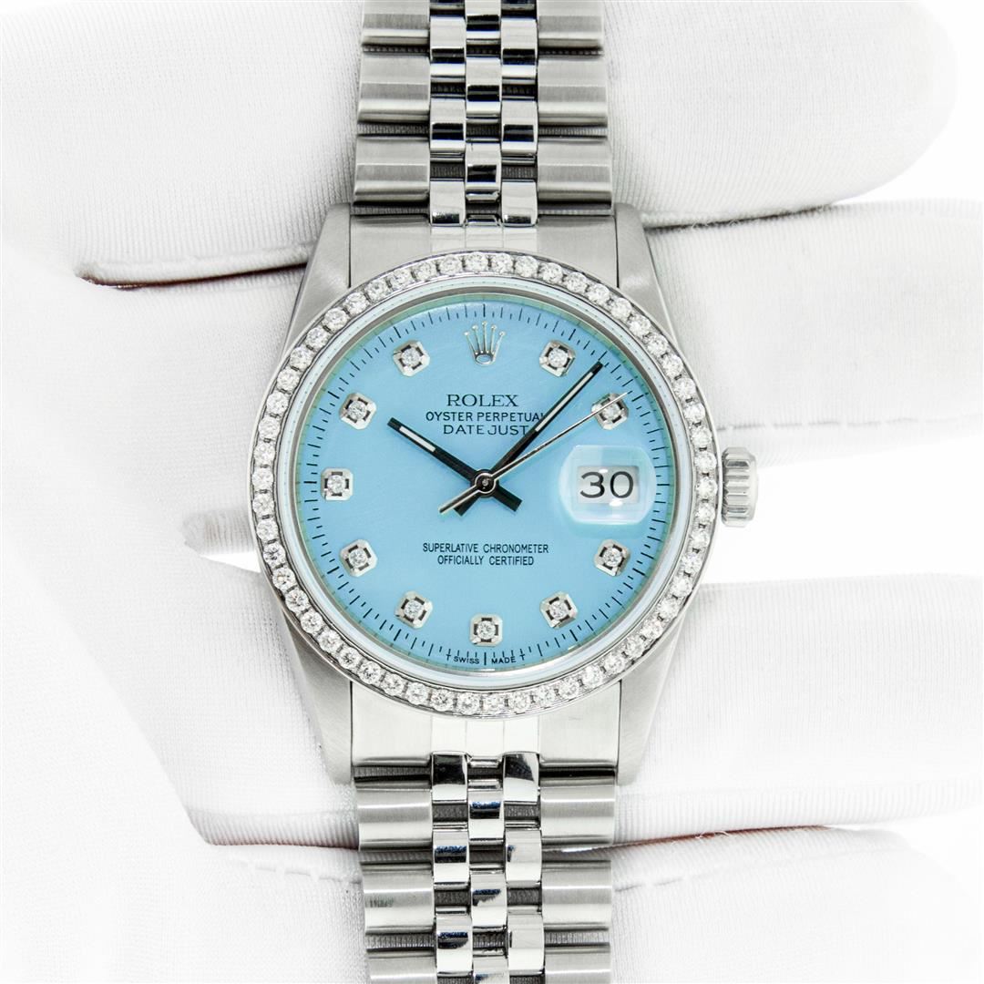 One Men's Rolex Stainless Steel Datejust Polished Bright with Satin Finish, This Watch Has Been Serviced & Electronically Tested, Rolex Stainless Steel Case: 36mm, Rolex Stainless Steel Crown, Custom Bezel: New Stainless Steel Bead-set Diamond Bezel, Diamond Count: 54 Diamonds In Bezel, Clarity: SI-VS, Color: G to H. Custom Crystal: New Sapphire Magnified Date Window. Custom Hands: New Luminescent Hands. Rolex Movement: Automatic Winding Movement. Custom Dial: Refinish To Blue with Added Diamonds, Diamond Count: 10 Diamonds On Dial, Color: G to H, Clarity: VS2-SI1. Date Window: 3 O'clock Position Date Display, Quickset, Model: Datejust. Condition: G-6 Extra Fine. Rolex Bracelet: Stainless Steel Jubilee Band. Bright Polish & Satin Finish. 7.0 Inch Length, Adjustable. Standard Clasp, with Rolex Logo. This Preowned Watch Has Been Serviced Time Tested And Is In Excellent Condition It Is Free Of All Scratches And Dents.