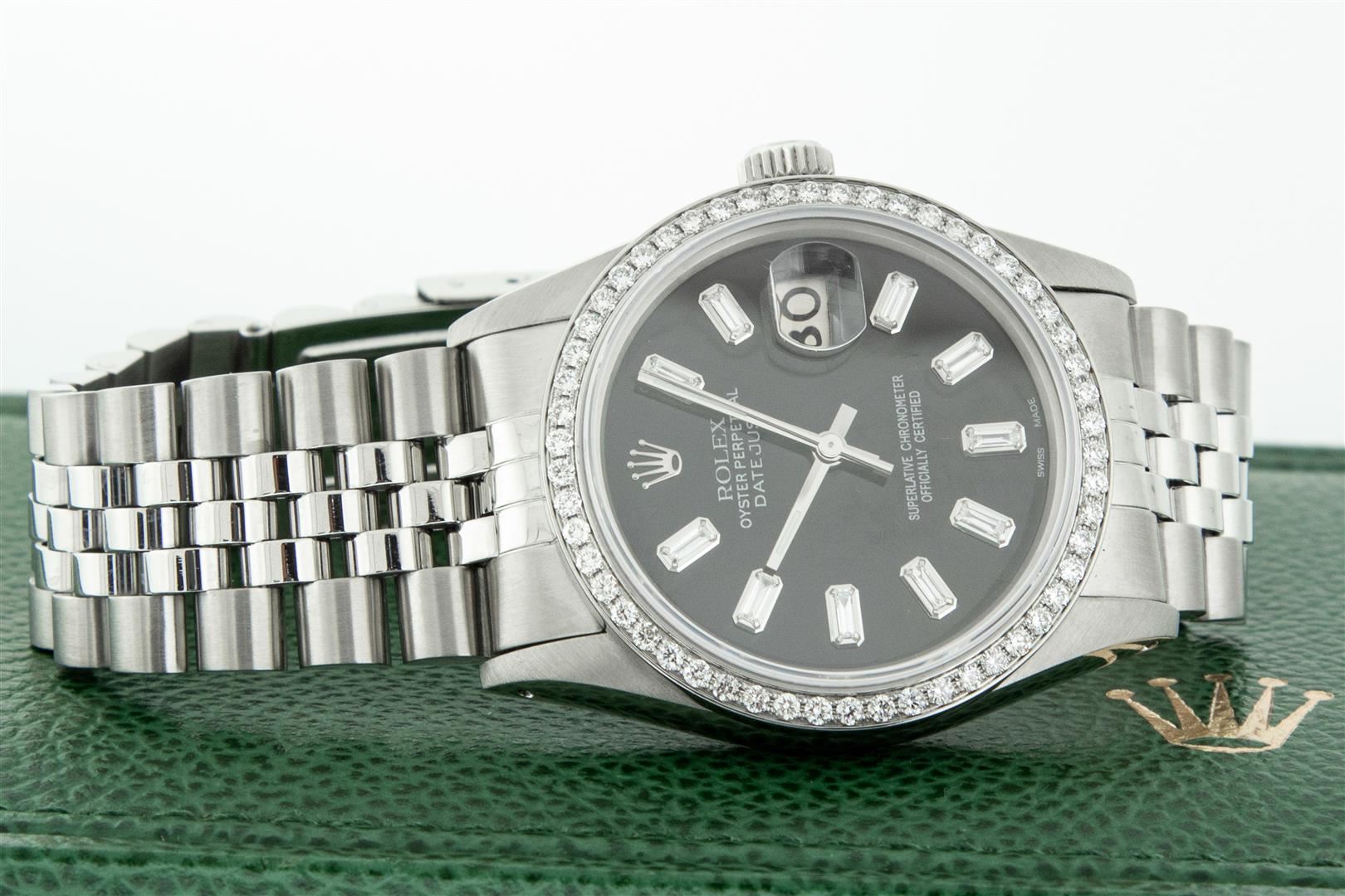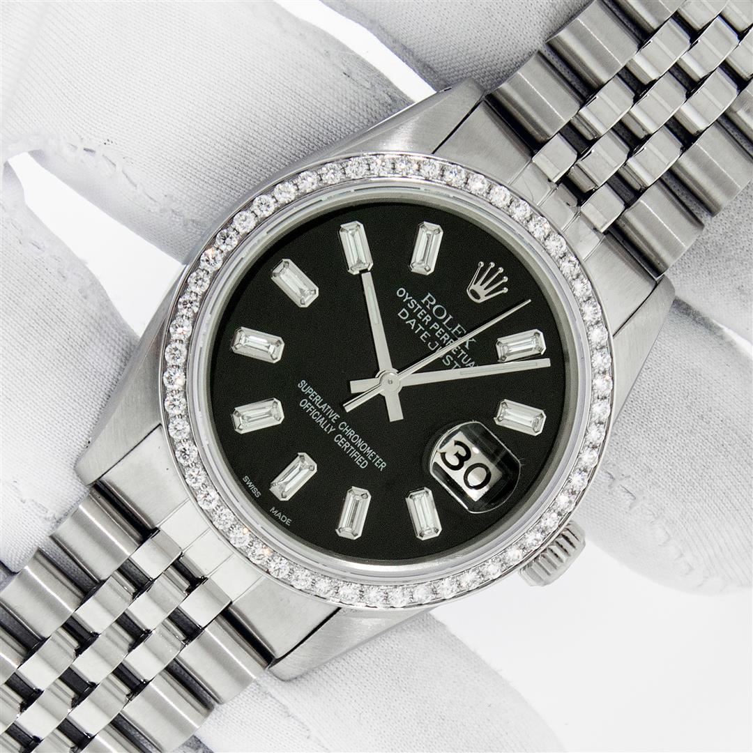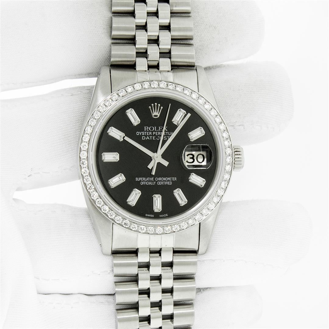 One Men's Rolex Stainless Steel Datejust Polished Bright with Satin Finish, This Watch Has Been Serviced & Electronically Tested, Rolex Stainless Steel Case: 36mm, Rolex Stainless Steel Crown, Custom Bezel: New Stainless Steel Beadset Diamond Bezel, Diamond Count: 54 Diamonds In Bezel, Clarity: SI-VS, Color: G to H. Custom Crystal: New Sapphire with Magnified Date Window. Custom Hands: New Luminescent Hands. Rolex Movement: Automatic Winding Movement. Custom Dial: Refinished To Black with Added Baguettes, Diamond Count: 10 Baguette Diamonds On Dial, Color: G to H, Clarity: VS2-SI1. Date Window: 3 O'Clock Position Date Display, Quickset, Model: Datejust. Condition: G-6 Extra Fine. Rolex Bracelet: Stainless Steel Jubilee Band. Bright Polish & Satin Finish. 7.0 Inch Length, Adjustable. Standard Clasp, with Rolex Logo. This Pre Owned Watch Has Been Serviced Time Tested And Is In Excellent Condition It Is Free Of All Scratches And Dents.