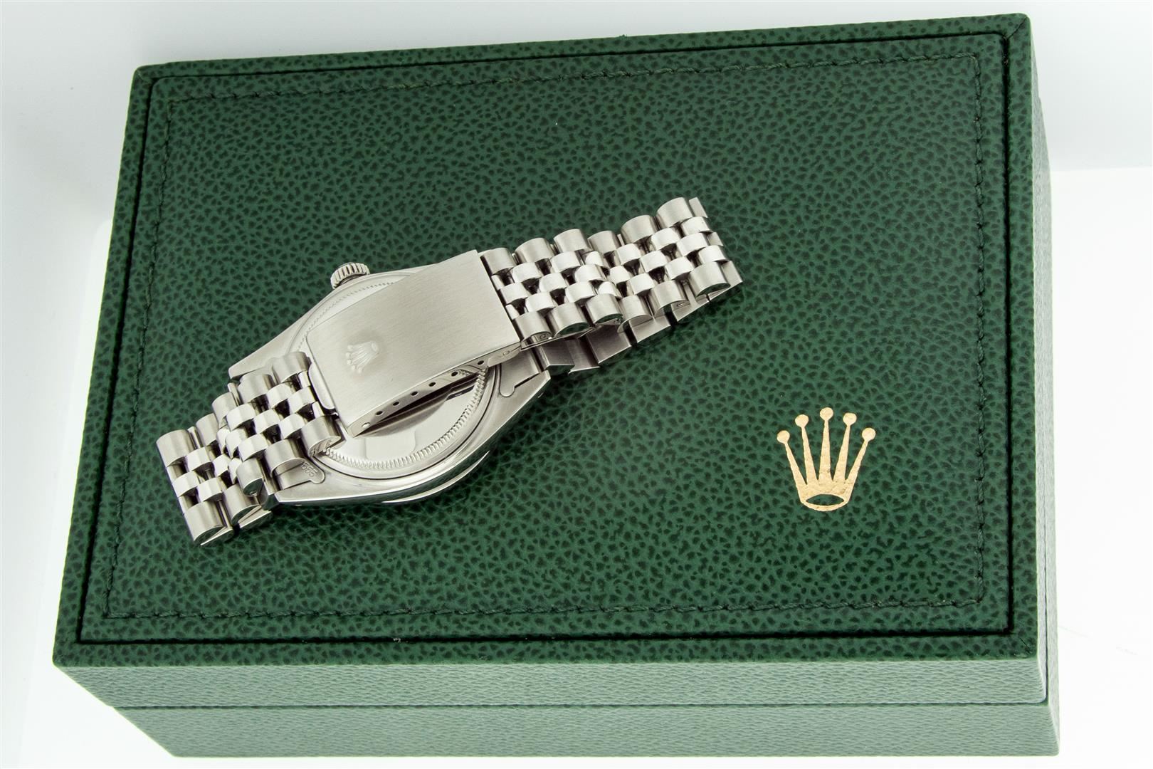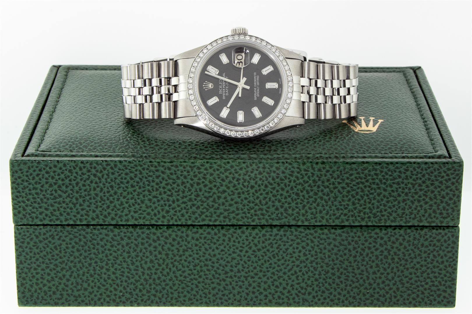 One Men's Rolex Stainless Steel Datejust Polished Bright with Satin Finish, This Watch Has Been Serviced & Electronically Tested, Rolex Stainless Steel Case: 36mm, Rolex Stainless Steel Crown, Custom Bezel: New Stainless Steel Beadset Diamond Bezel, Diamond Count: 54 Diamonds In Bezel, Clarity: SI-VS, Color: G to H. Custom Crystal: New Sapphire with Magnified Date Window. Custom Hands: New Luminescent Hands. Rolex Movement: Automatic Winding Movement. Custom Dial: Refinished To Black with Added Baguettes, Diamond Count: 10 Baguette Diamonds On Dial, Color: G to H, Clarity: VS2-SI1. Date Window: 3 O'Clock Position Date Display, Quickset, Model: Datejust. Condition: G-6 Extra Fine. Rolex Bracelet: Stainless Steel Jubilee Band. Bright Polish & Satin Finish. 7.0 Inch Length, Adjustable. Standard Clasp, with Rolex Logo. This Pre Owned Watch Has Been Serviced Time Tested And Is In Excellent Condition It Is Free Of All Scratches And Dents.