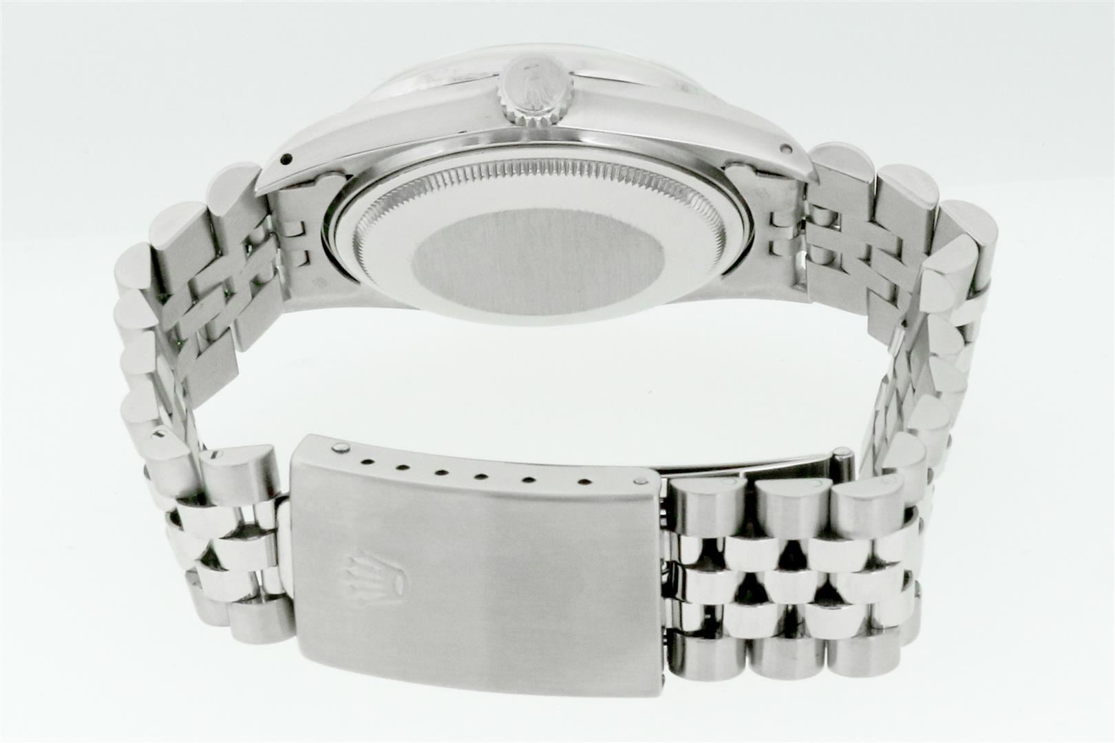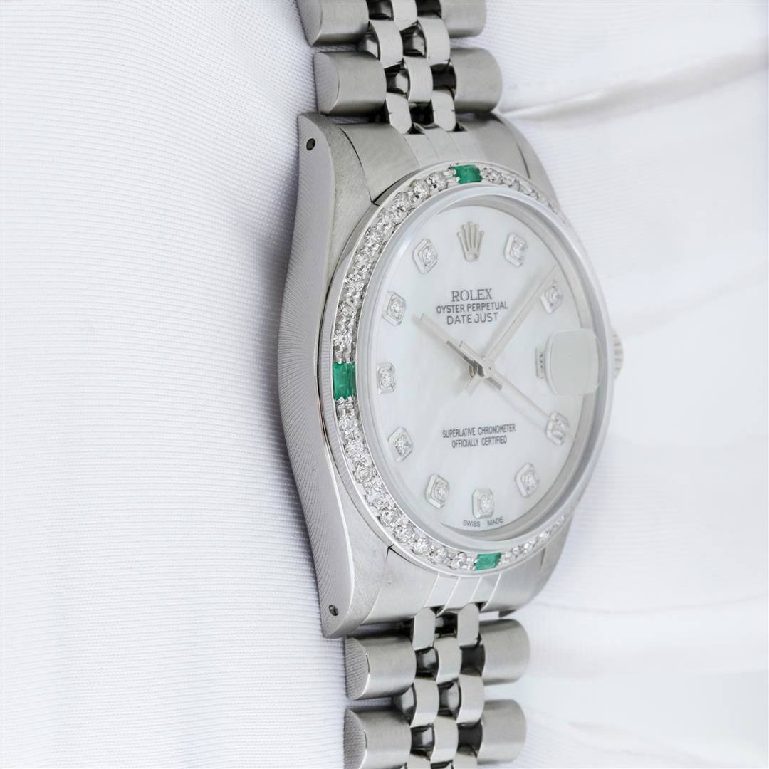 One Men's Rolex Datejust Polished Bright with Satin Finish, This Watch Has Been Serviced & Electronically Tested, Rolex Stainless Steel Case: 36mm, Rolex Stainless Steel Crown, Custom Bezel: New 18K White Gold Emerald Bead-set Diamond Bezel, Diamond + Gem Count: 36 Diamonds + 4 Emeralds, Clarity: SI-VS, Color: G to H. Custom Crystal: New Sapphire with Cyclops Lens. Custom Hands: New Luminescent Hands. Rolex Movement: Automatic Winding Movement. Custom Dial: MOP with Added Diamond Hour Markers, Diamond Count: 10 Diamonds in Dial, Diamond Color: G To H In Color, Clarity: SI-VS. Date Window: 3 O'clock Position Date Display, Quickset, Model: Datejust, Condition: G-6 Extra Fine. Rolex Bracelet: Stainless Steel Jubilee Band. Bracelet: 7.0 Inch Length, Adjustable. Standard Clasp, with Rolex Logo. This Preowned Watch Has Been Serviced Time Tested And Is In Excellent Condition It Is Free Of All Scratches And Dents.
