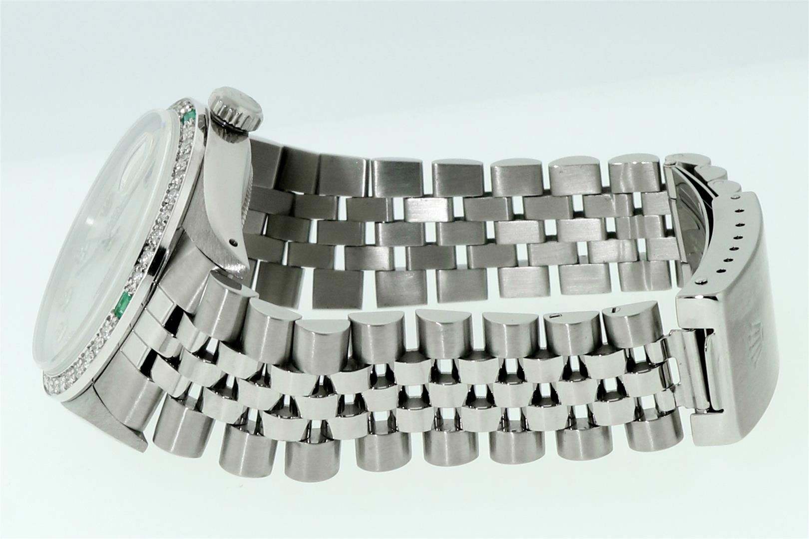 One Men's Rolex Datejust Polished Bright with Satin Finish, This Watch Has Been Serviced & Electronically Tested, Rolex Stainless Steel Case: 36mm, Rolex Stainless Steel Crown, Custom Bezel: New 18K White Gold Emerald Bead-set Diamond Bezel, Diamond + Gem Count: 36 Diamonds + 4 Emeralds, Clarity: SI-VS, Color: G to H. Custom Crystal: New Sapphire with Cyclops Lens. Custom Hands: New Luminescent Hands. Rolex Movement: Automatic Winding Movement. Custom Dial: MOP with Added Diamond Hour Markers, Diamond Count: 10 Diamonds in Dial, Diamond Color: G To H In Color, Clarity: SI-VS. Date Window: 3 O'clock Position Date Display, Quickset, Model: Datejust, Condition: G-6 Extra Fine. Rolex Bracelet: Stainless Steel Jubilee Band. Bracelet: 7.0 Inch Length, Adjustable. Standard Clasp, with Rolex Logo. This Preowned Watch Has Been Serviced Time Tested And Is In Excellent Condition It Is Free Of All Scratches And Dents.