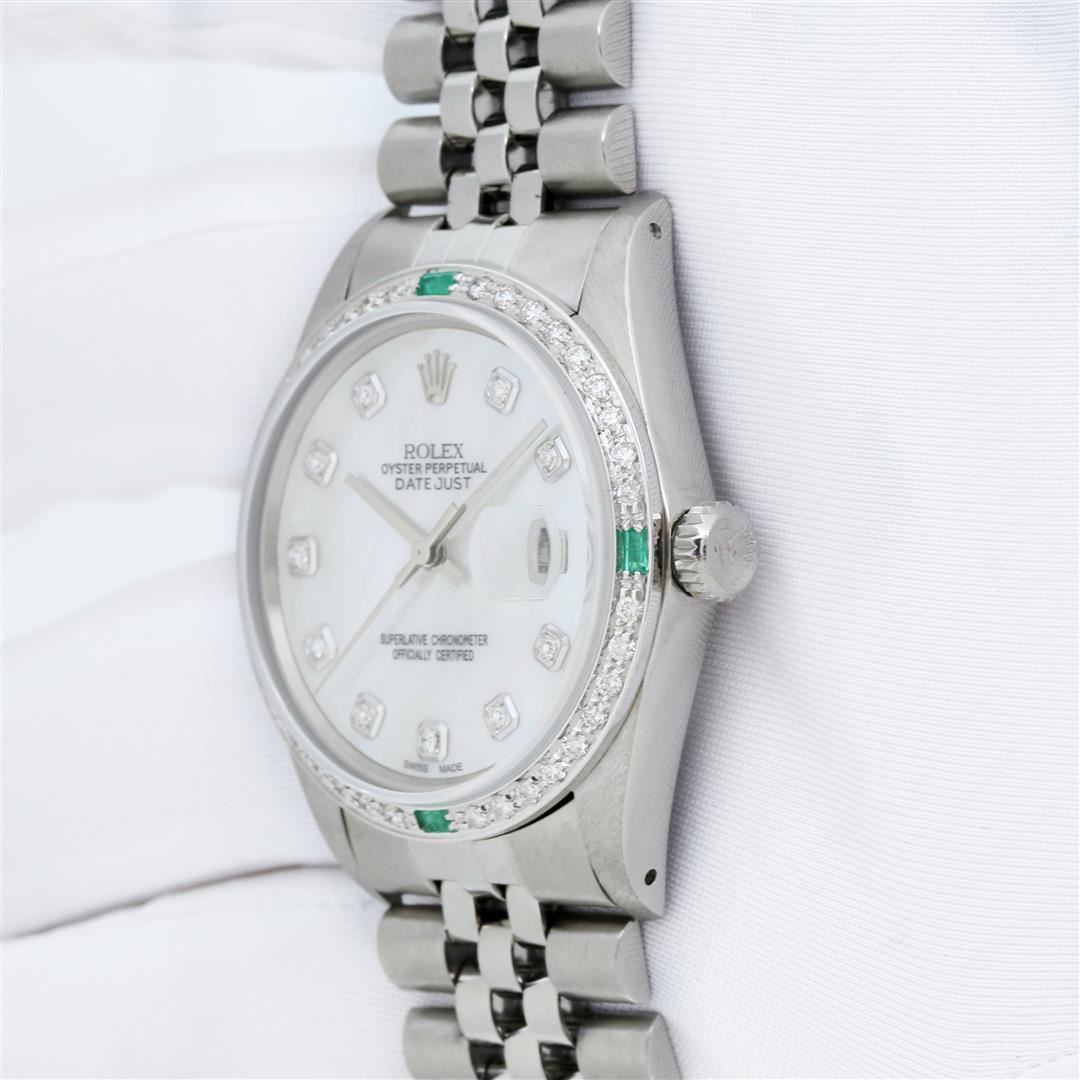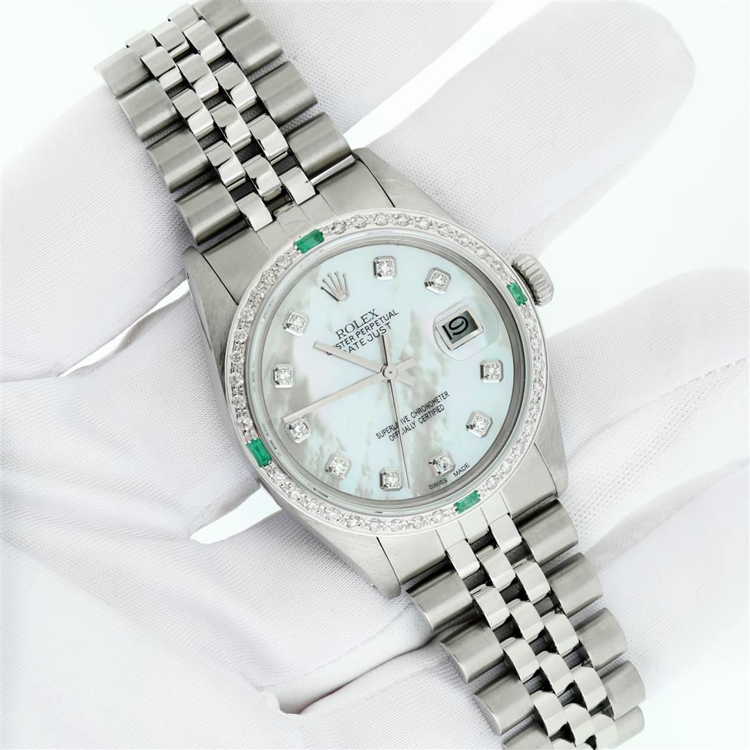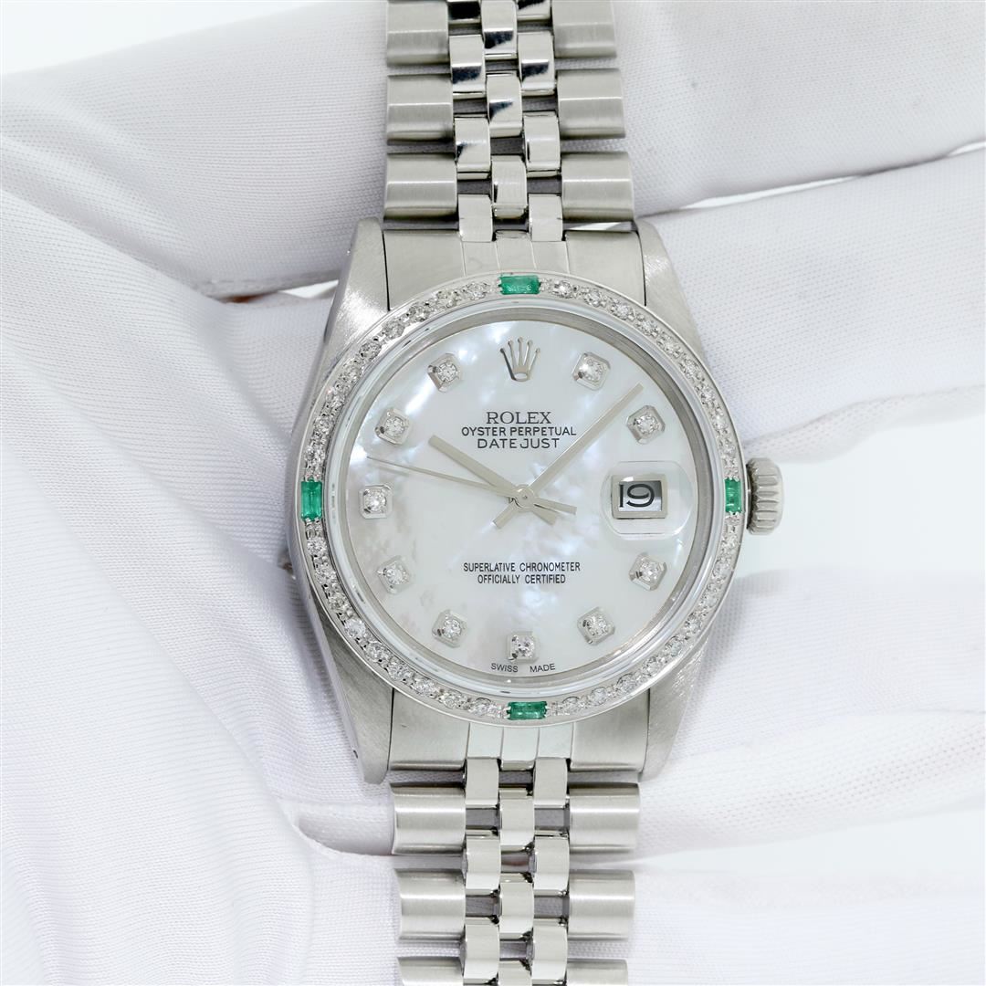 One Men's Rolex Datejust Polished Bright with Satin Finish, This Watch Has Been Serviced & Electronically Tested, Rolex Stainless Steel Case: 36mm, Rolex Stainless Steel Crown, Custom Bezel: New 18K White Gold Emerald Bead-set Diamond Bezel, Diamond + Gem Count: 36 Diamonds + 4 Emeralds, Clarity: SI-VS, Color: G to H. Custom Crystal: New Sapphire with Cyclops Lens. Custom Hands: New Luminescent Hands. Rolex Movement: Automatic Winding Movement. Custom Dial: MOP with Added Diamond Hour Markers, Diamond Count: 10 Diamonds in Dial, Diamond Color: G To H In Color, Clarity: SI-VS. Date Window: 3 O'clock Position Date Display, Quickset, Model: Datejust, Condition: G-6 Extra Fine. Rolex Bracelet: Stainless Steel Jubilee Band. Bracelet: 7.0 Inch Length, Adjustable. Standard Clasp, with Rolex Logo. This Preowned Watch Has Been Serviced Time Tested And Is In Excellent Condition It Is Free Of All Scratches And Dents.