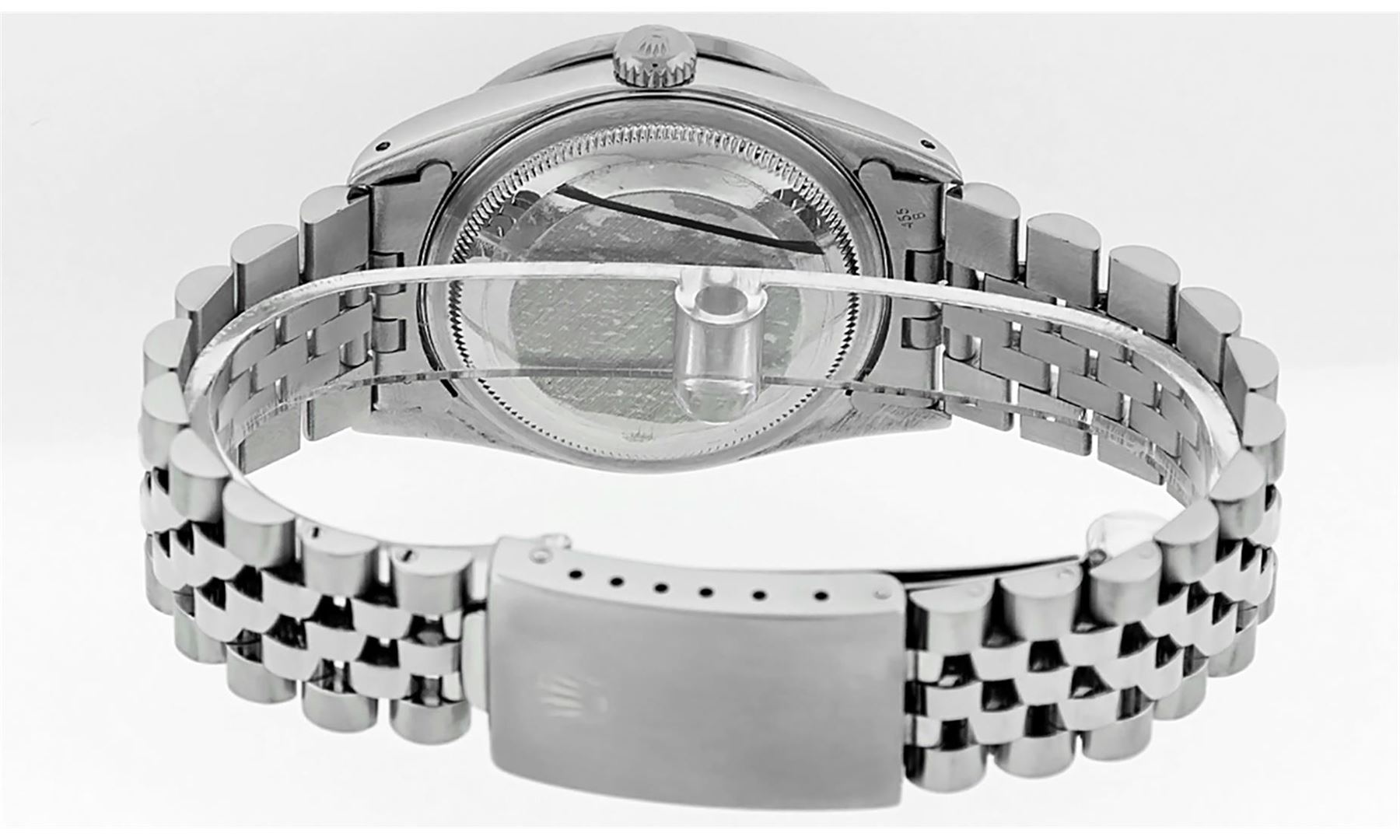 One Men's Rolex Datejust Polished Bright with Satin Finish, Serviced & Electronically Tested, Stainless Steel Case: 36mm, Custom Diamonds On Lugs: 28 Diamonds On Lugs, Color: G to H, Clarity: SI-VS. Stainless Steel Crown, Custom Bezel: 18K White Gold Pyramid Diamond Bezel, Diamond Count: 24 Diamonds On Bezel, Total Weight .75 Carat, Clarity: SI-VS, Color: G to H. Custom Crystal: New Synthetic Sapphire Cyclops Lens. Custom Hands: New Solid Hands. Movement: Automatic Winding Movement Caliber 3035. Custom Dial: Silver Diamond Dial, Diamond Count: 10 Diamonds In Dial, Diamond Color: G To H In Color, Clarity: SI-VS. Date Window: 3 O'clock Position Date Display, Quickset, Model: Datejust Condition: G-6 Extra Fine. Bracelet: Stainless Steel Jubilee Band. Bright Polish & Satin Finish. 7.0 Inch Length, Adjustable. Standard Clasp, With Rolex Logo. This Watch Has Been Serviced And Polished And Its Free Of All Dents And Scratches.