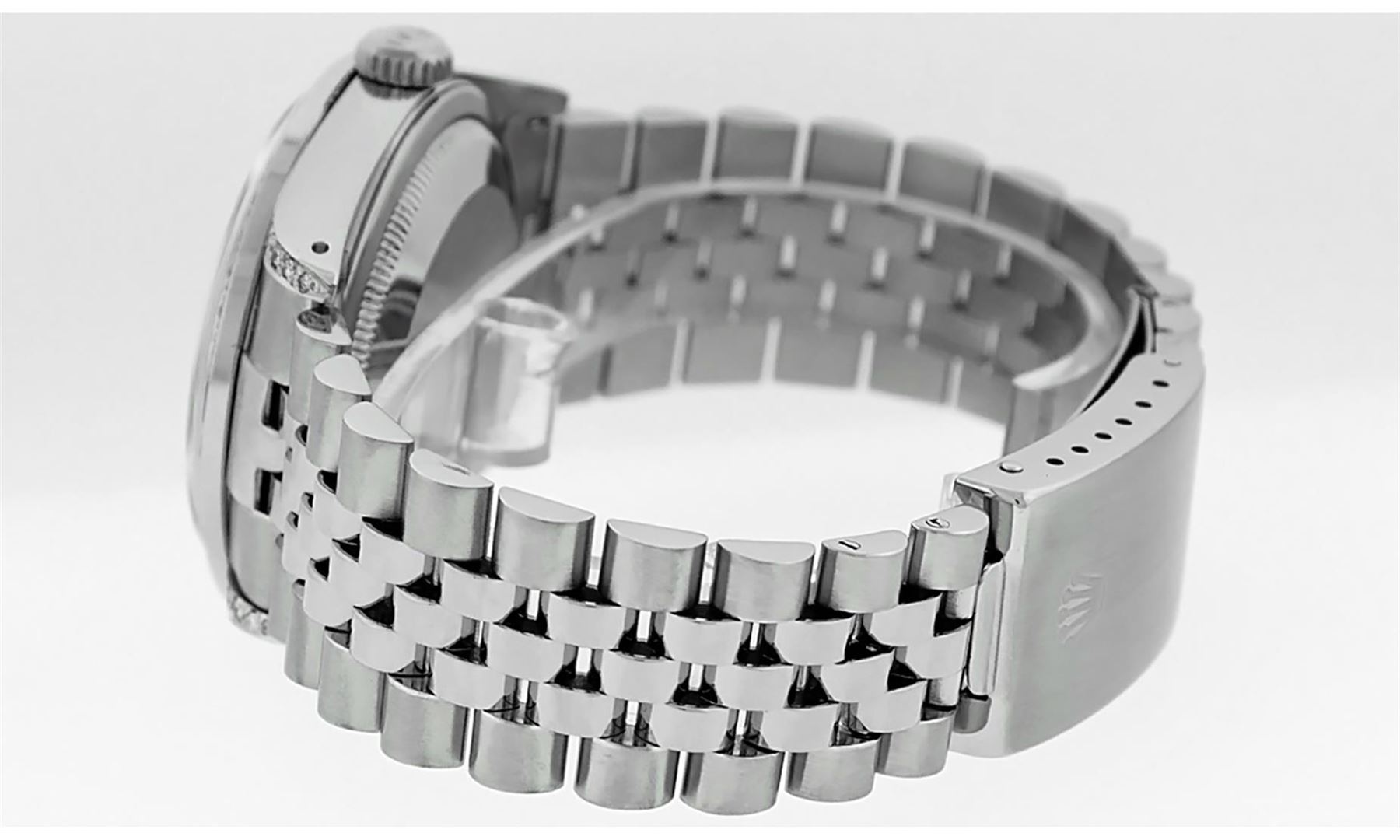 One Men's Rolex Datejust Polished Bright with Satin Finish, Serviced & Electronically Tested, Stainless Steel Case: 36mm, Custom Diamonds On Lugs: 28 Diamonds On Lugs, Color: G to H, Clarity: SI-VS. Stainless Steel Crown, Custom Bezel: 18K White Gold Pyramid Diamond Bezel, Diamond Count: 24 Diamonds On Bezel, Total Weight .75 Carat, Clarity: SI-VS, Color: G to H. Custom Crystal: New Synthetic Sapphire Cyclops Lens. Custom Hands: New Solid Hands. Movement: Automatic Winding Movement Caliber 3035. Custom Dial: Silver Diamond Dial, Diamond Count: 10 Diamonds In Dial, Diamond Color: G To H In Color, Clarity: SI-VS. Date Window: 3 O'clock Position Date Display, Quickset, Model: Datejust Condition: G-6 Extra Fine. Bracelet: Stainless Steel Jubilee Band. Bright Polish & Satin Finish. 7.0 Inch Length, Adjustable. Standard Clasp, With Rolex Logo. This Watch Has Been Serviced And Polished And Its Free Of All Dents And Scratches.