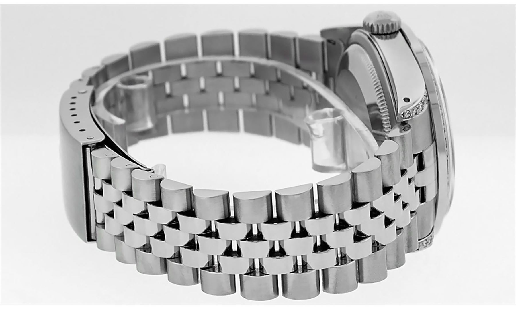 One Men's Rolex Datejust Polished Bright with Satin Finish, Serviced & Electronically Tested, Stainless Steel Case: 36mm, Custom Diamonds On Lugs: 28 Diamonds On Lugs, Color: G to H, Clarity: SI-VS. Stainless Steel Crown, Custom Bezel: 18K White Gold Pyramid Diamond Bezel, Diamond Count: 24 Diamonds On Bezel, Total Weight .75 Carat, Clarity: SI-VS, Color: G to H. Custom Crystal: New Synthetic Sapphire Cyclops Lens. Custom Hands: New Solid Hands. Movement: Automatic Winding Movement Caliber 3035. Custom Dial: Silver Diamond Dial, Diamond Count: 10 Diamonds In Dial, Diamond Color: G To H In Color, Clarity: SI-VS. Date Window: 3 O'clock Position Date Display, Quickset, Model: Datejust Condition: G-6 Extra Fine. Bracelet: Stainless Steel Jubilee Band. Bright Polish & Satin Finish. 7.0 Inch Length, Adjustable. Standard Clasp, With Rolex Logo. This Watch Has Been Serviced And Polished And Its Free Of All Dents And Scratches.