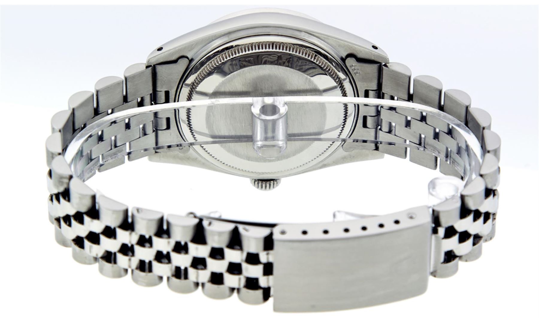One Mens Rolex Datejust Polished Bright with Satin Finish, Serviced & Electronically Tested, Stainless Steel Case: 36mm, Custom Diamond Lugs: 28 Diamonds In Lugs, Color: G to H, Clarity: SI-VS. Stainless Steel Crown, Custom Bezel: 18K White Gold Diamond + Ruby Beadset, Diamond Count: 36 Diamonds + 4 Rubies, Total Weight 1.00 Carat, Clarity: SI-VS, Color: G to H. Custom Crystal: New Synthetic Sapphire Cyclops Lens. Custom Hands: New Luminescent Hands. Movement: Automatic Winding Movement Caliber 3035. Custom Dial: White Diamond Dial With Sqaure Roman Track, Diamond Color: G To H In Color, Clarity: SI-VS. Date Window: 3 O'Clock Position Date Display, Quickset, Model: Datejust Condition: G-6 Extra Fine. Bracelet: Stainless Steel Jubilee Band. Bright Polish & Satin Finish. 7.0 Inch Length, Adjustable. Standard Clasp, With Rolex Logo. This Watch Has Been Serviced And Polished And Its Free Of All Dents And Scratches.