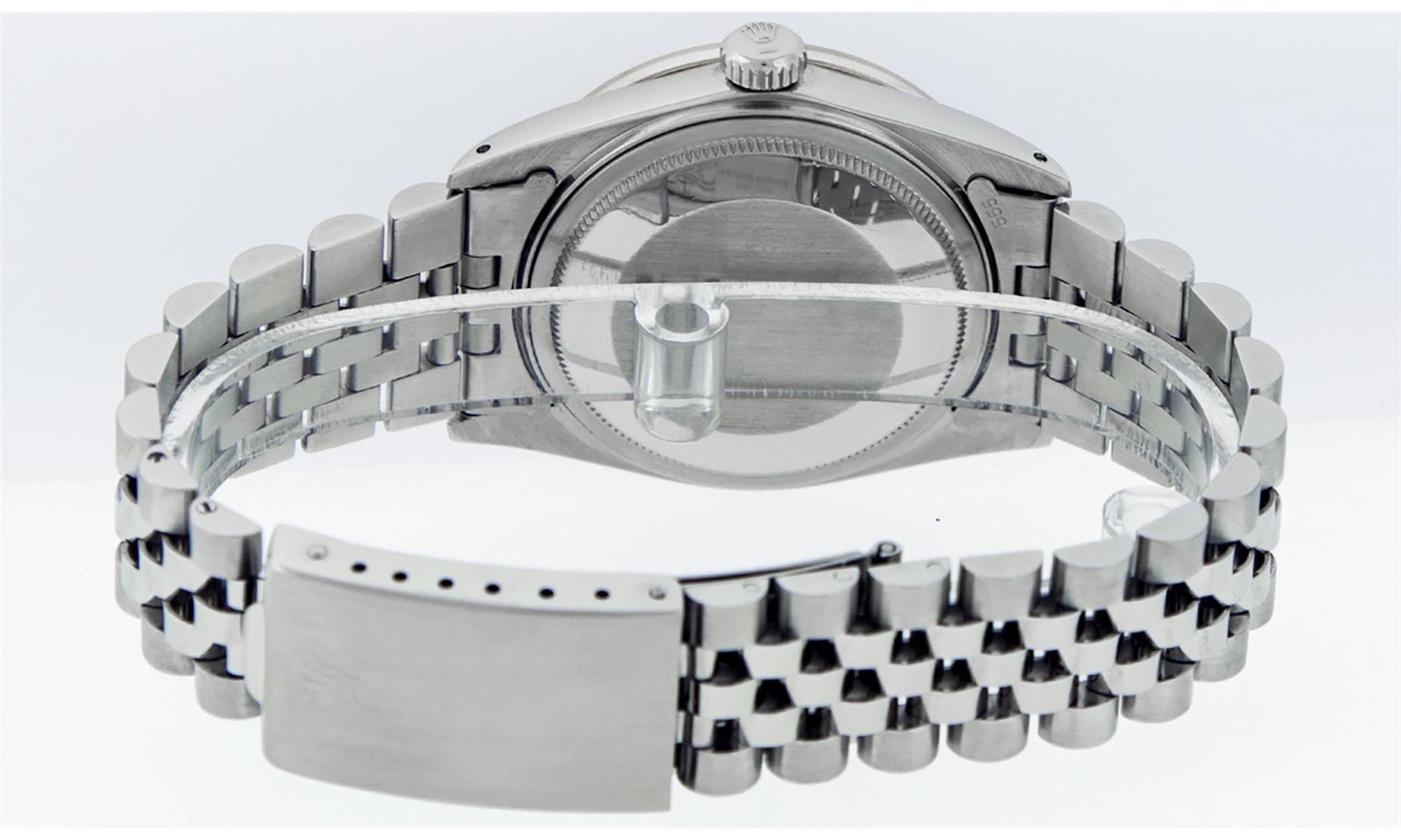One Men's Rolex Datejust Polished Bright with Satin Finish, Serviced & Electronically Tested, Stainless Steel Case: 36mm, Custom Diamonds On Lugs: 28 Diamonds On Lugs, Color: G to H, Clarity: SI-VS. Stainless Steel Crown, Custom Bezel: 18K White Gold Diamond + Sapphire Beadset, Diamond Count: 36 Diamonds + 4 Sapphires, Total Weight 1.00 Carat, Clarity: SI-VS, Color: G to H. Custom Crystal: New Synthetic Sapphire Cyclops Lens. Custom Hands: New Luminescent Hands. Movement: Automatic Winding Movement Caliber 3035. Custom Dial: Mother Of Pearl String Diamond Dial, Diamond Count: 58 Diamonds In Dial, Diamond Color: G To H In Color, Clarity: SI-VS. Date Window: 3 O'clock Position Date Display, Quickset, Model: Datejust Condition: G-6 Extra Fine. Bracelet: Stainless Steel Jubilee Band. Bright Polish & Satin Finish. 7.0 Inch Length, Adjustable. Standard Clasp, With Rolex Logo. This Watch Has Been Serviced And Polished And Its Free Of All Dents And Scratches.