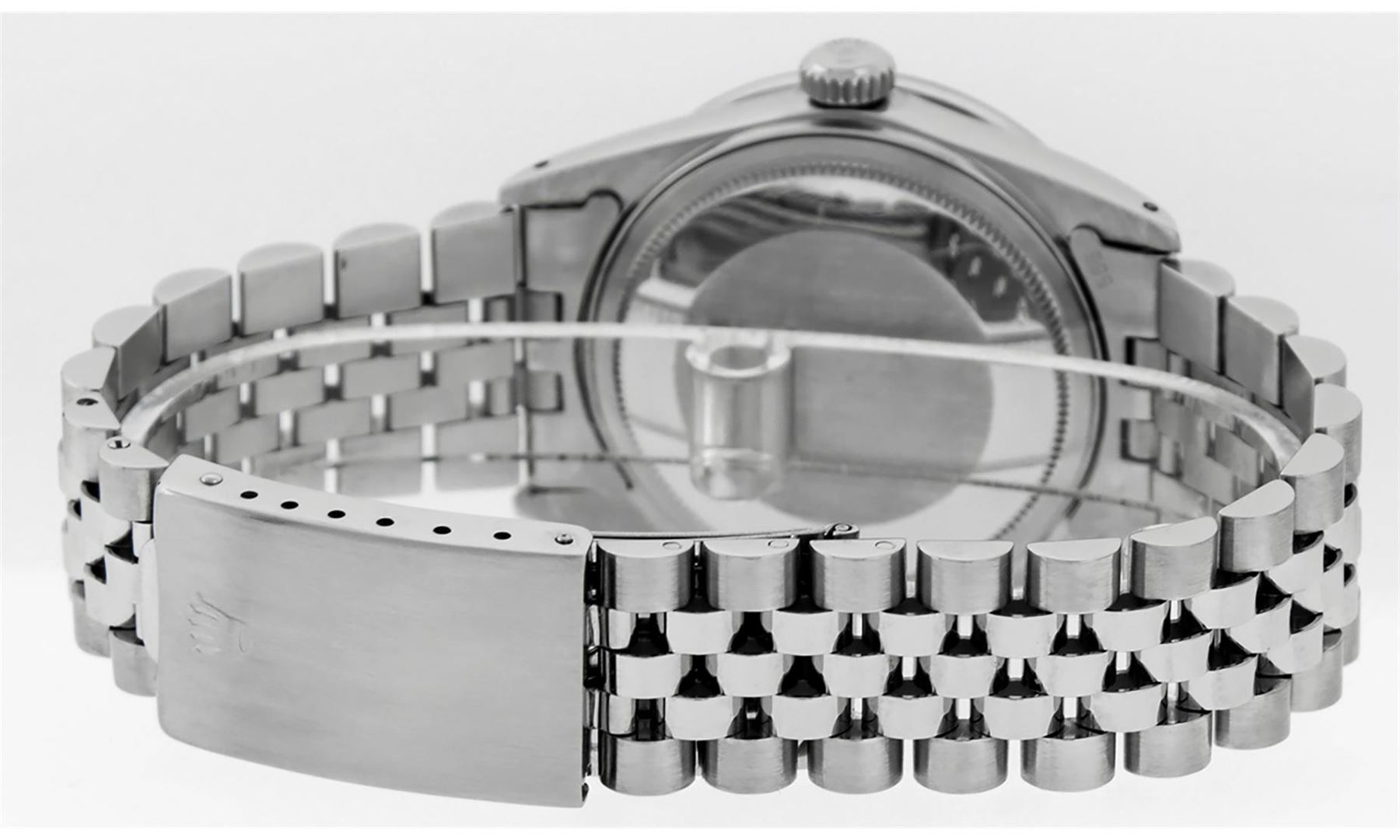 One Men's Rolex Datejust Polished Bright with Satin Finish, Serviced & Electronically Tested, Stainless Steel Case: 36mm, Custom Diamonds On Lugs: 28 Diamonds On Lugs, Color: G to H, Clarity: SI-VS. Stainless Steel Crown, Custom Bezel: 18K White Gold Diamond + Sapphire Beadset, Diamond Count: 36 Diamonds + 4 Sapphires, Total Weight 1.00 Carat, Clarity: SI-VS, Color: G to H. Custom Crystal: New Synthetic Sapphire Cyclops Lens. Custom Hands: New Luminescent Hands. Movement: Automatic Winding Movement Caliber 3035. Custom Dial: Mother Of Pearl String Diamond Dial, Diamond Count: 58 Diamonds In Dial, Diamond Color: G To H In Color, Clarity: SI-VS. Date Window: 3 O'clock Position Date Display, Quickset, Model: Datejust Condition: G-6 Extra Fine. Bracelet: Stainless Steel Jubilee Band. Bright Polish & Satin Finish. 7.0 Inch Length, Adjustable. Standard Clasp, With Rolex Logo. This Watch Has Been Serviced And Polished And Its Free Of All Dents And Scratches.