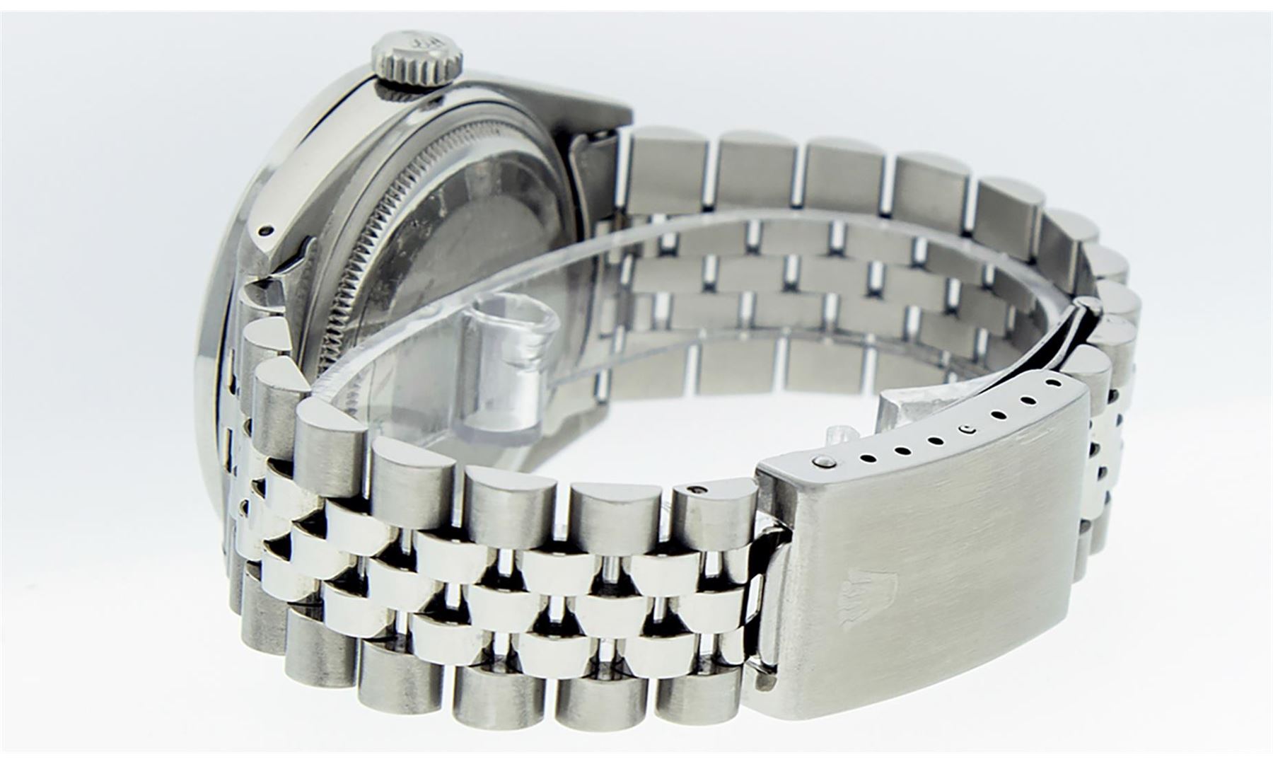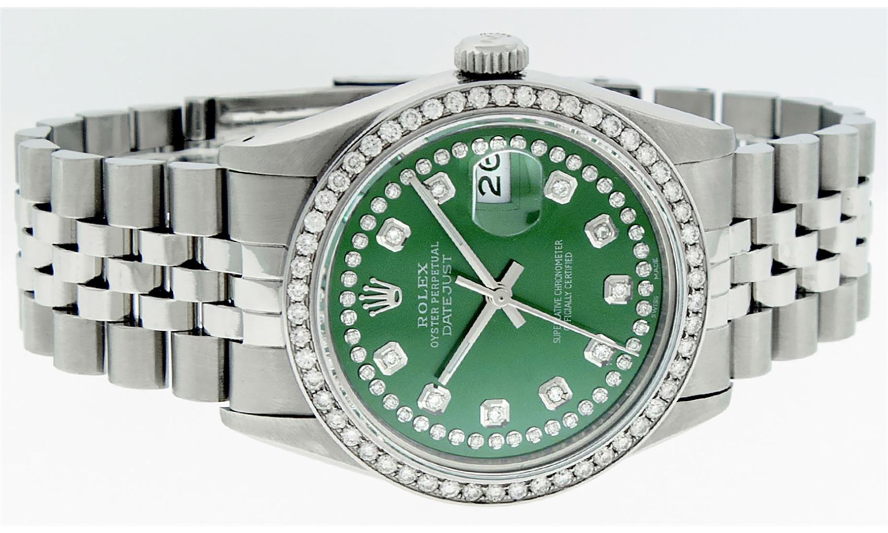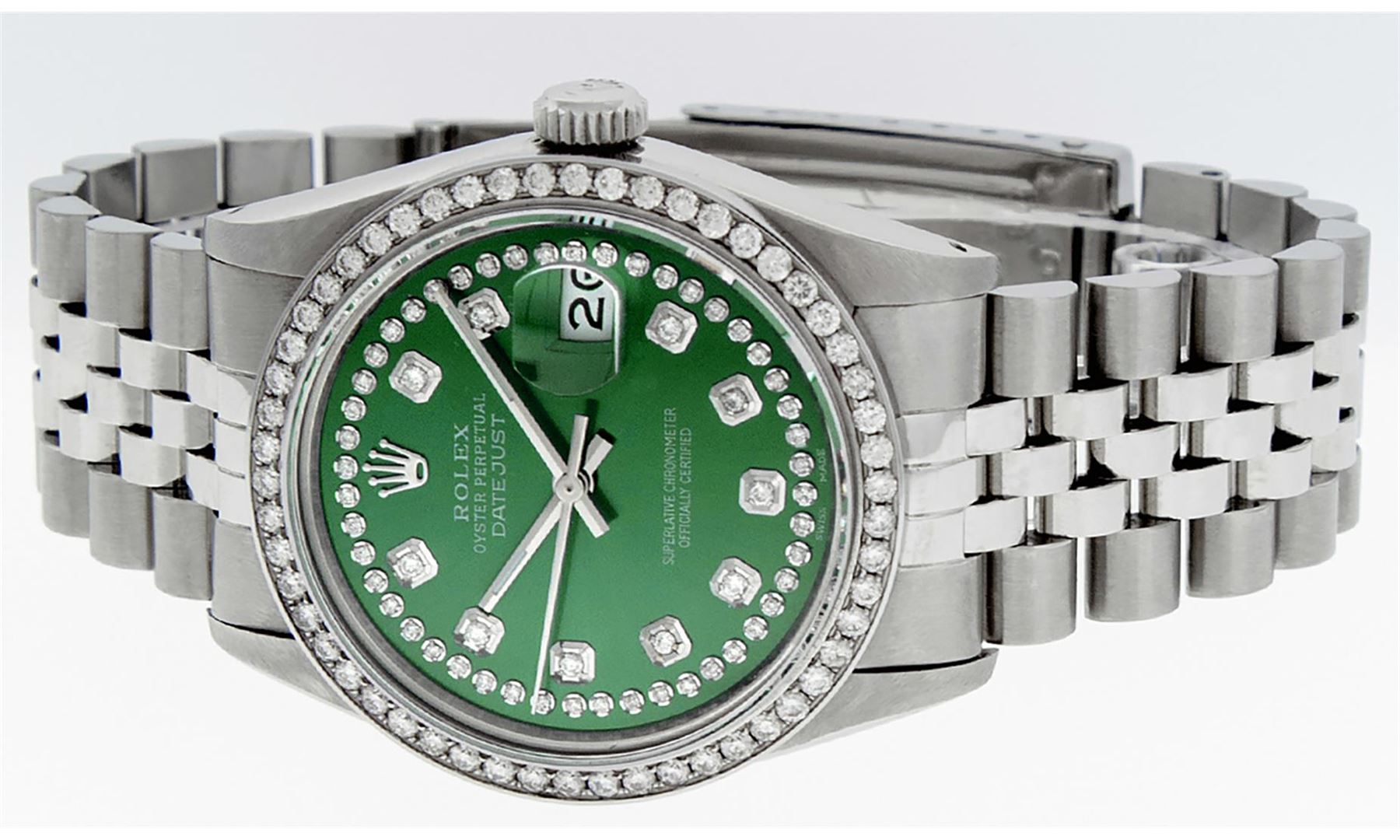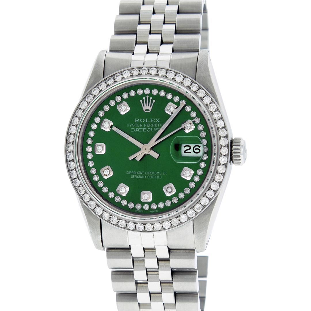 One Men's Rolex Stainless Steel Datejust Polished Bright with Satin Finish, This Watch Has Been Serviced & Electronically Tested, Stainless Steel Case: 36mm, Stainless Steel Crown, Custom Bezel: New Stainless Steel Bead-set Diamond Bezel, Diamond Count: 54 Diamonds, Total Weight 1.00 Carat, Clarity: SI-VS, Color: G to H. Custom Crystal: New Synthetic Sapphire Cyclops Lens. Custom Hands: New Luminescent Hands. Movement: Automatic Winding Movement.. Custom Dial: Green String Diamond Dial, Diamond Count: 58 Diamonds In Dial, Color: G to H, Clarity: VS2-SI1. Date Window: 3 O'clock Position Date Display, Quick-Set, Model: Datejust. Condition: G-6 Extra Fine. Bracelet: Stainless Steel Jubilee Band. Bright Polish & Satin Finish. 7.0 Inch Length, Adjustable. Standard Clasp, With Rolex Logo. This Watch Has Been Serviced Time Tested And Is In Excellent Condition It Is Free Of All Scratches And Dents.
