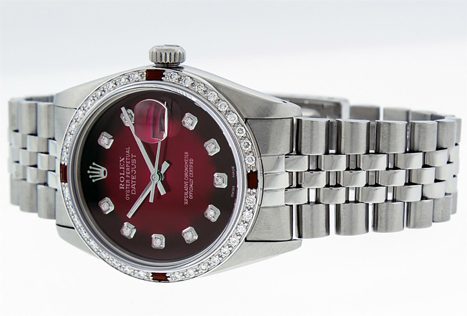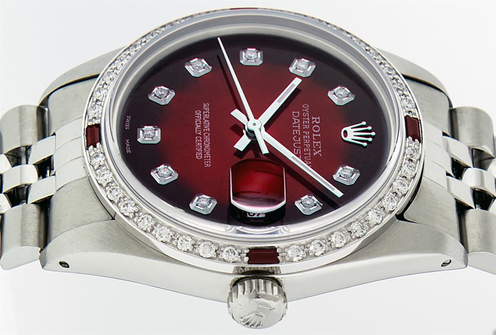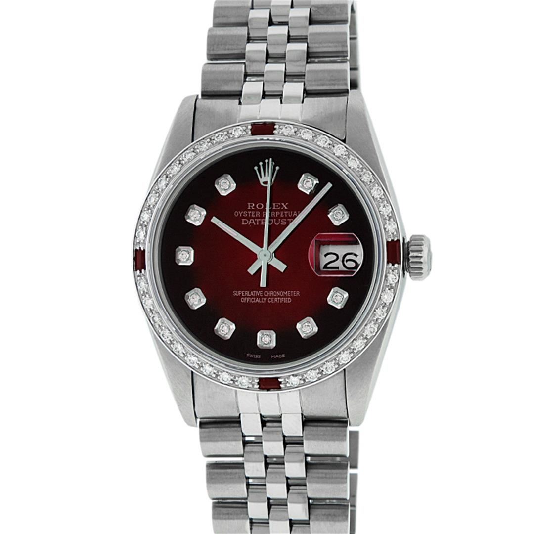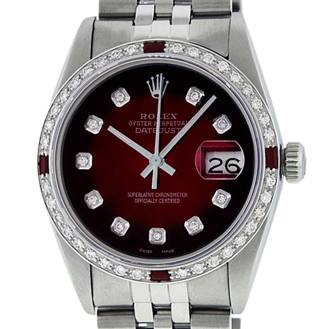 One Men's Stainless Steel Rolex Datejust Polished, Serviced & Electronically Tested, Stainless Steel Case: 36mm, Stainless Steel Crown, Custom Bezel: New 18K White Gold Ruby Beadset Diamond Bezel, Diamond + Gem Count: 36 Diamonds + 4 Rubies Total Weight 1.00 Carat, Clarity: SI-VS, Color: G to H. Custom Crystal: New Synthetic Sapphire Cyclops Lens. Custom Hands: New Luminescent Hands. Movement: Automatic Winding Movement. Custom Dial: Red Vignette With Diamond Hour Markers, 10 Diamond Dial G To H In Color, Clarity: SI-VS. Date Window: 3 O'clock Position Date Display, Quickset, Model: Datejust. Condition: G-6 Extra Fine. Bracelet: Stainless Steel Jubilee. Bright Polish & Satin Finish. 7.0 Inch Length, Adjustable. Standard Clasp, With Rolex Logo. This Watch Has Been Serviced Time Tested And Is In Excellent Condition It Is Free Of All Scratches And Dents.