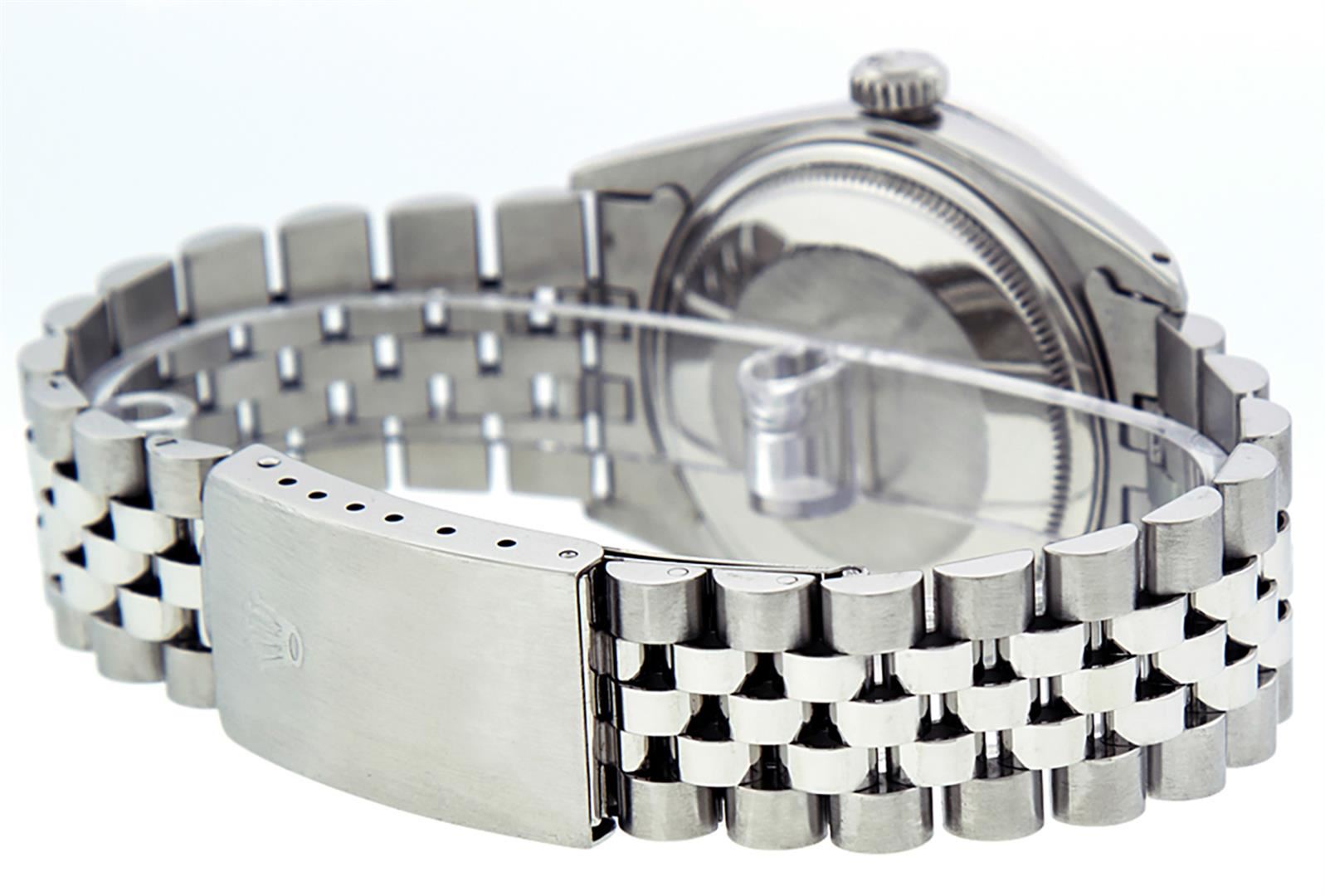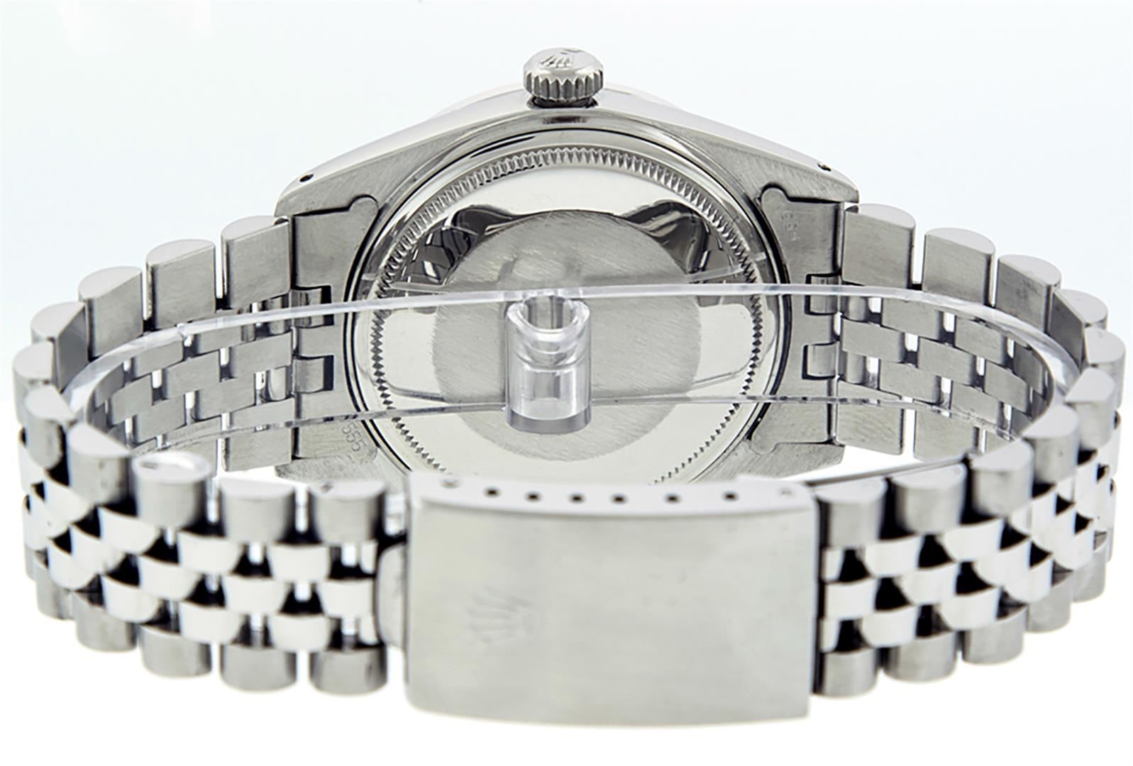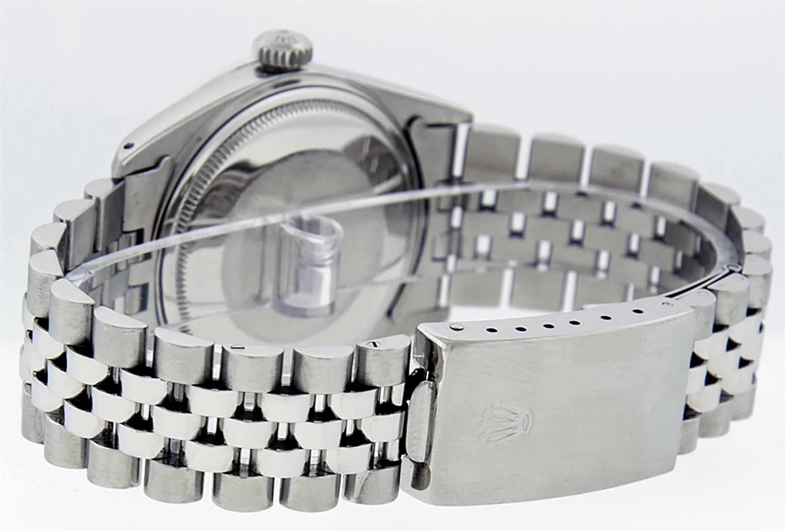 One Men's Stainless Steel Rolex Datejust Polished, Serviced & Electronically Tested, Stainless Steel Case: 36mm, Stainless Steel Crown, Custom Bezel: New 18K White Gold Ruby Beadset Diamond Bezel, Diamond + Gem Count: 36 Diamonds + 4 Rubies Total Weight 1.00 Carat, Clarity: SI-VS, Color: G to H. Custom Crystal: New Synthetic Sapphire Cyclops Lens. Custom Hands: New Luminescent Hands. Movement: Automatic Winding Movement. Custom Dial: Red Vignette With Diamond Hour Markers, 10 Diamond Dial G To H In Color, Clarity: SI-VS. Date Window: 3 O'clock Position Date Display, Quickset, Model: Datejust. Condition: G-6 Extra Fine. Bracelet: Stainless Steel Jubilee. Bright Polish & Satin Finish. 7.0 Inch Length, Adjustable. Standard Clasp, With Rolex Logo. This Watch Has Been Serviced Time Tested And Is In Excellent Condition It Is Free Of All Scratches And Dents.