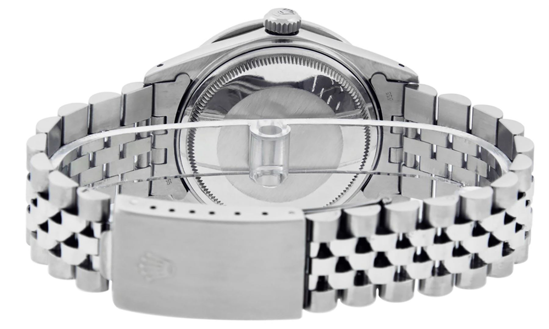One Men's Stainless Steel Rolex Datejust Polished Bright with Satin Finish, This Watch Has Been Serviced & Electronically Tested, Stainless Steel Case: 36mm, Stainless Steel Crown, Custom Bezel: New 18K White Gold Ruby Channel Set Diamond Bezel, Diamond + Gem Count: 52 Diamonds + 4 Rubies, Total Weight 1.30 Carat, Clarity: SI-VS, Color: G to H. Custom Crystal: New Scratch Resistant Synthetic Sapphire Cyclops Lens. Custom Hands: New Luminescent Hands. Movement: Automatic Winding Movement. Custom Dial: Meteorite Diamond Dial, Diamond Count: 10 Diamonds in Dial, Diamond Color: G To H In Color, Clarity: SI-VS. Date Window: 3 O'clock Position Date Display, Quickset, Model: Datejust, Condition: G-6 Extra Fine. Bracelet: Stainless Steel Jubilee Band. Bracelet: 7.0 Inch Length, Adjustable. Standard Clasp, With Rolex Logo. This Watch Has Been Serviced Time Tested And Is In Excellent Condition It Is Free Of All Scratches And Dents.