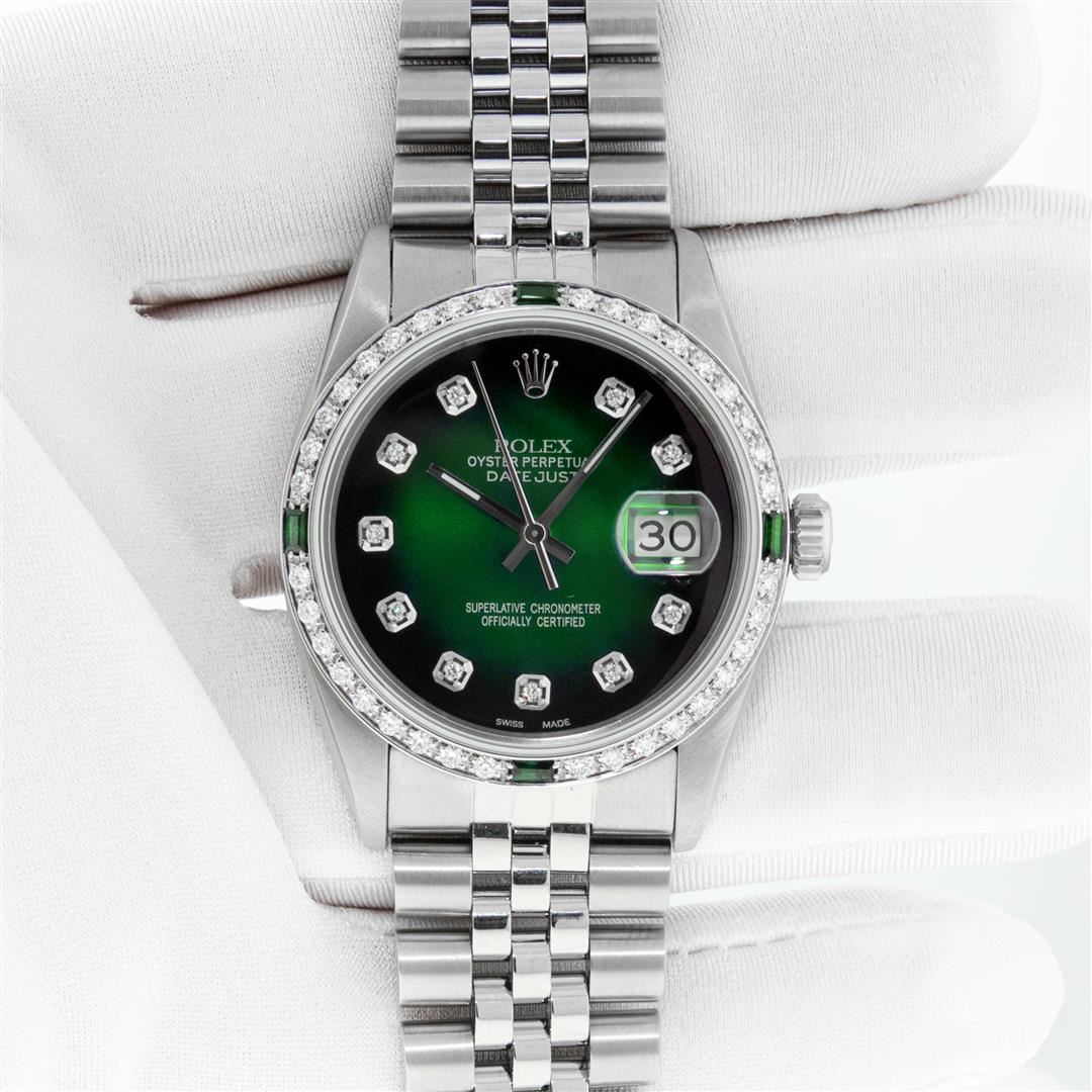One Men's Rolex Datejust Polished Bright with Satin Finish, This Watch Has Been Serviced & Electronically Tested, Rolex Stainless Steel Case: 36mm, Rolex Stainless Steel Crown, Custom Bezel: New 18K White Gold Emerald Beadset Diamond Bezel, Diamond + Gem Count: 36 Diamonds + 4 Emeralds, Clarity: SI-VS, Color: G to H. Custom Crystal: New Sapphire with Date Window. Custom Hands: New Luminescent Hands. Rolex Movement: Automatic Winding Movement. Custom Dial: Refinished To Green Vignette with Added Diamond Hour Markers, Diamond Count: 10 Diamonds in Dial, Diamond Color: G To H In Color, Clarity: SI-VS. Date Window: 3 O'Clock Position Date Display, Quickset, Model: Datejust, Condition: G-6 Extra Fine. Rolex Bracelet: Stainless Steel Jubilee Band. Bracelet: 7.0 Inch Length, Adjustable. Standard Clasp, with Rolex Logo. This Pre Owned Watch Has Been Serviced Time Tested And Is In Excellent Condition It Is Free Of All Scratches And Dents.