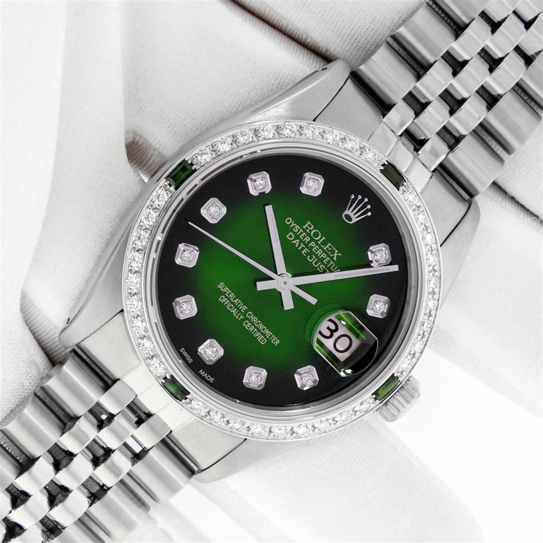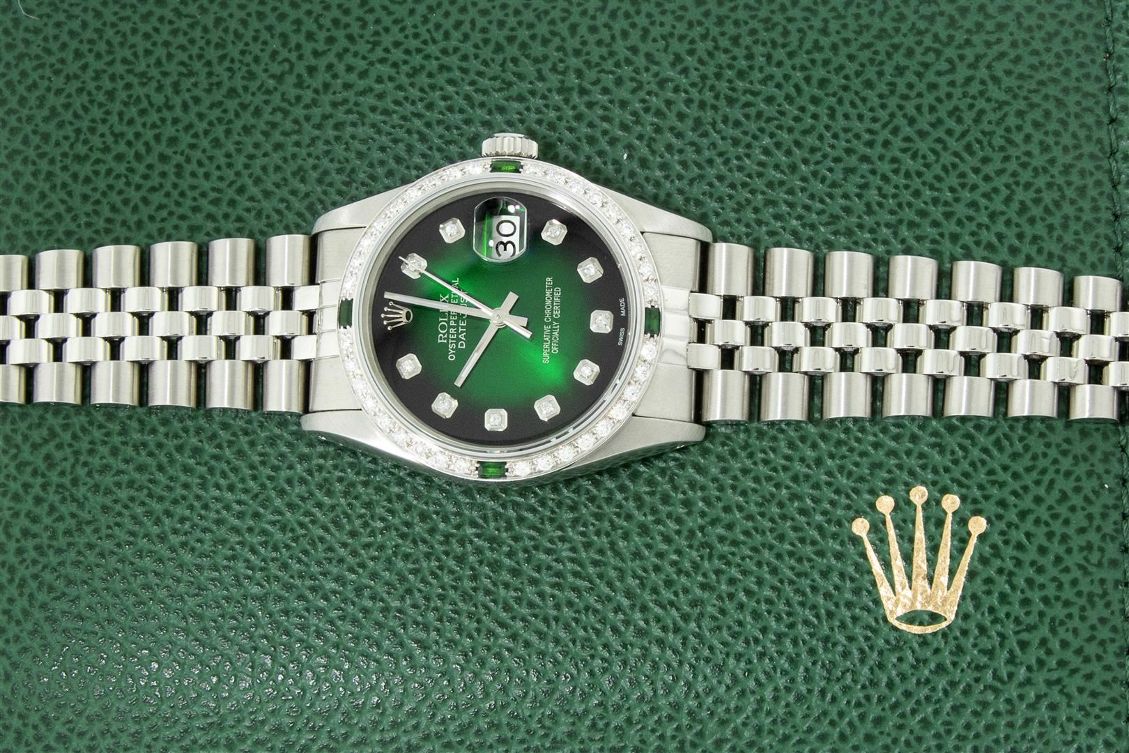 One Men's Rolex Datejust Polished Bright with Satin Finish, This Watch Has Been Serviced & Electronically Tested, Rolex Stainless Steel Case: 36mm, Rolex Stainless Steel Crown, Custom Bezel: New 18K White Gold Emerald Beadset Diamond Bezel, Diamond + Gem Count: 36 Diamonds + 4 Emeralds, Clarity: SI-VS, Color: G to H. Custom Crystal: New Sapphire with Date Window. Custom Hands: New Luminescent Hands. Rolex Movement: Automatic Winding Movement. Custom Dial: Refinished To Green Vignette with Added Diamond Hour Markers, Diamond Count: 10 Diamonds in Dial, Diamond Color: G To H In Color, Clarity: SI-VS. Date Window: 3 O'Clock Position Date Display, Quickset, Model: Datejust, Condition: G-6 Extra Fine. Rolex Bracelet: Stainless Steel Jubilee Band. Bracelet: 7.0 Inch Length, Adjustable. Standard Clasp, with Rolex Logo. This Pre Owned Watch Has Been Serviced Time Tested And Is In Excellent Condition It Is Free Of All Scratches And Dents.