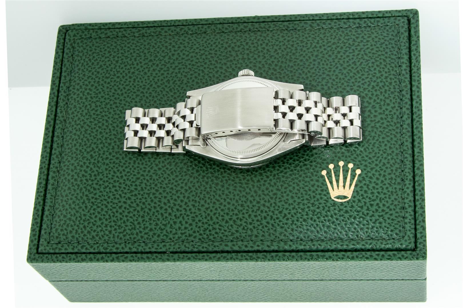 One Men's Rolex Datejust Polished Bright with Satin Finish, Serviced & Electronically Tested, Rolex Stainless Steel Case: 36mm, Custom Diamond Lugs: 28 Diamonds In Lugs, Color: G to H, Clarity: SI-VS. Stainless Steel Crown, Custom Bezel: New 18K White Gold Diamond + Ruby Beadset, Diamond Count: 36 Diamonds + 4 Emeralds, Clarity: SI-VS, Color: G to H. Custom Crystal: New Sapphire with Magnified Date Window. Custom Hands: New Luminescent Hands. Rolex Movement: Automatic Winding Movement. Custom Dial: Refinished To Black with Custom Added Diamonds, Stone Count: 10 Diamonds, Diamond Color: G To H In Color, Clarity: SI-VS. Date Window: 3 O'Clock Position Date Display, Quickset, Model: Datejust Condition: G-6 Extra Fine. Rolex Bracelet: Stainless Steel Jubilee Band. Bright Polish & Satin Finish. 7.0 Inch Length, Adjustable. Standard Clasp, with Rolex Logo. This Pre Owned Watch Has Been Serviced And Polished And Its Free Of All Dents And Scratches. This Watch Comes with A Rolex Box.