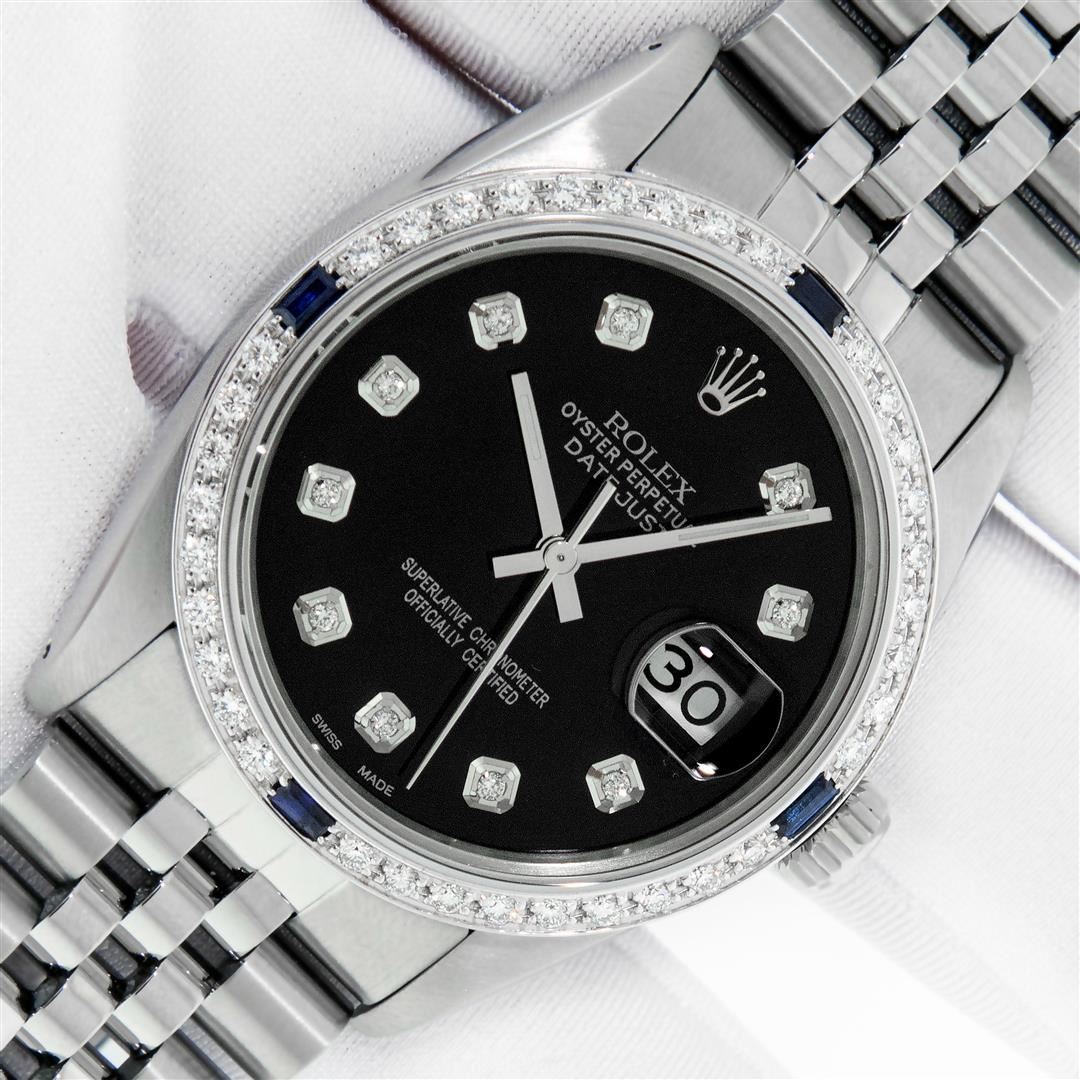 One Men's Rolex Datejust Polished Bright with Satin Finish, This Watch Has Been Serviced & Electronically Tested, Rolex Stainless Steel Case: 36mm, Rolex Stainless Steel Crown, Custom Bezel: New 18K White Gold Sapphire Bead-set Diamond Bezel, Diamond + Gem Count: 36 Diamonds + 4 Sapphires Total Weight 1.00 Carat, Clarity: SI-VS, Color: G to H. Custom Crystal: New Sapphire with Cyclops Lens. Custom Hands: New Luminescent Hands. Rolex Movement: Automatic Winding Movement. Custom Dial: Refinished To Black with Added Diamond Hour Markers, Diamond Count: 10 Diamonds in Dial, Diamond Color: G To H In Color, Clarity: SI-VS. Date Window: 3 O'clock Position Date Display, Quickset, Model: Datejust, Condition: G-6 Extra Fine. Rolex Bracelet: Stainless Steel Jubilee Band. Bracelet: 7.0 Inch Length, Adjustable. Standard Clasp, with Rolex Logo. This Preowned Watch Has Been Serviced Time Tested And Is In Excellent Condition It Is Free Of All Scratches And Dents.