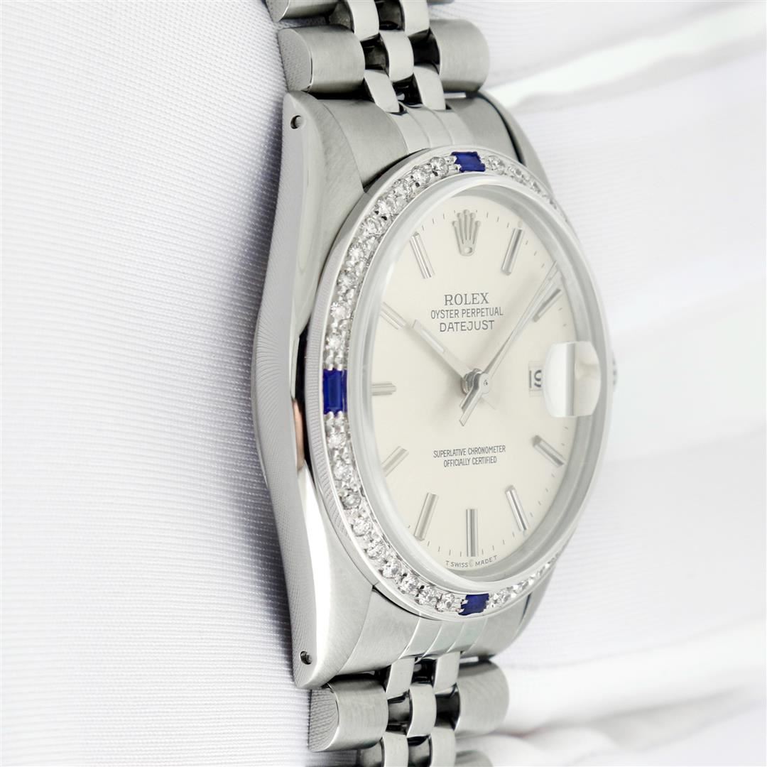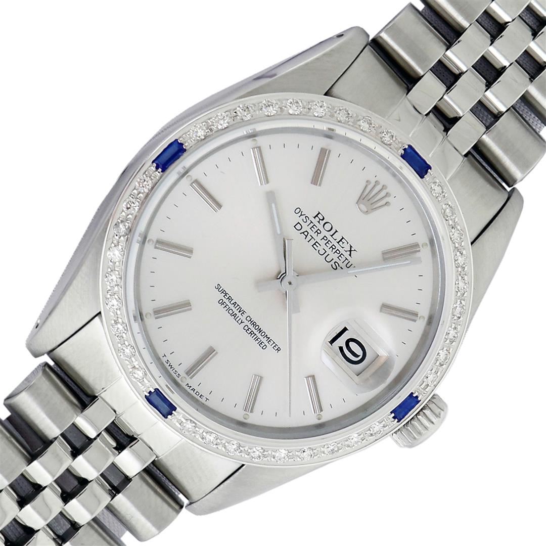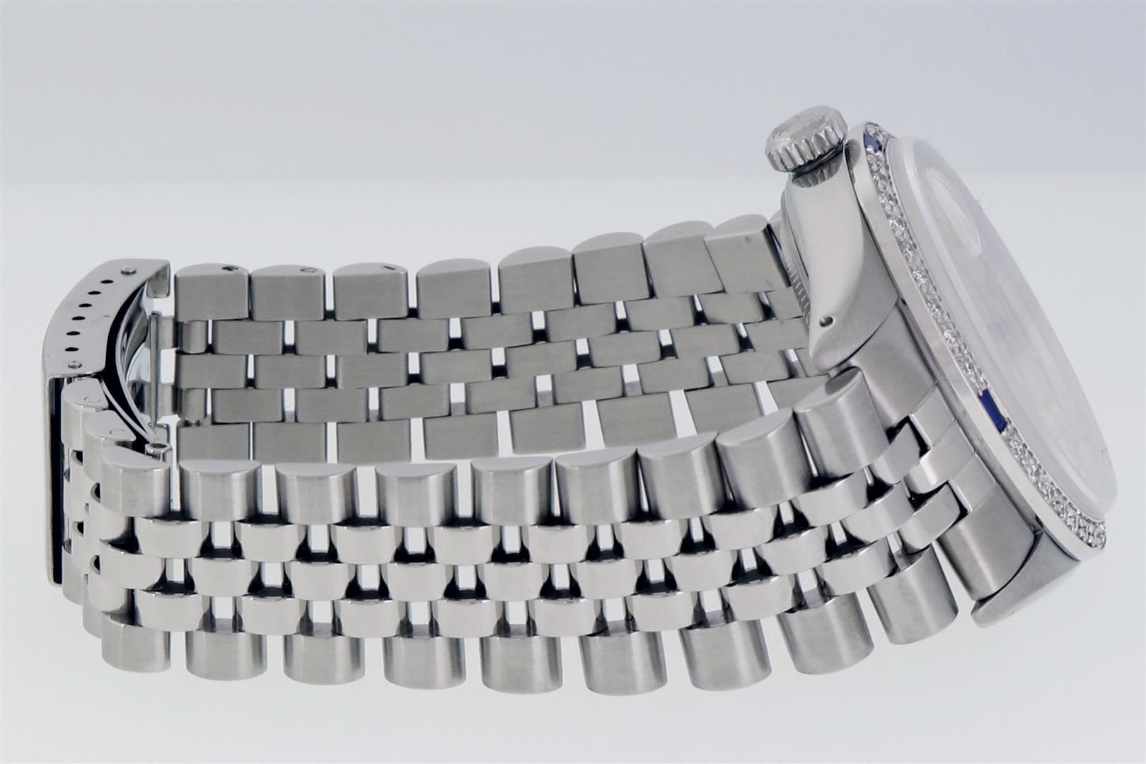 One Men's Rolex Datejust Polished Bright with Satin Finish, This Watch Has Been Serviced & Electronically Tested, Rolex Stainless Steel Case: 36mm, Rolex Stainless Steel Crown, Custom Bezel: New 18K White Gold Sapphire Beadset Diamond Bezel, Diamond + Gem Count: 36 Diamonds + 4 Sapphires, Clarity: SI-VS, Color: G to H. Custom Crystal: New Sapphire with Date Window. Custom Hands: New Luminescent Hands. Rolex Movement: Automatic Winding Movement. Rolex Dial: Silver Index Dial. Date Window: 3 O'Clock Position Date Display, Quickset, Model: Datejust, Condition: G-6 Extra Fine. Rolex Bracelet: Stainless Steel Jubilee Band. Bracelet: 7.0 Inch Length, Adjustable. Standard Clasp, with Rolex Logo. This Pre Owned Watch Has Been Serviced Time Tested And Is In Excellent Condition It Is Free Of All Scratches And Dents.