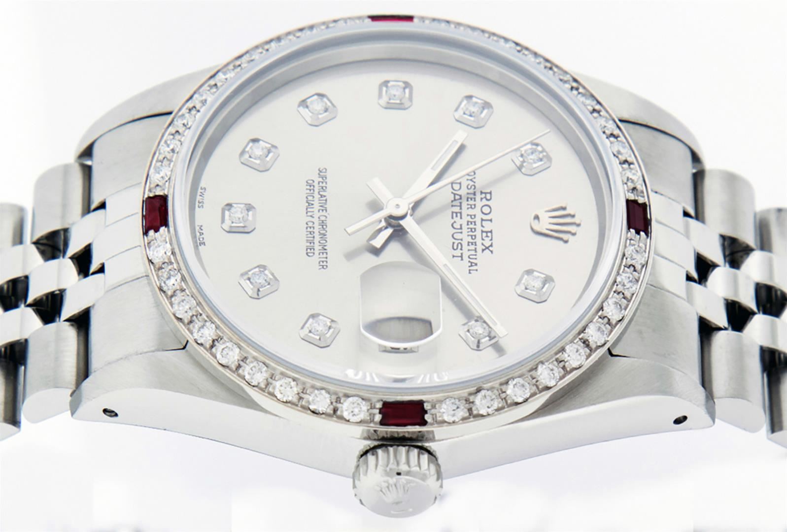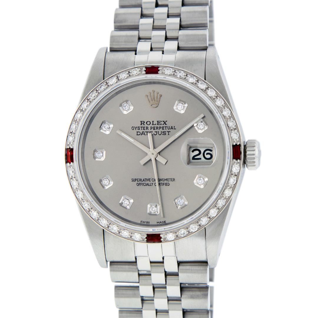 One Men's Stainless Steel Rolex Datejust Polished Bright with Satin Finish, This Watch Has Been Serviced & Electronically Tested, Stainless Steel Case: 36mm, Stainless Steel Crown, Custom Bezel: New 18K White Gold Ruby Beadset Diamond Bezel, Diamond + Gem Count: 36 Diamonds + 4 Rubies, Total Weight 1.00 Carat, Clarity: SI-VS, Color: G to H. Custom Crystal: New Synthetic Sapphire Cyclops Lens. Custom Hands: New Luminescent Hands. Movement: Automatic Winding Movement Caliber 3035. Custom Dial: Slate Grey With Diamond Hour Markers, Diamond Count: 10 Diamonds in Dial, Diamond Color: G To H In Color, Clarity: SI-VS. Date Window: 3 O'clock Position Date Display, Quickset, Model: Datejust, Condition: G-6 Extra Fine. Bracelet: Stainless Steel Jubilee. Bracelet: 7.0 Inch Length, Adjustable. Standard Clasp, With Rolex Logo. This Watch Has Been Serviced Time Tested And Is In Excellent Condition It Is Free Of All Scratches And Dents.