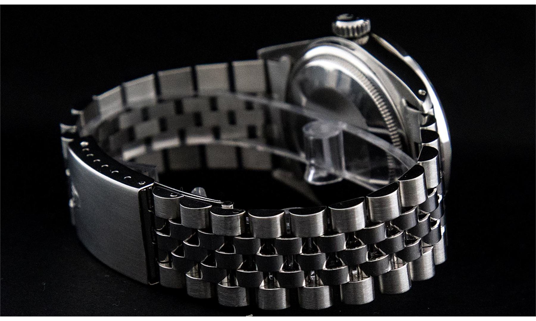 One Men's Stainless Steel Rolex Datejust Polished Bright with Satin Finish, This Watch Has Been Serviced & Electronically Tested, Stainless Steel Case: 36mm, Stainless Steel Crown, Custom Bezel: New 18K White Gold Ruby Beadset Diamond Bezel, Diamond + Gem Count: 36 Diamonds + 4 Rubies, Total Weight 1.00 Carat, Clarity: SI-VS, Color: G to H. Custom Crystal: New Synthetic Sapphire Cyclops Lens. Custom Hands: New Luminescent Hands. Movement: Automatic Winding Movement. Custom Dial: Slate Grey With Diamond Hour Markers, Diamond Count: 10 Diamonds in Dial, Diamond Color: G To H In Color, Clarity: SI-VS. Date Window: 3 O'clock Position Date Display, Quickset, Model: Datejust, Condition: G-6 Extra Fine. Bracelet: Stainless Steel Jubilee. Bracelet: 7.0 Inch Length, Adjustable. Standard Clasp, With Rolex Logo. This Watch Has Been Serviced Time Tested And Is In Excellent Condition It Is Free Of All Scratches And Dents.
