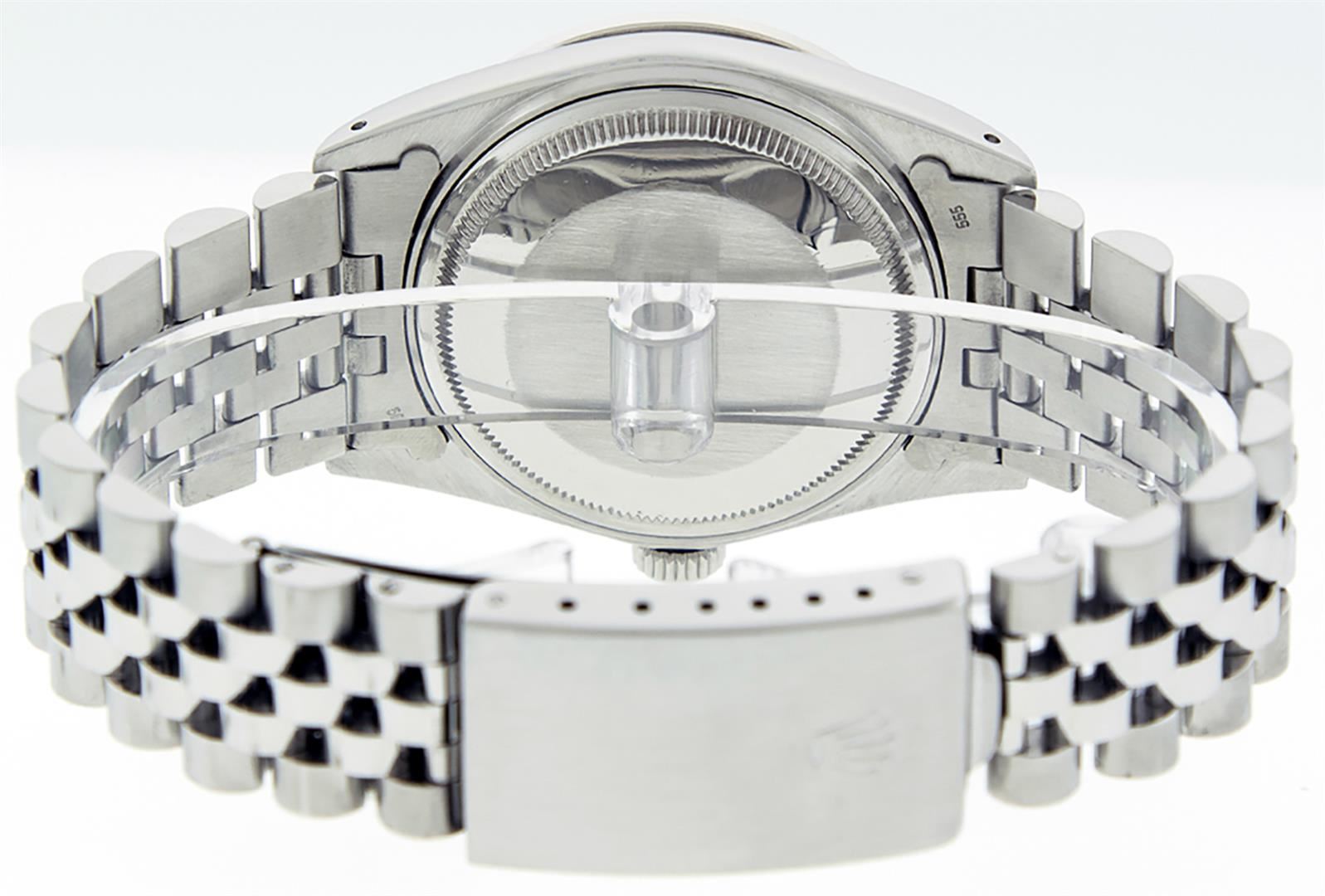 One Men's Stainless Steel Rolex Datejust Polished Bright with Satin Finish, This Watch Has Been Serviced & Electronically Tested, Stainless Steel Case: 36mm, Stainless Steel Crown, Custom Bezel: New 18K White Gold Sapphire Beadset Diamond Bezel, Diamond + Gem Count: 36 Diamonds + 4 Sapphires, Total Weight 1.00 Carat, Clarity: SI-VS, Color: G to H. Custom Crystal: New Synthetic Sapphire Cyclops Lens. Custom Hands: New Luminescent Hands. Movement: Automatic Winding Movement.. Custom Dial: Slate Grey With Diamond Hour Markers, Diamond Count: 10 Diamonds in Dial, Diamond Color: G To H In Color, Clarity: SI-VS. Date Window: 3 O'clock Position Date Display, Quickset, Model: Datejust, Condition: G-6 Extra Fine. Bracelet: Stainless Steel Jubilee. Bracelet: 7.0 Inch Length, Adjustable. Standard Clasp, With Rolex Logo. This Watch Has Been Serviced Time Tested And Is In Excellent Condition It Is Free Of All Scratches And Dents.