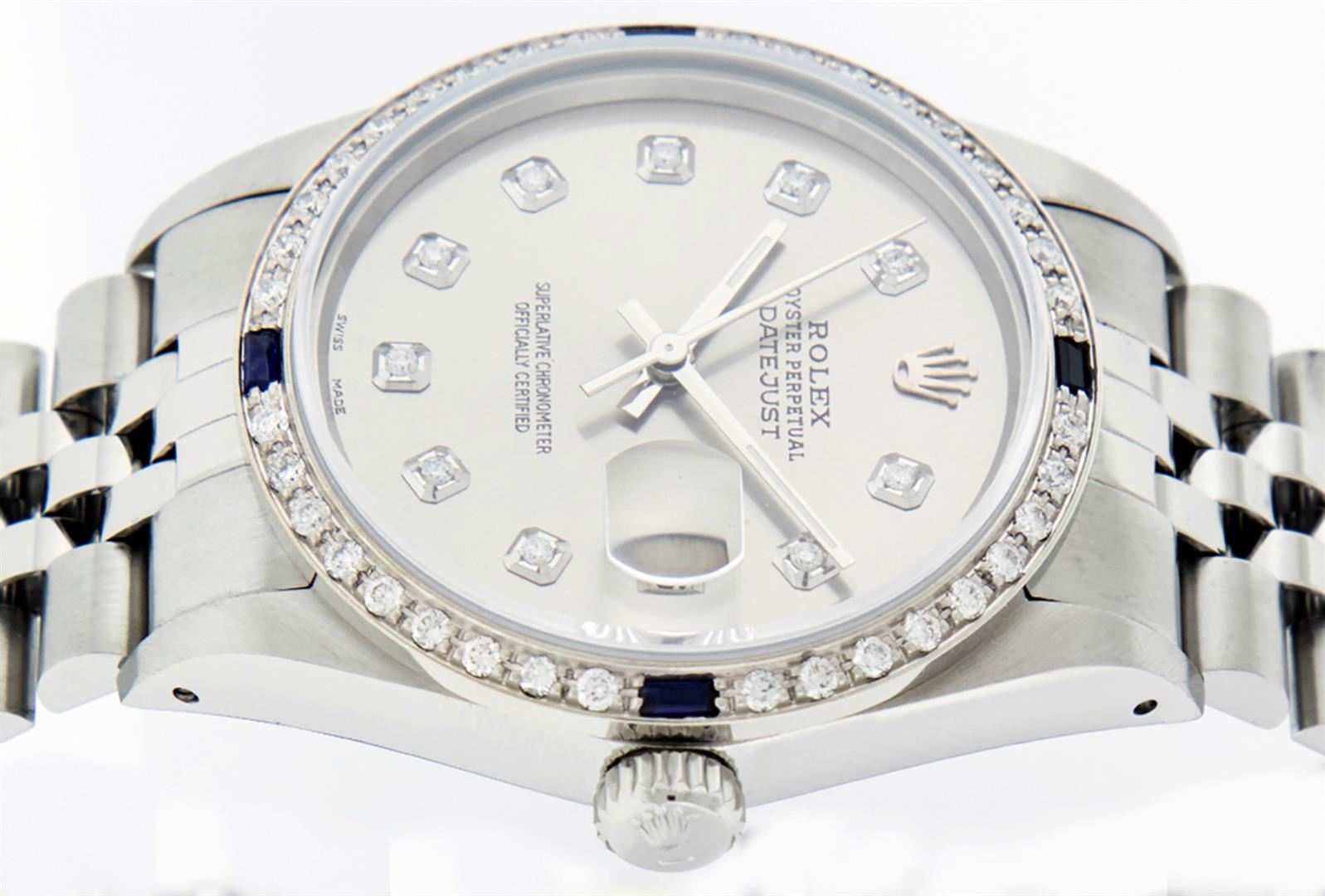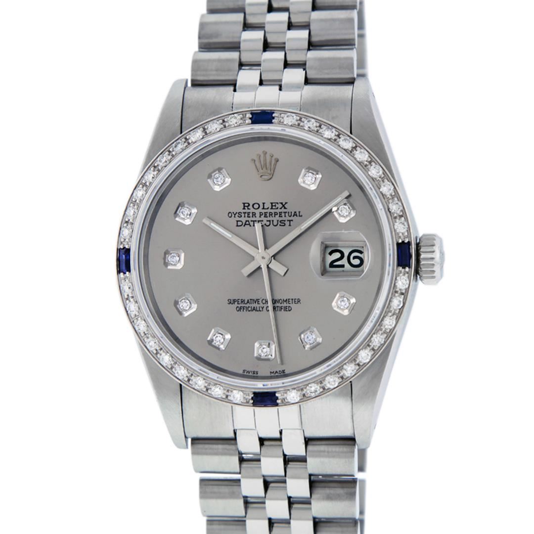One Men's Stainless Steel Rolex Datejust Polished Bright with Satin Finish, This Watch Has Been Serviced & Electronically Tested, Stainless Steel Case: 36mm, Stainless Steel Crown, Custom Bezel: New 18K White Gold Sapphire Beadset Diamond Bezel, Diamond + Gem Count: 36 Diamonds + 4 Sapphires, Total Weight 1.00 Carat, Clarity: SI-VS, Color: G to H. Custom Crystal: New Synthetic Sapphire Cyclops Lens. Custom Hands: New Luminescent Hands. Movement: Automatic Winding Movement.. Custom Dial: Slate Grey With Diamond Hour Markers, Diamond Count: 10 Diamonds in Dial, Diamond Color: G To H In Color, Clarity: SI-VS. Date Window: 3 O'clock Position Date Display, Quickset, Model: Datejust, Condition: G-6 Extra Fine. Bracelet: Stainless Steel Jubilee. Bracelet: 7.0 Inch Length, Adjustable. Standard Clasp, With Rolex Logo. This Watch Has Been Serviced Time Tested And Is In Excellent Condition It Is Free Of All Scratches And Dents.