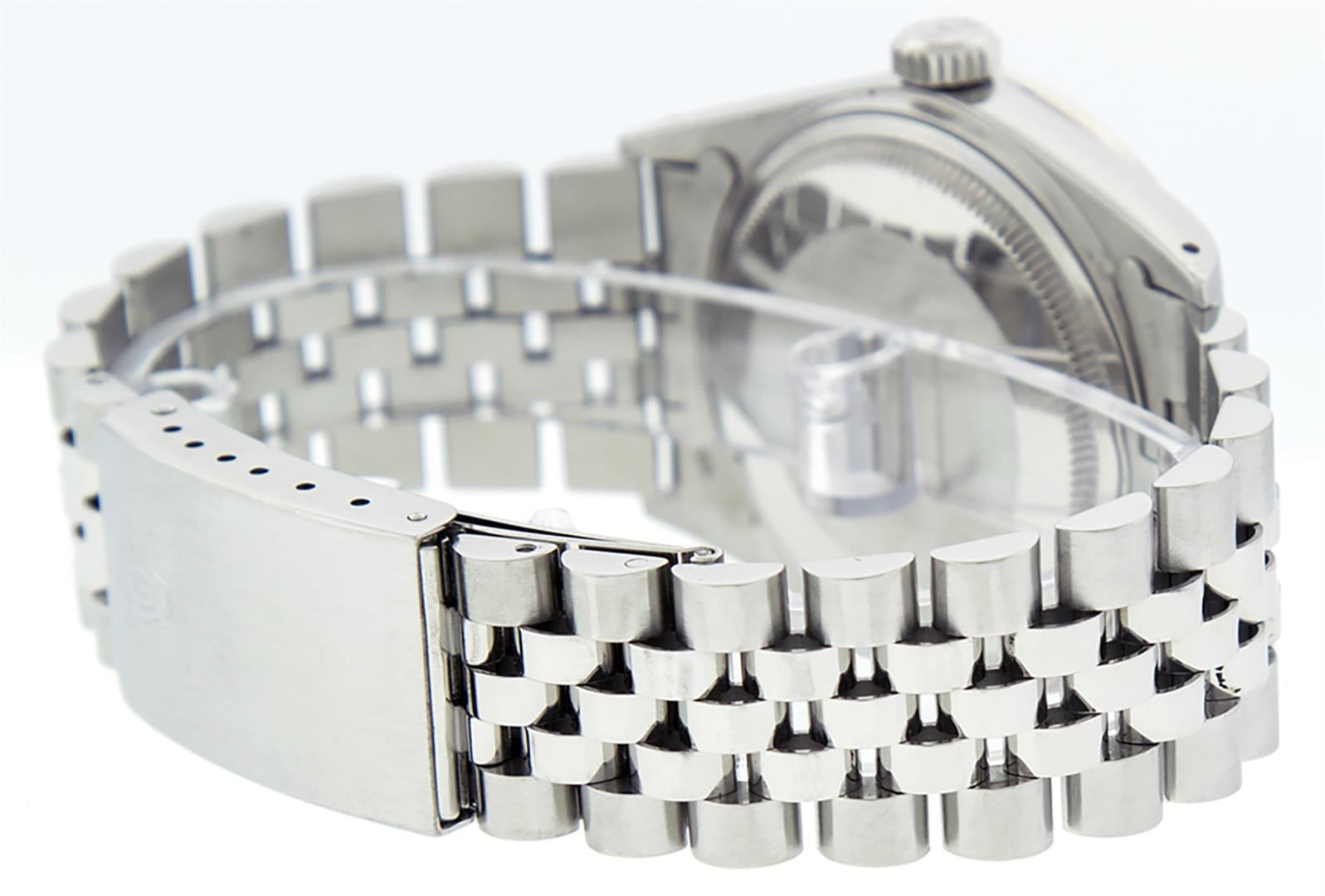 One Men's Stainless Steel Rolex Datejust Polished Bright with Satin Finish, This Watch Has Been Serviced & Electronically Tested, Stainless Steel Case: 36mm, Stainless Steel Crown, Custom Bezel: New 18K White Gold Sapphire Beadset Diamond Bezel, Diamond + Gem Count: 36 Diamonds + 4 Sapphires, Total Weight 1.00 Carat, Clarity: SI-VS, Color: G to H. Custom Crystal: New Synthetic Sapphire Cyclops Lens. Custom Hands: New Luminescent Hands. Movement: Automatic Winding Movement Caliber 3035. Custom Dial: Slate Grey With Diamond Hour Markers, Diamond Count: 10 Diamonds in Dial, Diamond Color: G To H In Color, Clarity: SI-VS. Date Window: 3 O'clock Position Date Display, Quickset, Model: Datejust, Condition: G-6 Extra Fine. Bracelet: Stainless Steel Jubilee. Bracelet: 7.0 Inch Length, Adjustable. Standard Clasp, With Rolex Logo. This Watch Has Been Serviced Time Tested And Is In Excellent Condition It Is Free Of All Scratches And Dents.