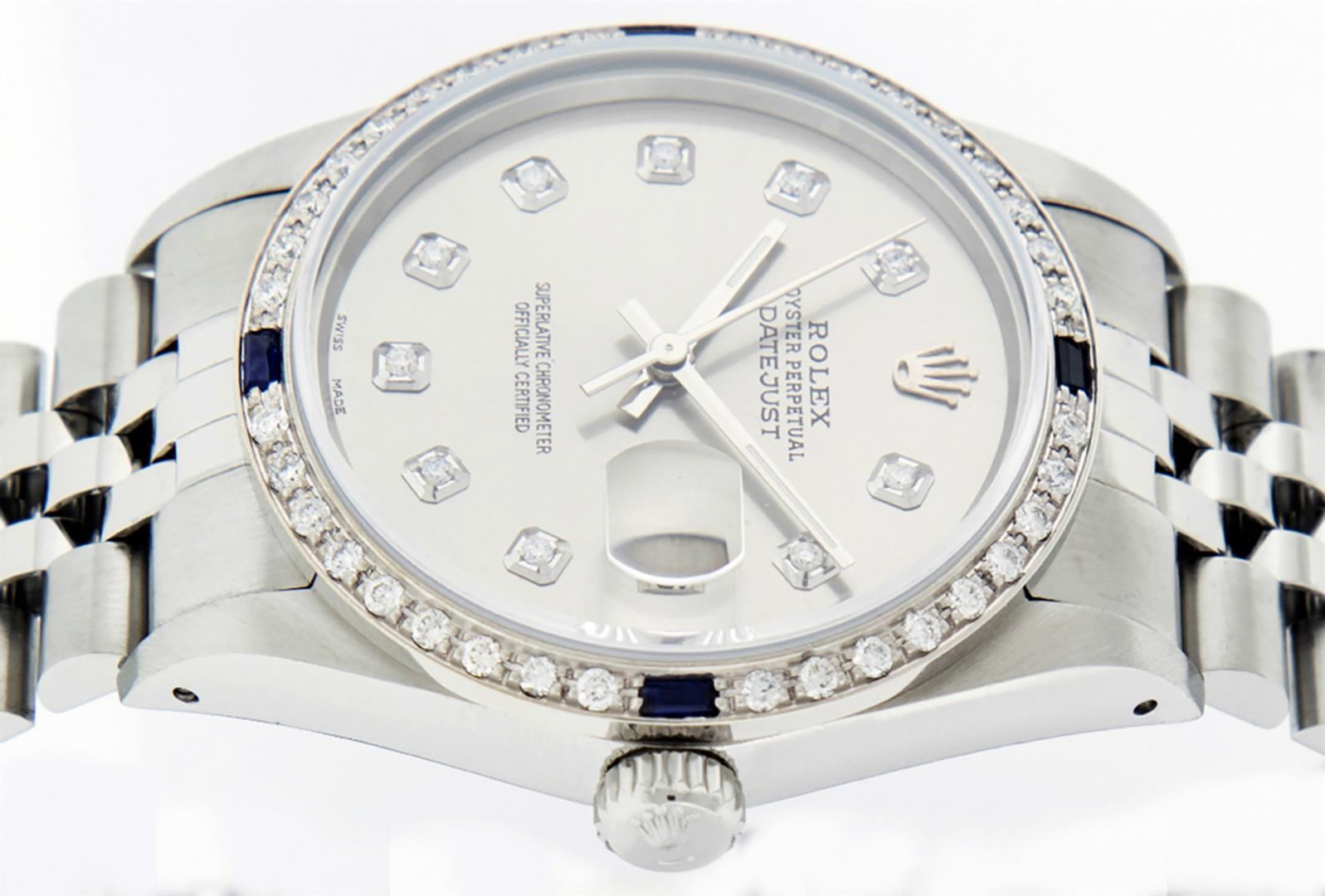 One Men's Stainless Steel Rolex Datejust Polished Bright with Satin Finish, This Watch Has Been Serviced & Electronically Tested, Stainless Steel Case: 36mm, Stainless Steel Crown, Custom Bezel: New 18K White Gold Sapphire Beadset Diamond Bezel, Diamond + Gem Count: 36 Diamonds + 4 Sapphires, Total Weight 1.00 Carat, Clarity: SI-VS, Color: G to H. Custom Crystal: New Synthetic Sapphire Cyclops Lens. Custom Hands: New Luminescent Hands. Movement: Automatic Winding Movement Caliber 3035. Custom Dial: Slate Grey With Diamond Hour Markers, Diamond Count: 10 Diamonds in Dial, Diamond Color: G To H In Color, Clarity: SI-VS. Date Window: 3 O'clock Position Date Display, Quickset, Model: Datejust, Condition: G-6 Extra Fine. Bracelet: Stainless Steel Jubilee. Bracelet: 7.0 Inch Length, Adjustable. Standard Clasp, With Rolex Logo. This Watch Has Been Serviced Time Tested And Is In Excellent Condition It Is Free Of All Scratches And Dents.