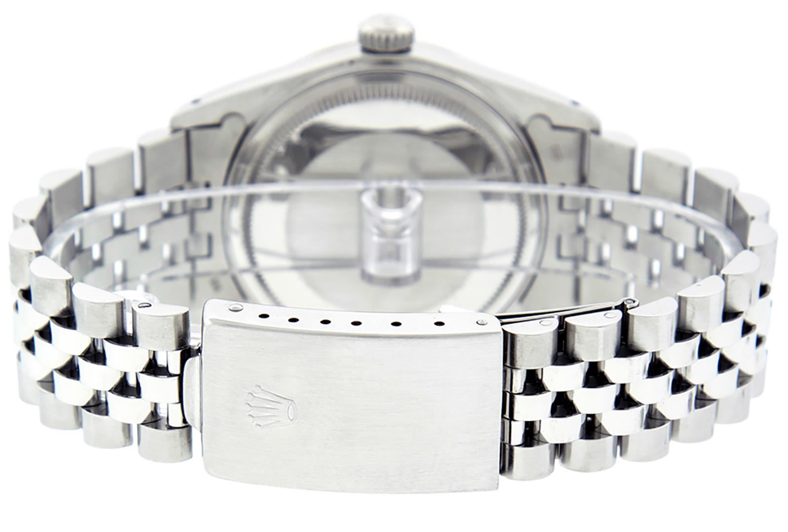 One Men's Stainless Steel Rolex Datejust Polished Bright with Satin Finish, This Watch Has Been Serviced & Electronically Tested, Stainless Steel Case: 36mm, Stainless Steel Crown, Custom Bezel: New 18K White Gold Sapphire Beadset Diamond Bezel, Diamond + Gem Count: 36 Diamonds + 4 Sapphires, Total Weight 1.00 Carat, Clarity: SI-VS, Color: G to H. Custom Crystal: New Synthetic Sapphire Cyclops Lens. Custom Hands: New Luminescent Hands. Movement: Automatic Winding Movement Caliber 3035. Custom Dial: Slate Grey With Diamond Hour Markers, Diamond Count: 10 Diamonds in Dial, Diamond Color: G To H In Color, Clarity: SI-VS. Date Window: 3 O'clock Position Date Display, Quickset, Model: Datejust, Condition: G-6 Extra Fine. Bracelet: Stainless Steel Jubilee. Bracelet: 7.0 Inch Length, Adjustable. Standard Clasp, With Rolex Logo. This Watch Has Been Serviced Time Tested And Is In Excellent Condition It Is Free Of All Scratches And Dents.