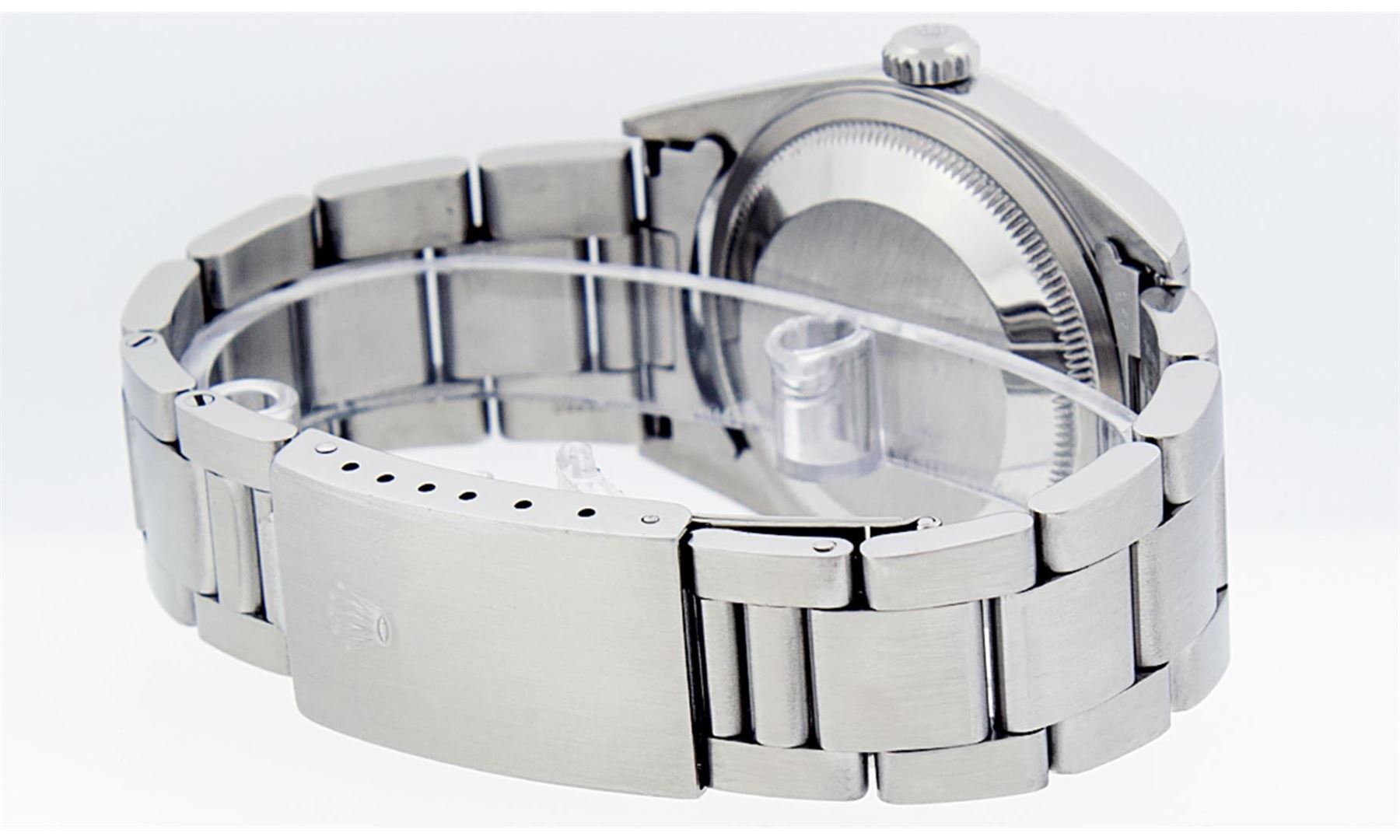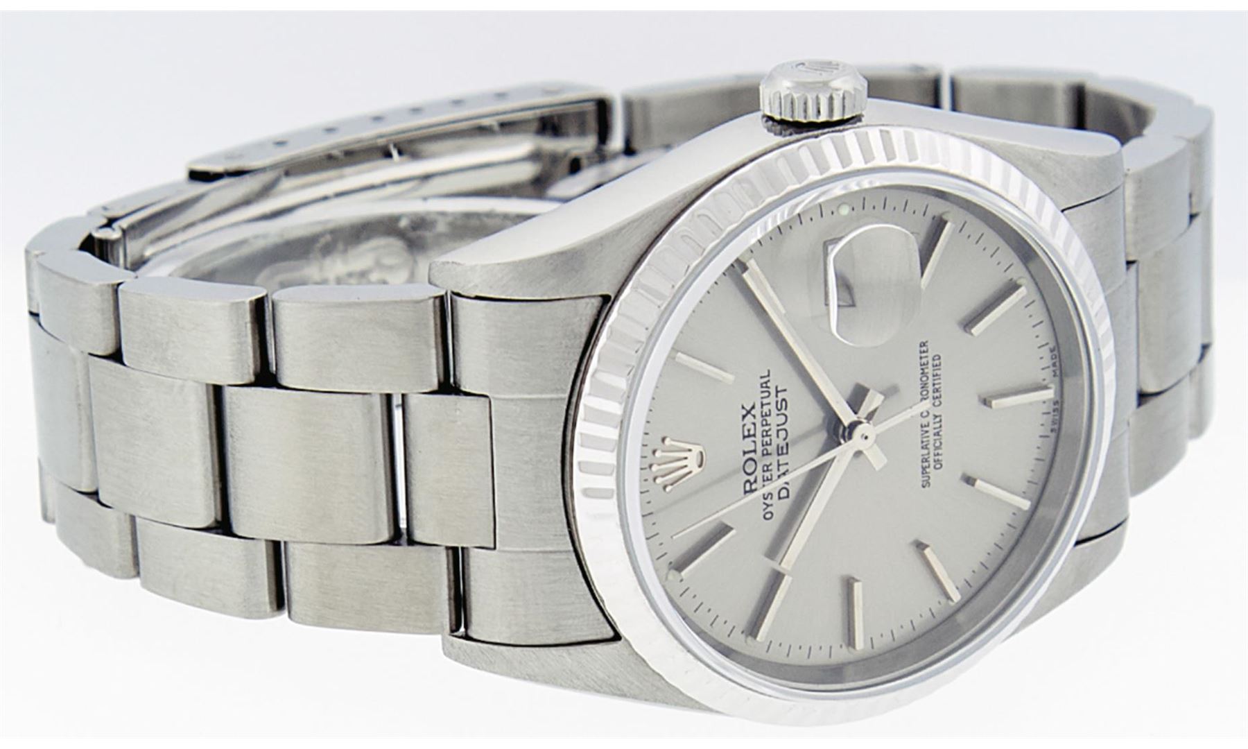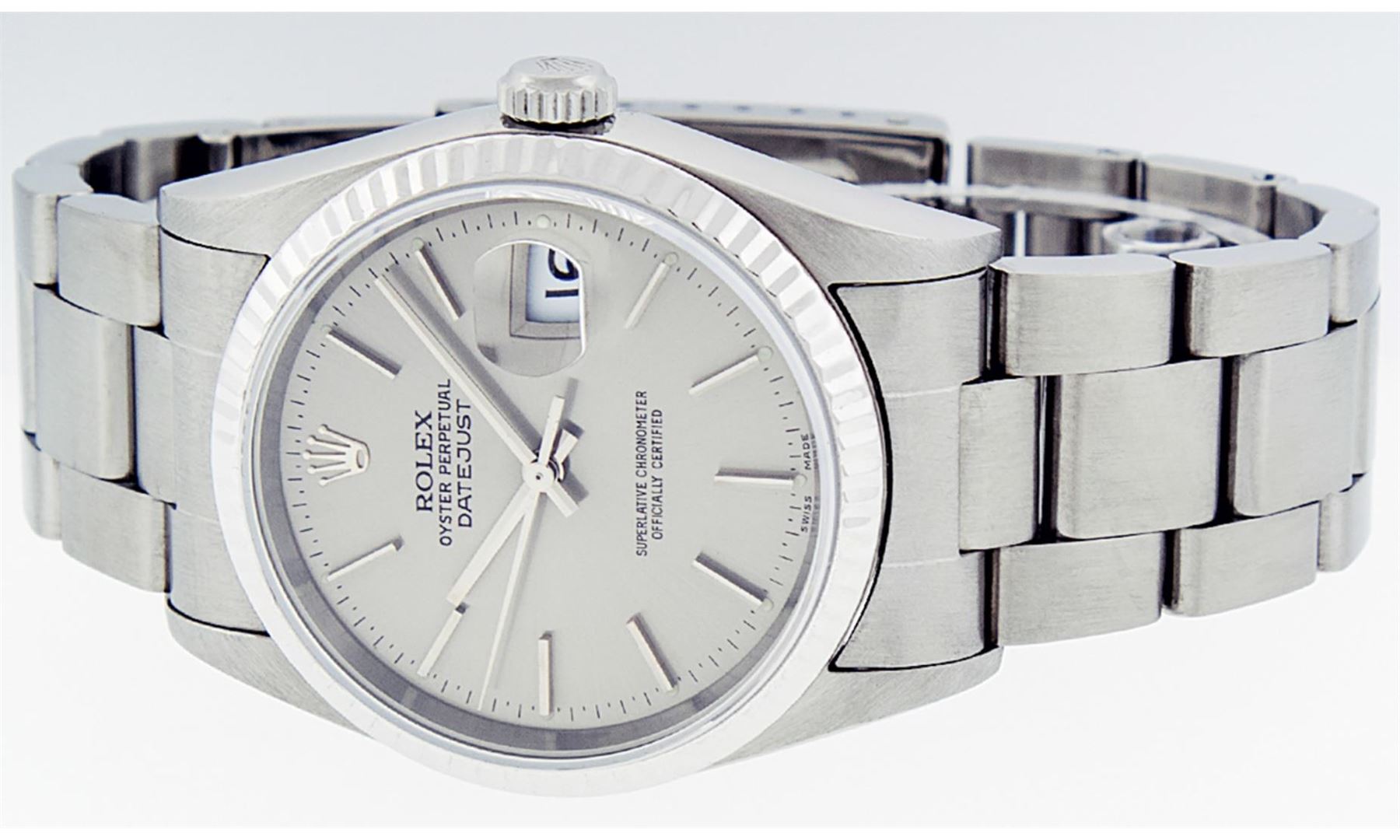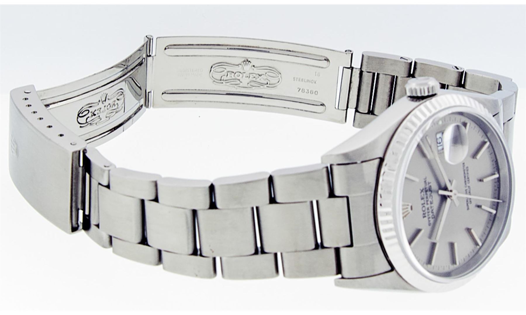 One Men's Rolex Quickset Stainless Steel Datejust Polished Bright with Satin Finish, Serviced & Electronically Tested, Rolex Stainless Steel Case: 36mm, Rolex Stainless Steel Crown, Rolex Bezel: 14K White Gold Fluted Bezel. Crystal: Sapphire With Magnified Date Window. Custom Hands: New Solid Hands. Rolex Movement: Automatic Winding Movement Caliber 3135. Custom Dial: Refinished To Gray With Index Hour Markers Dash Track And Lumi Dots. Date Window: 3 O'Clock Position Date Display, Quickset, Model: Quickset Datejust. Condition: G-6 Extra Fine. Rolex Bracelet: Stainless Steel Oyster Band. Bright Polish & Satin Finish. 7.0 Inch Length, Adjustable. Standard Clasp, With Rolex Logo. This Pre Owned Watch Has Been Serviced Time Tested And Is In Excellent Condition It Is Free Of All Scratches And Dents.