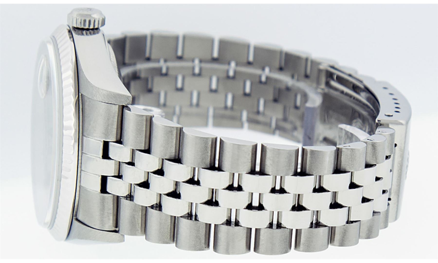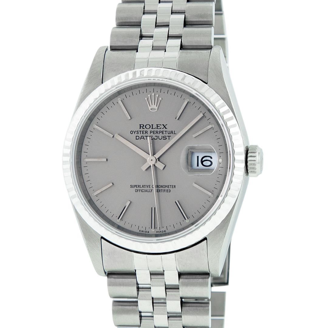 One Men's Rolex Quickset Stainless Steel Datejust Polished Bright with Satin Finish, Serviced & Electronically Tested, Rolex Stainless Steel Case: 36mm, Rolex Stainless Steel Crown, Rolex Bezel: 14K White Gold Fluted Bezel. Crystal: Sapphire With Magnified Date Window. Hands: Solid Hands. Rolex Movement: Automatic Winding Movement Caliber 3135. Custom Dial: Refinished To Gray With Index Hour Markers Dash Track And Lumi Dots. Date Window: 3 O'Clock Position Date Display, Quickset, Model: Quickset Datejust. Condition: G-6 Extra Fine. Rolex Bracelet: Stainless Steel Jubilee Band. Bright Polish & Satin Finish. 7.0 Inch Length, Adjustable. Standard Clasp, With Rolex Logo. This Pre Owned Watch Has Been Serviced Time Tested And Is In Excellent Condition It Is Free Of All Scratches And Dents.