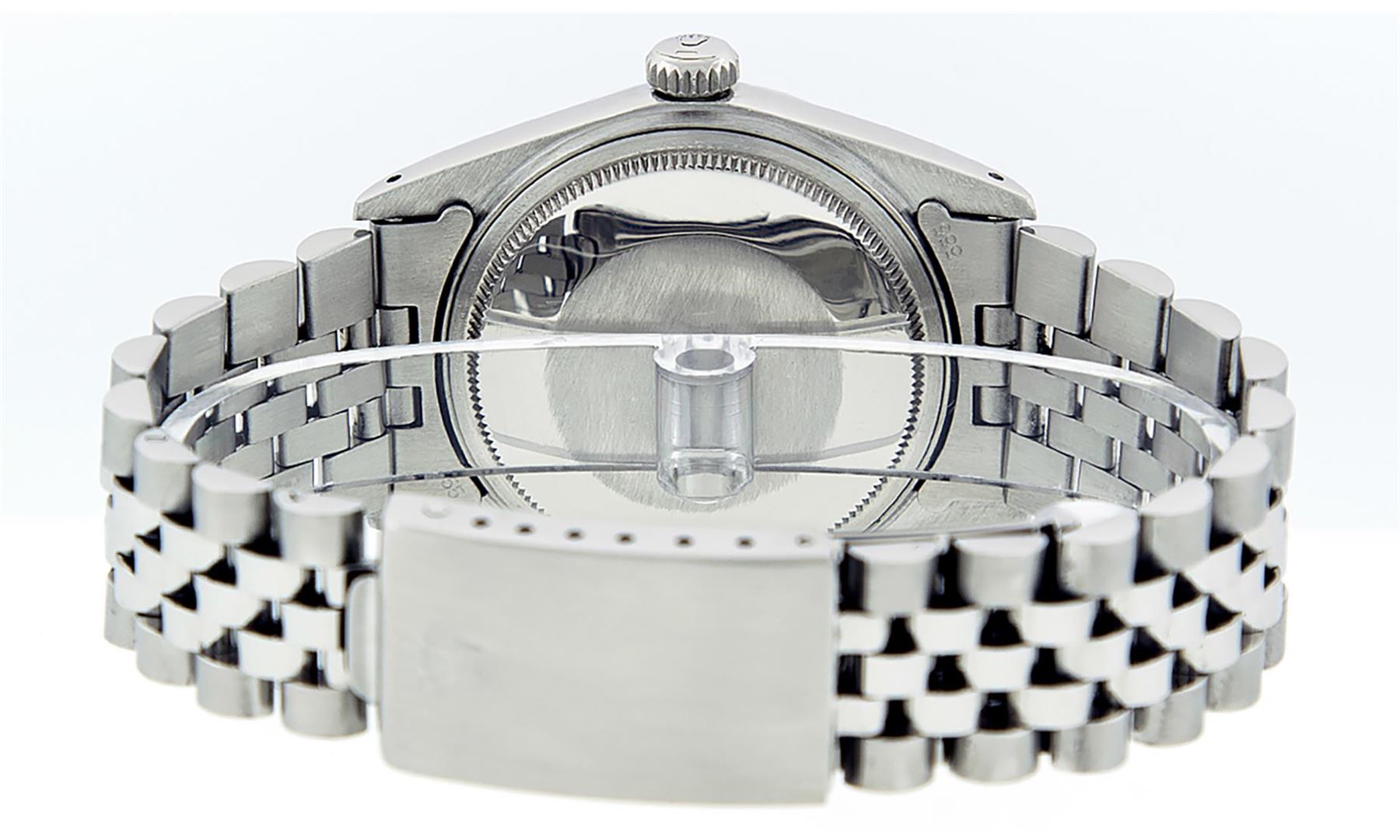 One Men's Stainless Steel Rolex Datejust Polished Bright with Satin Finish, This Watch Has Been Serviced & Electronically Tested, Stainless Steel Case: 36mm, Stainless Steel Crown, Bezel: White Gold Fluted Bezel. Custom Crystal: New Acrylic Cyclops Lens. Custom Hands: New Luminescent Hands. Movement: Automatic Winding Movement.. Custom Dial: Green Diamond Dial With Diamond Hour Markers, Diamond Count: 10 Diamonds in Dial G To H In Color, SI-VS Clarity. Date Window: 3 O'clock Position Date Display, Quickset, Model: Datejust, Condition: G-6 Extra Fine. Bracelet: Stainless Steel Jubilee. Bright Polish & Satin Finish. 7.0 Inch Length, Adjustable. Standard Clasp, With Rolex Logo. This Watch Has Been Serviced Time Tested And Is In Excellent Condition It Is Free Of All Scratches And Dents