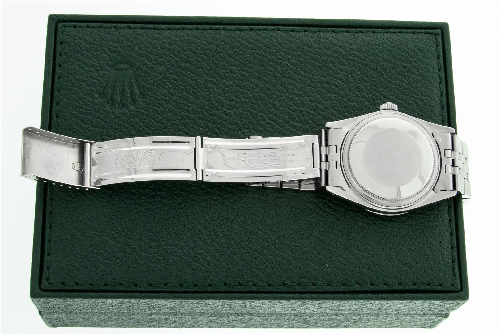 One Mens Rolex Stainless Steel Datejust Polished Bright with Satin Finish, This Watch Has Been Serviced & Electronically Tested, Stainless Steel Case: 36mm, Rolex Stainless Steel Crown, Custom Bezel: New Stainless Steel Bead-set Diamond Bezel, Diamond Count: 54 Diamonds In Bezel, Total Weight 1.00 Carat, Clarity: SI-VS, Color: G to H. Custom Crystal: New Sapphire With Magnified Date Window. Custom Hands: New Luminescent Hands. Rolex Movement: Automatic Winding Movement. Custom Dial: Refinished To Green With Roman Hour Markers. Date Window: 3 O'clock Position Date Display, Quickset, Model: Datejust. Condition: G-6 Extra Fine. Rolex Bracelet: Stainless Steel Jubilee Band. Bright Polish & Satin Finish. 7.0 Inch Length, Adjustable. Standard Clasp, With Rolex Logo. This Preowned Watch Has Been Serviced Time Tested And Is In Excellent Condition It Is Free Of All Scratches And Dents. This Watch Comes With A Rolex Box.