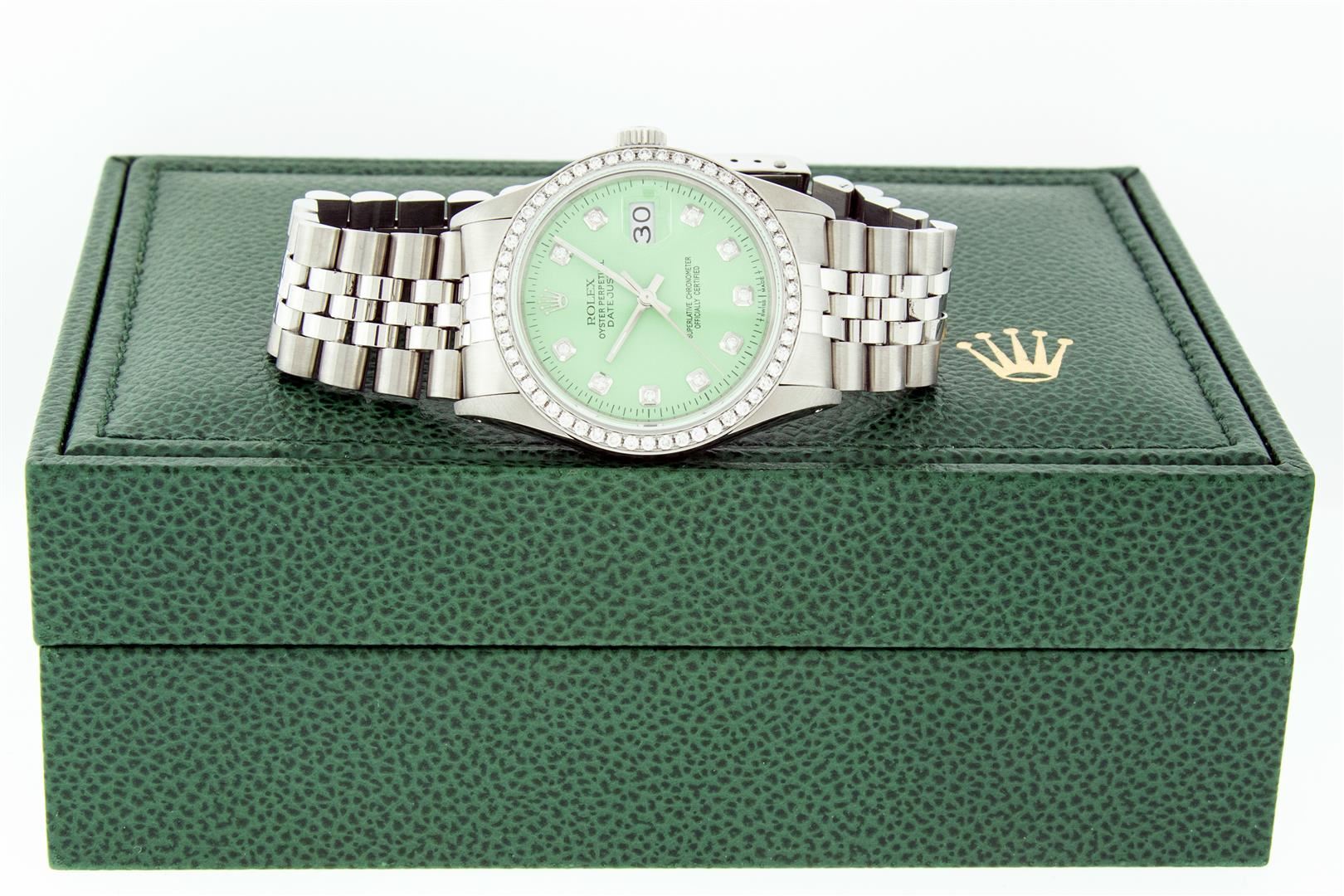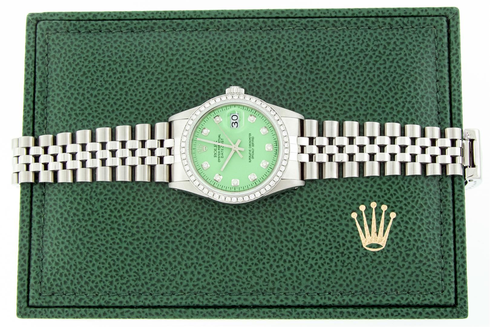 One Men's Rolex Stainless Steel Datejust Polished Bright with Satin Finish, This Watch Has Been Serviced & Electronically Tested, Rolex Stainless Steel Case: 36mm, Rolex Stainless Steel Crown, Custom Bezel: New Stainless Steel Beadset Diamond Bezel, Diamond Count: 54 Diamonds In Bezel, Total Weight 1.00 Carat, Clarity: SI-VS, Color: G to H. Custom Crystal: New Sapphire Magnified Date Window. Custom Hands: New Luminescent Hands. Rolex Movement: Automatic Winding Movement. Custom Dial: Refinish To Green With Added Diamonds, Diamond Count: 10 Diamonds On Dial, Color: G to H, Clarity: VS2-SI1. Date Window: 3 O'clock Position Date Display, Quickset, Model: Datejust. Condition: G-6 Extra Fine. Rolex Bracelet: Stainless Steel Jubilee Band. Bright Polish & Satin Finish. 7.0 Inch Length, Adjustable. Standard Clasp, With Rolex Logo. This Pre Owned Watch Has Been Serviced Time Tested And Is In Excellent Condition It Is Free Of All Scratches And Dents. This Watch Comes With A Rolex Box.