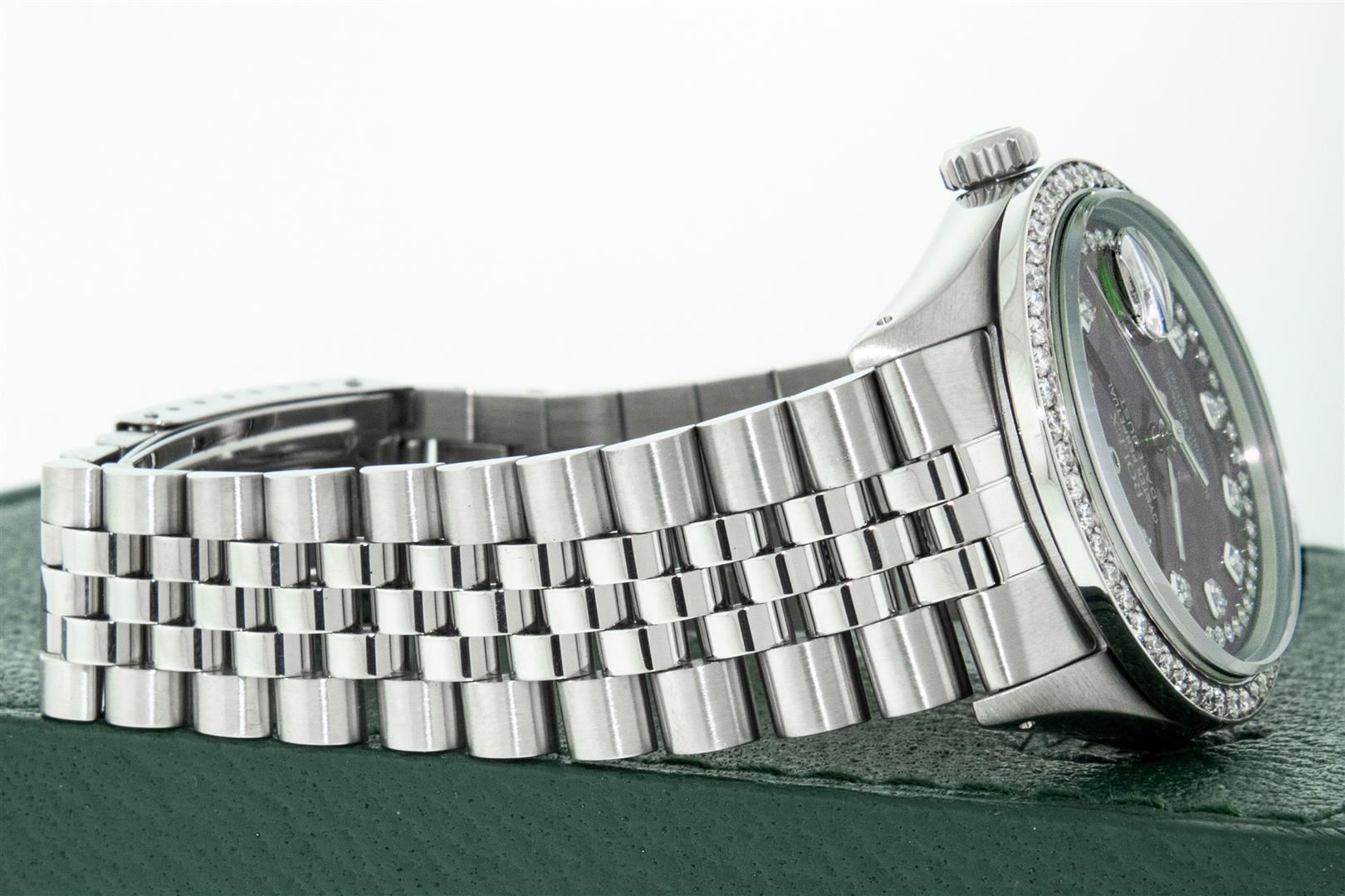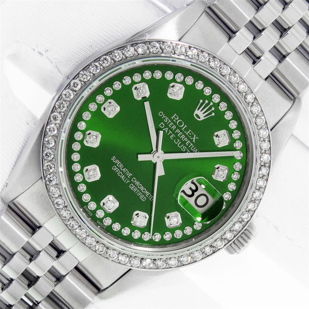 One Mens Rolex Stainless Steel Datejust Polished Bright with Satin Finish, This Watch Has Been Serviced & Electronically Tested, Rolex Stainless Steel Case: 36mm, Rolex Stainless Steel Crown, Custom Bezel: New Stainless Steel Bead-set Diamond Bezel, Diamond Count: 54 Diamonds, Clarity: SI-VS, Color: G to H. Custom Crystal: New Sapphire With Magnified Date Window. Custom Hands: New Luminescent Hands. Rolex Movement: Automatic Winding Movement. Custom Dial: Refinished To Green String With Added Diamond Hour Markers, Diamond Count: 58 Diamonds In Dial, Color: G to H, Clarity: VS2-SI1. Date Window: 3 O'Clock Position Date Display, Quickset, Model: Datejust. Condition: G-6 Extra Fine. Rolex Bracelet: Stainless Steel Jubilee Band. Bright Polish & Satin Finish. 7.0 Inch Length, Adjustable. Standard Clasp, With Rolex Logo. This Pre Owned Watch Has Been Serviced Time Tested And Is In Excellent Condition It Is Free Of All Scratches And Dents. This Watch Comes With A Rolex Box.