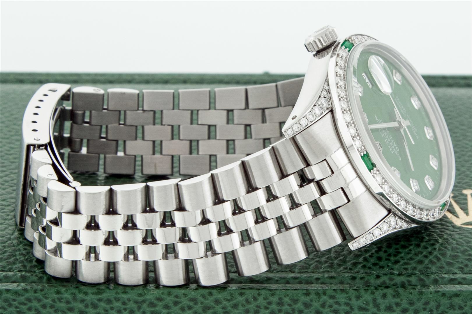One Men's Rolex Datejust Polished Bright with Satin Finish, Serviced & Electronically Tested, Rolex Stainless Steel Case: 36mm, Custom Diamond Lugs: 28 Diamonds In Lugs, Color: G to H, Clarity: SI-VS. Stainless Steel Crown, Custom Bezel: New 18K White Gold Diamond + Emerald Beadset, Diamond Count: 36 Diamonds + 4 Emeralds, Total Weight 1.00 Carat, Clarity: SI-VS, Color: G to H. Custom Crystal: New Sapphire With Magnified Date Window. Custom Hands: New Luminescent Hands. Rolex Movement: Automatic Winding Movement. Custom Dial: Refinished To Green With Added Diamonds, Stone Count: 10 Diamonds, Diamond Color: G To H In Color, Clarity: SI-VS. Date Window: 3 O'clock Position Date Display, Quickset, Model: Datejust Condition: G-6 Extra Fine. Rolex Bracelet: Stainless Steel Jubilee Band. Bright Polish & Satin Finish. 7.0 Inch Length, Adjustable. Standard Clasp, With Rolex Logo. This Pre Owned Watch Has Been Serviced And Polished And Its Free Of All Dents And Scratches. This Watch Comes With A Rolex Box.