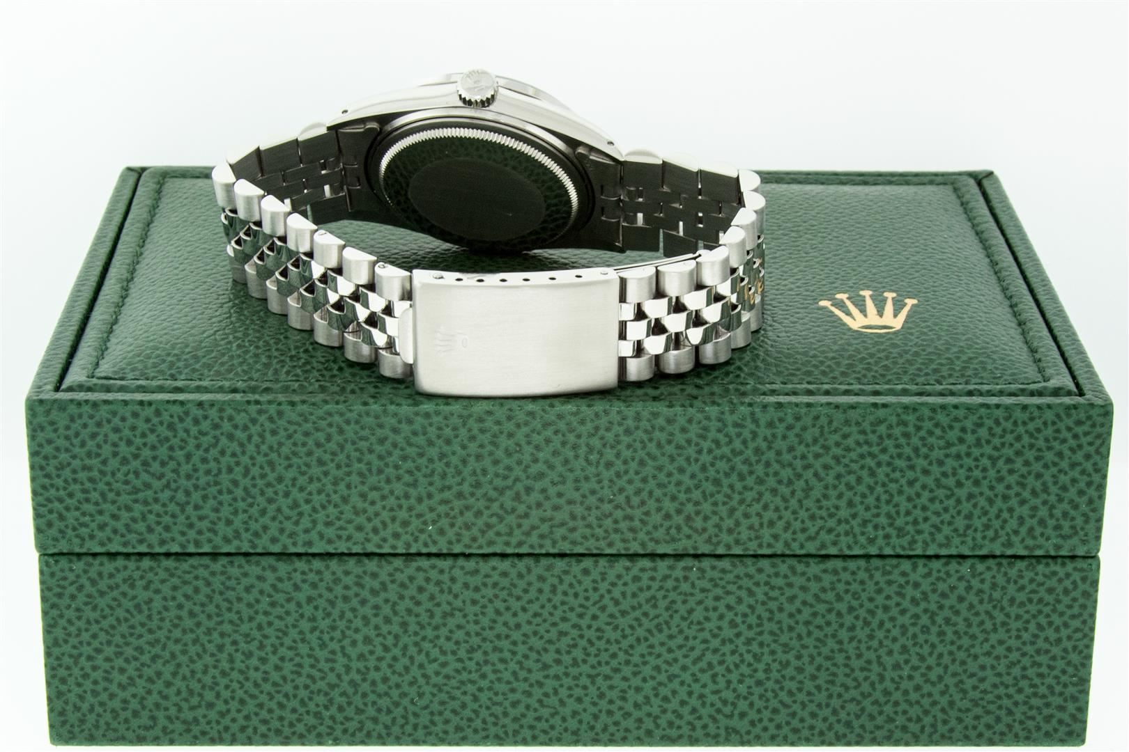 One Men's Rolex Datejust Polished Bright with Satin Finish, Serviced & Electronically Tested, Rolex Stainless Steel Case: 36mm, Custom Diamond Lugs: 28 Diamonds In Lugs, Color: G to H, Clarity: SI-VS. Stainless Steel Crown, Custom Bezel: New 18K White Gold Diamond + Emerald Beadset, Diamond Count: 36 Diamonds + 4 Emeralds, Total Weight 1.00 Carat, Clarity: SI-VS, Color: G to H. Custom Crystal: New Sapphire With Magnified Date Window. Custom Hands: New Luminescent Hands. Rolex Movement: Automatic Winding Movement. Custom Dial: Refinished To Green With Added Diamonds, Stone Count: 10 Diamonds, Diamond Color: G To H In Color, Clarity: SI-VS. Date Window: 3 O'clock Position Date Display, Quickset, Model: Datejust Condition: G-6 Extra Fine. Rolex Bracelet: Stainless Steel Jubilee Band. Bright Polish & Satin Finish. 7.0 Inch Length, Adjustable. Standard Clasp, With Rolex Logo. This Pre Owned Watch Has Been Serviced And Polished And Its Free Of All Dents And Scratches. This Watch Comes With A Rolex Box.