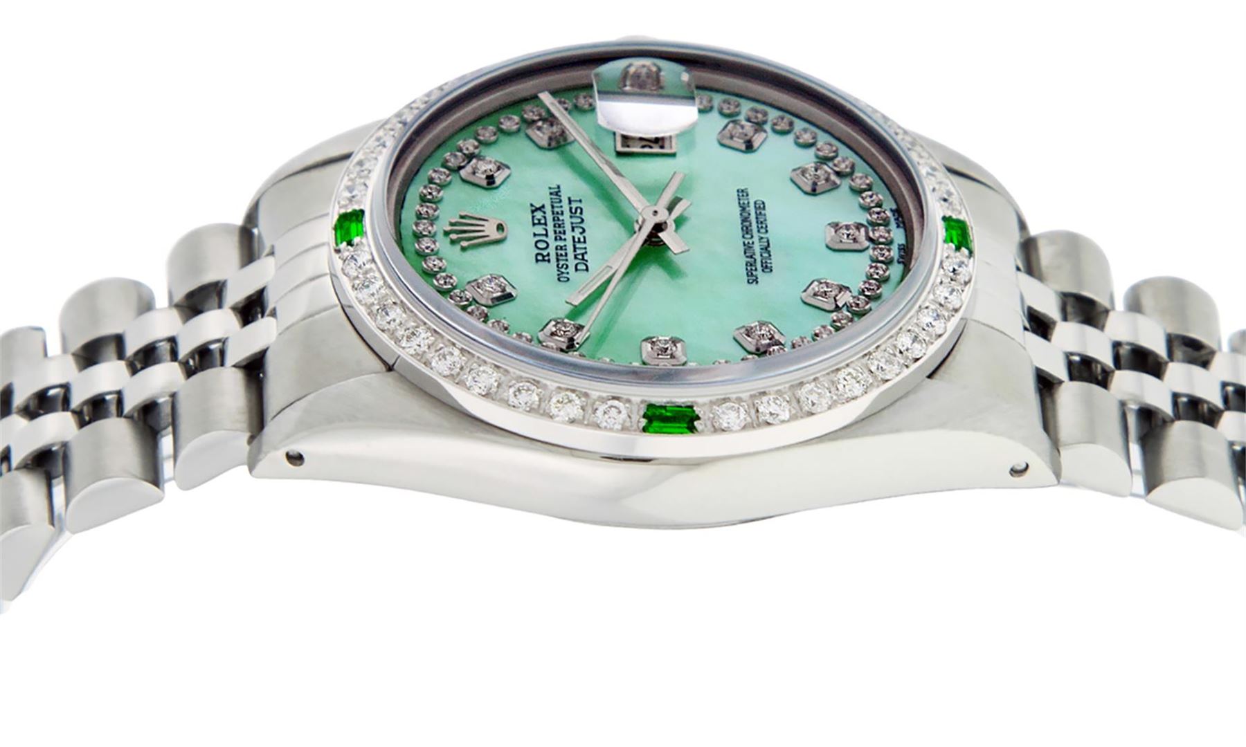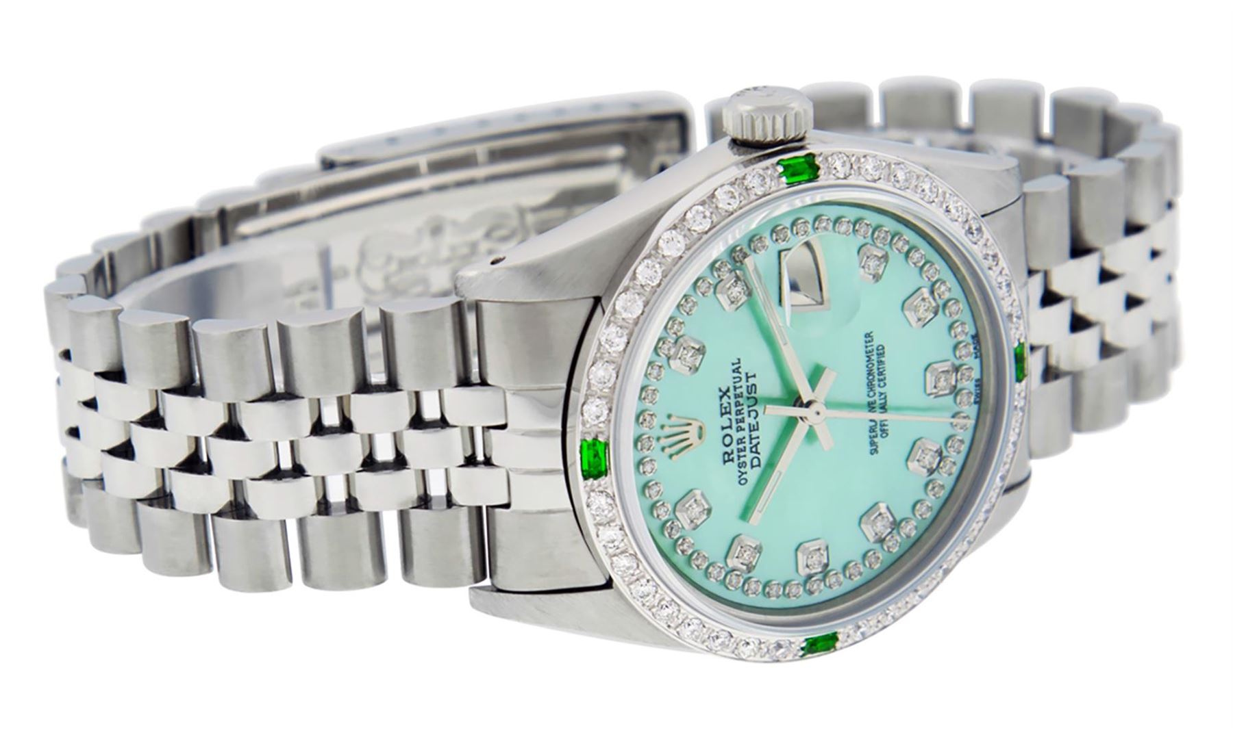 One Men's Stainless Steel Rolex Datejust Polished, Serviced & Electronically Tested, Stainless Steel Case: 36mm, Stainless Steel Crown, Custom Bezel: New 18K White Gold Emerald Beadset Diamond Bezel, Stone Count: 36 Diamonds + 4 Synthetic Emeralds. Total Weight 1.0 Carat, Clarity: SI-VS, Color: G to H. Custom Crystal: New Scratch Resistant Synthetic Sapphire Cyclops Lens. Custom Hands: New Luminescent Hands. Movement: Automatic Winding Movement. Custom Dial: Green Mother Of Pearl String Diamond Dial, Diamond Count: 58 Diamonds In Dial G To H In Color, Clarity: VS2-SI1. Date Window: 3 O'clock Position Date Display, Quickset, Model: Datejust. Condition: G-6 Extra Fine. Bracelet: Stainless Steel Jubilee Band. Bright Polish & Satin Finish. 7.0 Inch Length, Adjustable. Standard Clasp, With Rolex Logo. This Watch Has Been Serviced Time Tested And Is In Excellent Condition It Is Free Of All Scratches And Dents.