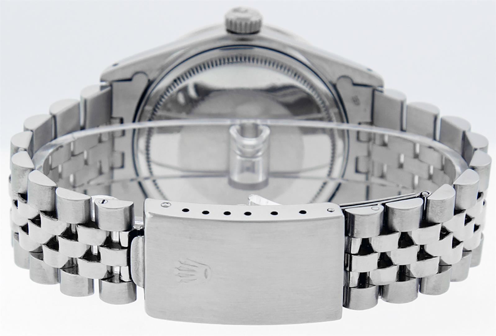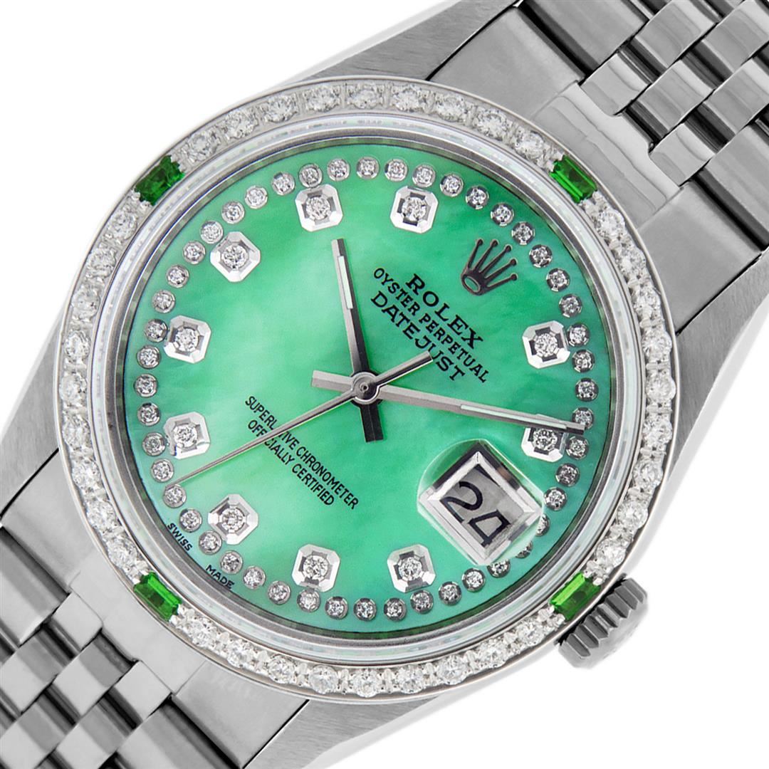 One Men's Stainless Steel Rolex Datejust Polished, Serviced & Electronically Tested, Stainless Steel Case: 36mm, Stainless Steel Crown, Custom Bezel: New 18K White Gold Emerald Beadset Diamond Bezel, Stone Count: 36 Diamonds + 4 Synthetic Emeralds. Total Weight 1.0 Carat, Clarity: SI-VS, Color: G to H. Custom Crystal: New Scratch Resistant Synthetic Sapphire Cyclops Lens. Custom Hands: New Luminescent Hands. Movement: Automatic Winding Movement. Custom Dial: Green Mother Of Pearl String Diamond Dial, Diamond Count: 58 Diamonds In Dial G To H In Color, Clarity: VS2-SI1. Date Window: 3 O'clock Position Date Display, Quickset, Model: Datejust. Condition: G-6 Extra Fine. Bracelet: Stainless Steel Jubilee Band. Bright Polish & Satin Finish. 7.0 Inch Length, Adjustable. Standard Clasp, With Rolex Logo. This Watch Has Been Serviced Time Tested And Is In Excellent Condition It Is Free Of All Scratches And Dents.
