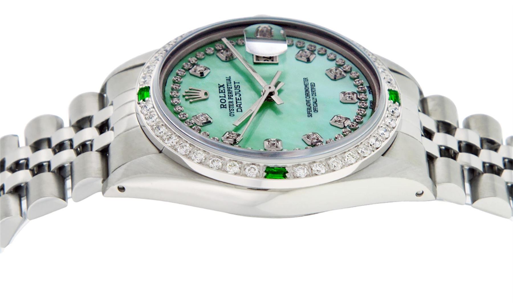 One Men's Stainless Steel Rolex Datejust Polished, Serviced & Electronically Tested, Stainless Steel Case: 36mm, Stainless Steel Crown, Custom Bezel: New 18K White Gold Synthetic Emerald Beadset Diamond Bezel, Stone Count: 36 Diamonds + 4 Synthetic Emeralds. Total Weight 1.0 Carat, Clarity: SI-VS, Color: G to H. Custom Crystal: New Synthetic Sapphire Cyclops Lens. Custom Hands: New Luminescent Hands. Movement: Automatic Winding Movement Caliber 3035. Custom Dial: Green Mother Of Pearl String Diamond Dial, Diamond Count: 58 Diamond In Dial G To H In Color, Clarity: VS2-SI1. Date Window: 3 O'Clock Position Date Display, Quickset, Model: Datejust. Condition: G-6 Extra Fine. Bracelet: Stainless Steel Jubilee Band. Bright Polish & Satin Finish. 7.0 Inch Length, Adjustable. Standard Clasp, With Rolex Logo. This Watch Has Been Serviced Time Tested And Is In Excellent Condition It Is Free Of All Scratches And Dents