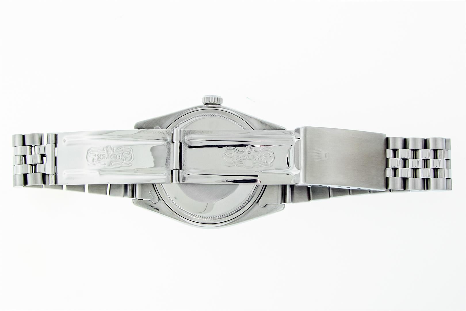 One Mens Rolex Stainless Steel Datejust Polished Bright with Satin Finish, This Watch Has Been Serviced & Electronically Tested, Stainless Steel Case: 36mm, Rolex Stainless Steel Crown, Bezel: White Gold Fluted Bezel, Custom Crystal: New Plastic With Date Window. Custom Hands: New Luminescent Hands. Rolex Movement: Automatic Winding Movement. Custom Dial: Refinished To Green With Roman Hour Markers. Date Window: 3 O'clock Position Date Display, Quickset, Model: Datejust. Condition: G-6 Extra Fine. Rolex Bracelet: Stainless Steel Jubilee Band. Bright Polish & Satin Finish. 7.0 Inch Length, Adjustable. Standard Clasp, With Rolex Logo. This Preowned Watch Has Been Serviced Time Tested And Is In Excellent Condition It Is Free Of All Scratches And Dents.