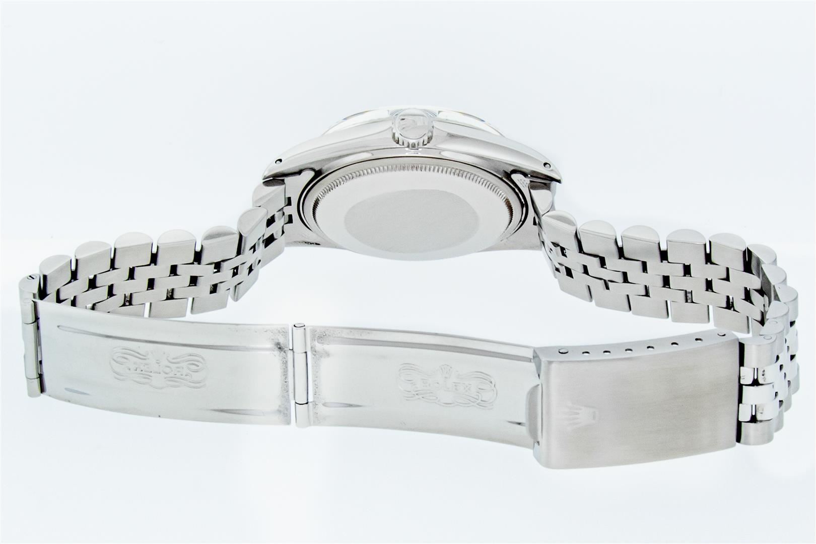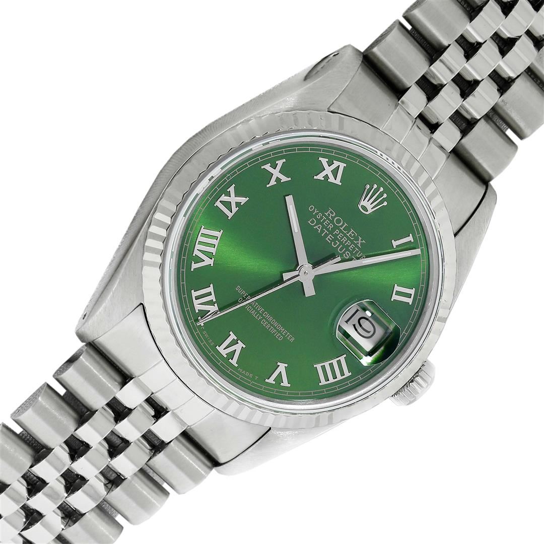 One Mens Rolex Stainless Steel Datejust Polished Bright with Satin Finish, This Watch Has Been Serviced & Electronically Tested, Stainless Steel Case: 36mm, Rolex Stainless Steel Crown, Bezel: White Gold Fluted Bezel, Custom Crystal: New Plastic With Date Window. Custom Hands: New Luminescent Hands. Rolex Movement: Automatic Winding Movement. Custom Dial: Refinished To Green With Roman Hour Markers. Date Window: 3 O'clock Position Date Display, Quickset, Model: Datejust. Condition: G-6 Extra Fine. Rolex Bracelet: Stainless Steel Jubilee Band. Bright Polish & Satin Finish. 7.0 Inch Length, Adjustable. Standard Clasp, With Rolex Logo. This Preowned Watch Has Been Serviced Time Tested And Is In Excellent Condition It Is Free Of All Scratches And Dents.