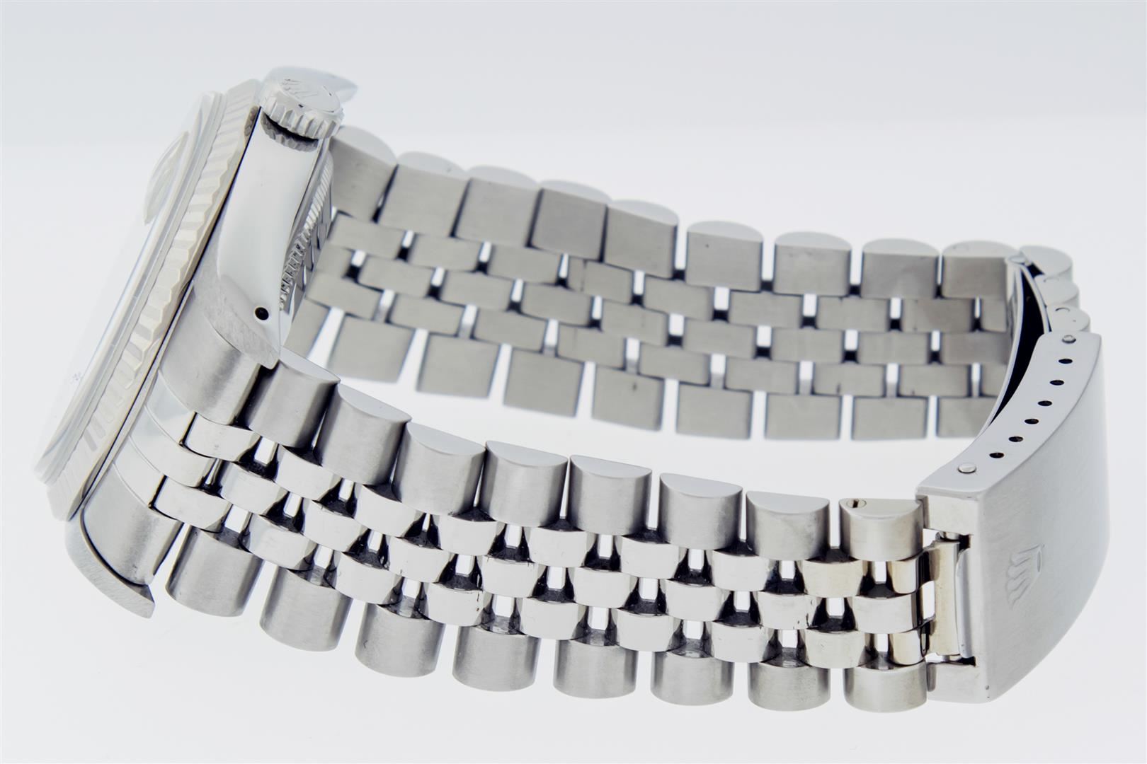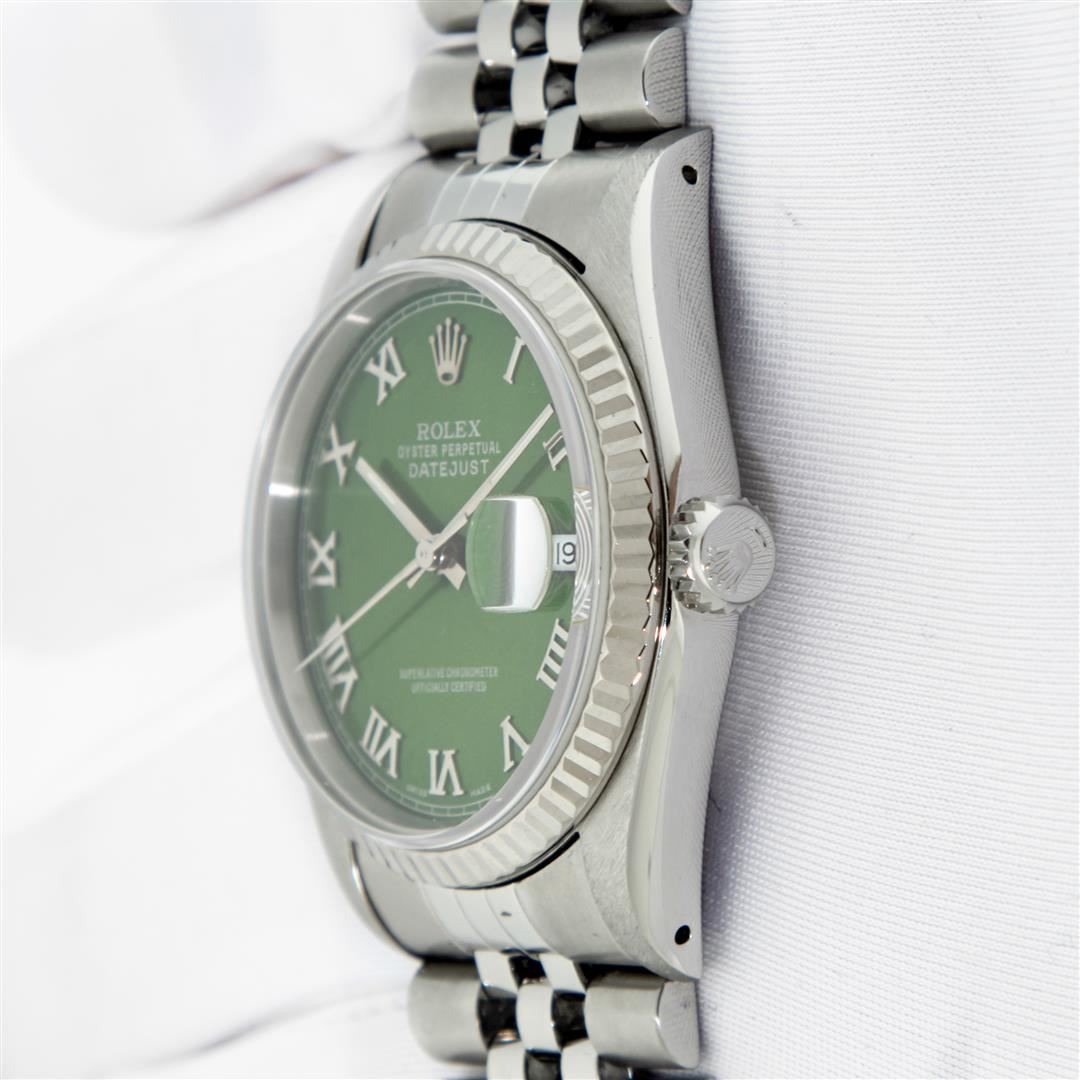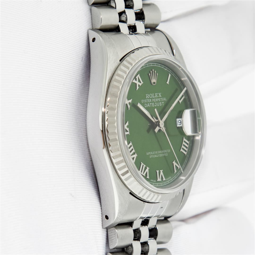 One Men's Stainless Steel Rolex Datejust Polished Bright with Satin Finish, This Watch Has Been Serviced & Electronically Tested, Stainless Steel Case: 36mm, Rolex Stainless Steel Crown, Rolex Bezel: White Gold Fluted Bezel. Custom Crystal: New Sapphire with Magnified Date Window. Custom Hands: New Luminescent Hands. Rolex Movement: Automatic Winding Movement Caliber 3135. Custom Dial: Refinished To Green with Roman Numerical Hour Markers, Diamond Count: 10 Diamonds On Dial, G To H In Color, SI-VS Clarity. Date Window: 3 O'Clock Position Date Display, Quickset, Model: Datejust, Condition: G-6 Extra Fine. Rolex Bracelet: Stainless Steel Jubilee Band. Bright Polish & Satin Finish. 7.0 Inch Length, Adjustable. Standard Clasp, with Rolex Logo. This Pre Owned Watch Has Been Serviced Time Tested And Is In Excellent Condition It Is Free Of All Scratches And Dents.