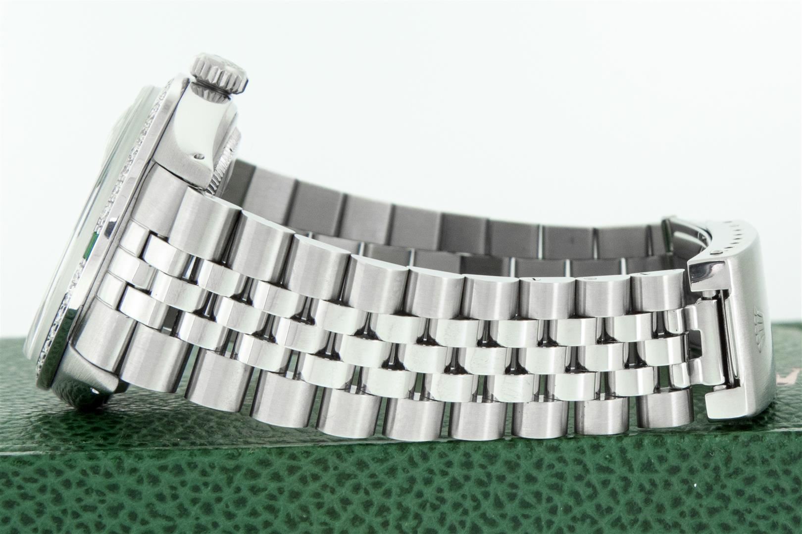 One Men's Stainless Steel Rolex Datejust Polished, Serviced & Electronically Tested, Rolex Stainless Steel Case: 36mm, Rolex Stainless Steel Crown, Custom Bezel: New 18K White Gold Emerald Beadset Diamond Bezel, Diamond + Gem Count: 36 Diamonds + 4 Synthetic Emeralds, Total Weight 1.00 Carat, Clarity: SI-VS, Color: G to H. Custom Crystal: New Sapphire With Magnified Date Window. Custom Hands: New Luminescent Hands. Rolex Movement: Automatic Winding Movement. Custom Dial: Refinished To Green Vignette With Added Diamond Hour Markers, 10 Diamond Dial, G To H In Color, Clarity: SI-VS. Date Window: 3 O'clock Position Date Display, Quickset, Model: Datejust. Condition: G-6 Extra Fine. Rolex Bracelet: Stainless Steel Jubilee Band. Bright Polish & Satin Finish. 7.0 Inch Length, Adjustable. Standard Clasp, With Rolex Logo. This Pre Owned Watch Has Been Serviced Time Tested And Is In Excellent Condition It Is Free Of All Scratches And Dents. This Watch Comes With A Rolex Box.
