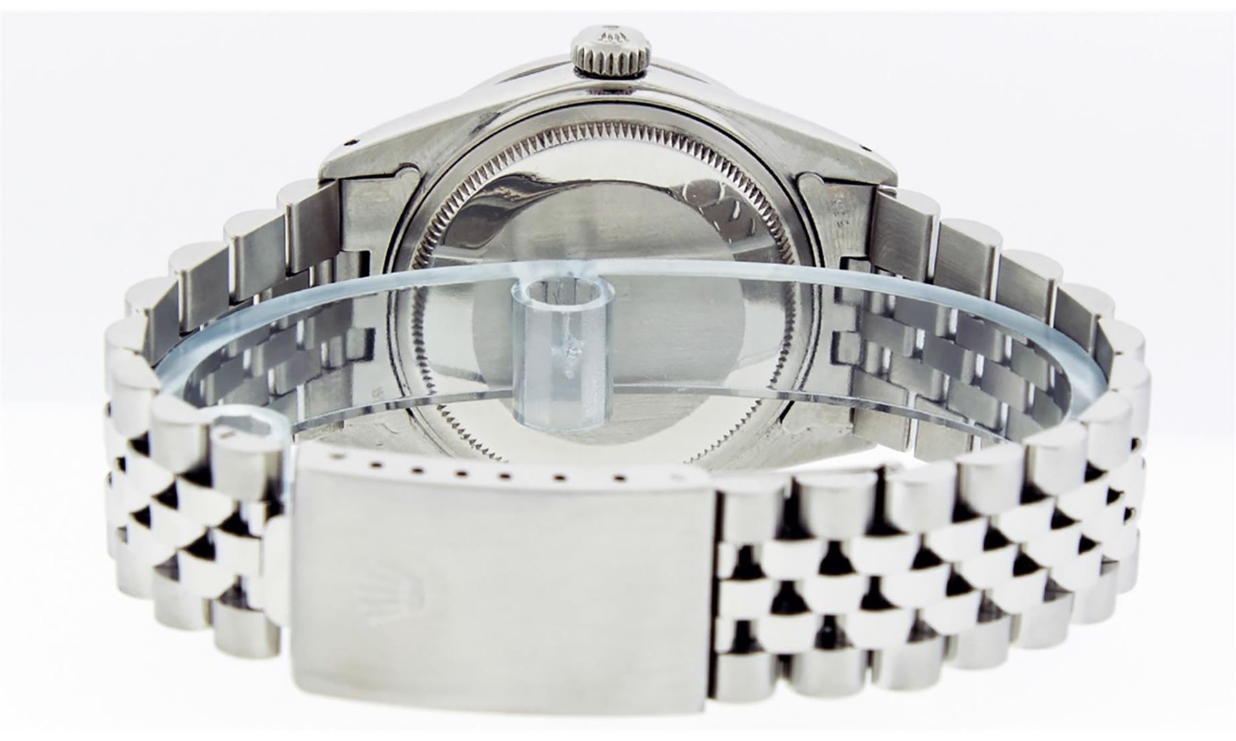 One Men's Stainless Steel Rolex Datejust Polished Bright with Satin Finish, This Watch Has Been Serviced & Electronically Tested, Stainless Steel Case: 36mm, Stainless Steel Crown, Bezel: 14K White Gold Fluted Bezel. Custom Crystal: New Acrylic Cyclops Lens. Custom Hands: New Luminescent Hands. Movement: Automatic Winding Movement Caliber 3035. Custom Dial: Ice Blue Diamond Dial With Diamond Hour Markers, Diamond Count: 10 Diamonds in Dial Color: G To H In Color, SI-VS Clarity. Date Window: 3 O'clock Position Date Display, Quickset, Model: Datejust, Condition: G-6 Extra Fine. Bracelet: Stainless Steel Jubilee. Bright Polish & Satin Finish. 7.0 Inch Length, Adjustable. Standard Clasp, With Rolex Logo. This Watch Has Been Serviced Time Tested And Is In Excellent Condition It Is Free Of All Scratches And Dents