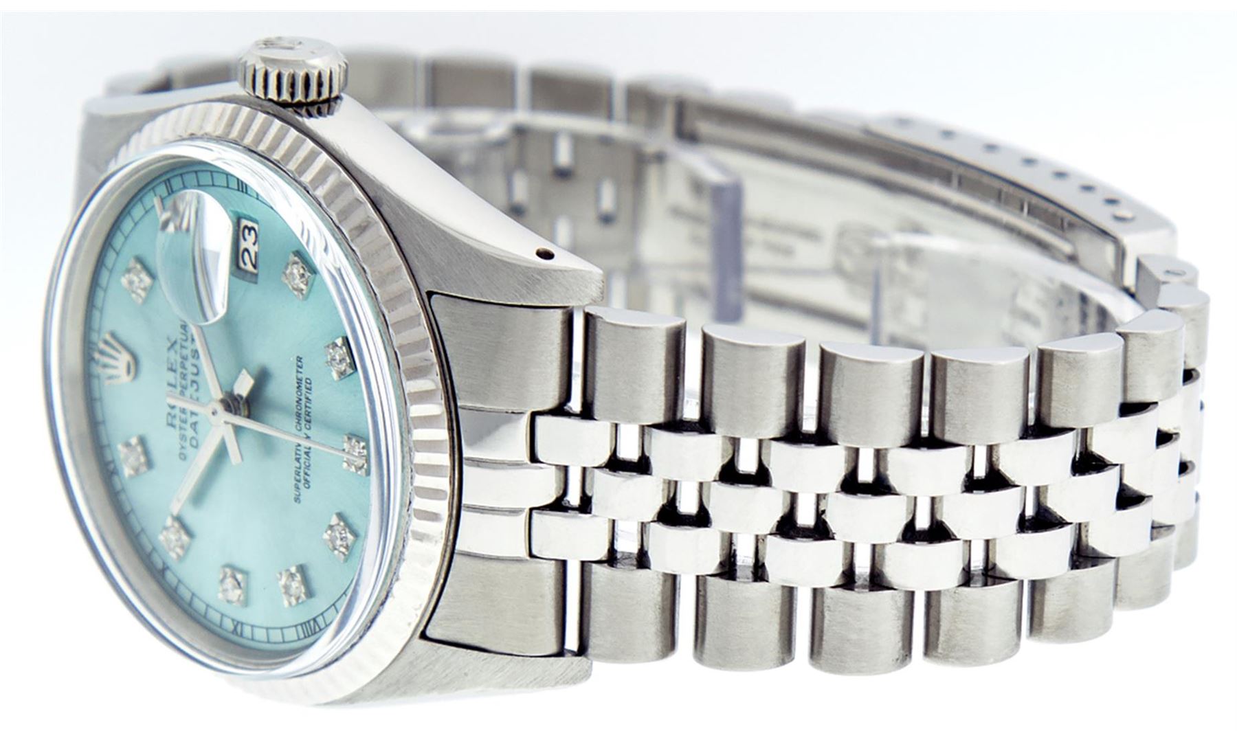 One Mens Stainless Steel Rolex Datejust Polished Bright with Satin Finish, This Watch Has Been Serviced & Electronically Tested, Stainless Steel Case: 36mm, Stainless Steel Crown, Original Bezel: 14K White Gold Fluted Bezel. Custom Crystal: New Acrylic Cyclops Lens. Custom Hands: New Luminescent Hands. Movement: Automatic Winding Movement Caliber 3035. Custom Dial: Ice Blue Dial With Diamond Hour Markers and Track Square Setting, 10 Diamonds in Dial G To H In Color, SI-VS Clarity. Date Window: 3 O'Clock Position Date Display, Quickset, Model: Datejust, Condition: G-6 Extra Fine. Bracelet:Stainless Steel Jubilee. Bright Polish & Satin Finish. 7.0 Inch Length, Adjustable. Standard Clasp, With Rolex Logo. This Watch Has Been Serviced Time Tested And Is In Excellent Condition It Is Free Of All Scratches And Dents