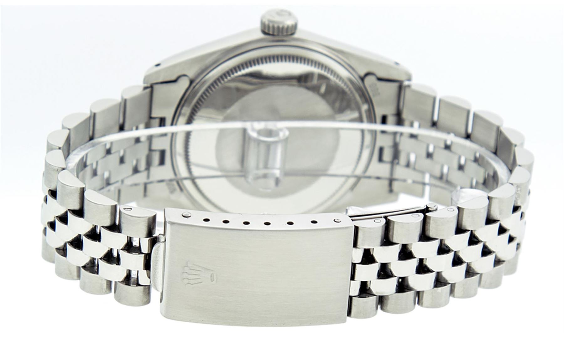 One Mens Stainless Steel Rolex Datejust Polished Bright with Satin Finish, This Watch Has Been Serviced & Electronically Tested, Stainless Steel Case: 36mm, Stainless Steel Crown, Original Bezel: 14K White Gold Fluted Bezel. Custom Crystal: New Acrylic Cyclops Lens. Custom Hands: New Luminescent Hands. Movement: Automatic Winding Movement Caliber 3035. Custom Dial: Ice Blue Dial With Diamond Hour Markers and Track Square Setting, 10 Diamonds in Dial G To H In Color, SI-VS Clarity. Date Window: 3 O'Clock Position Date Display, Quickset, Model: Datejust, Condition: G-6 Extra Fine. Bracelet:Stainless Steel Jubilee. Bright Polish & Satin Finish. 7.0 Inch Length, Adjustable. Standard Clasp, With Rolex Logo. This Watch Has Been Serviced Time Tested And Is In Excellent Condition It Is Free Of All Scratches And Dents