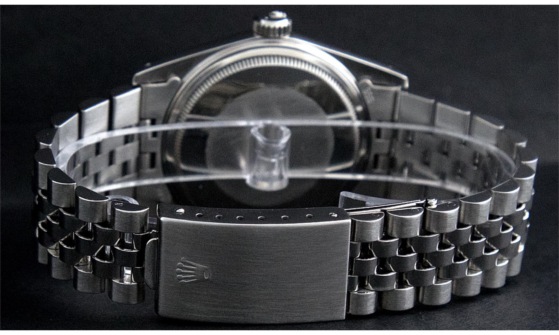 One Men's Stainless Steel Rolex Datejust Polished Bright with Satin Finish, This Watch Has Been Serviced & Electronically Tested, Stainless Steel Case: 36mm, Stainless Steel Crown, Bezel: 14K White Gold Fluted Bezel. Custom Crystal: New Acrylic Cyclops Lens. Custom Hands: New Luminescent Hands. Movement: Automatic Winding Movement. Custom Dial: Ice Blue Dial With Diamond Hour Markers and Roman Track, 10 Diamonds On Dial G To H In Color, SI-VS Clarity. Date Window: 3 O'clock Position Date Display, Quickset, Model: Datejust, Condition: G-6 Extra Fine. Bracelet: Stainless Steel Jubilee. Bright Polish & Satin Finish. 7.0 Inch Length, Adjustable. Standard Clasp, With Rolex Logo. This Watch Has Been Serviced Time Tested And Is In Excellent Condition It Is Free Of All Scratches And Dents.