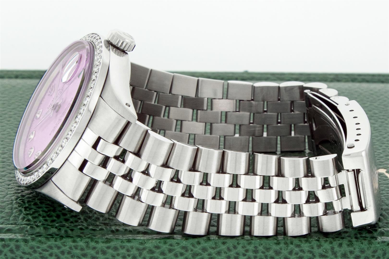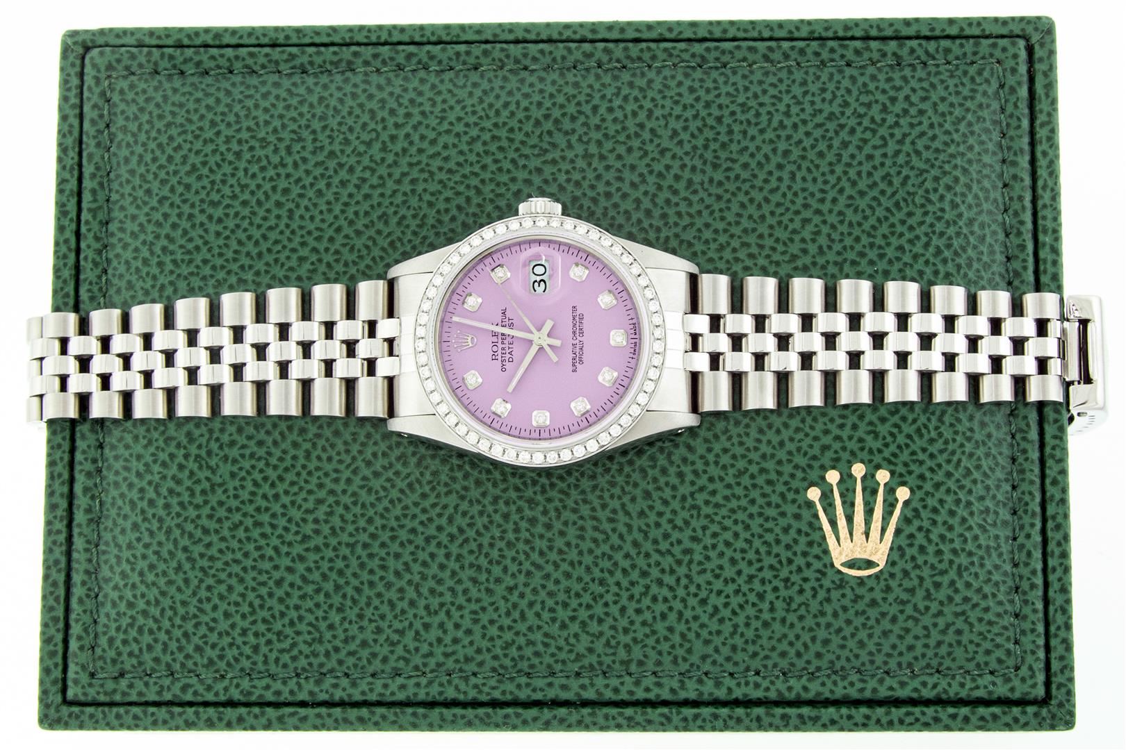 One Mens Rolex Stainless Steel Datejust Polished Bright with Satin Finish, This Watch Has Been Serviced & Electronically Tested, Stainless Steel Case: 36mm, Rolex Stainless Steel Crown, Custom Bezel: New Stainless Steel Bead-set Diamond Bezel, Diamond Count: 54 Diamonds In Bezel, Total Weight 1.00 Carat, Clarity: SI-VS, Color: G to H. Custom Crystal: New Sapphire With Magnified Date Window. Custom Hands: New Luminescent Hands. Rolex Movement: Automatic Winding Movement. Custom Dial: Refinished To Lilac Diamond Dial, Diamond Count: 10 Diamonds In Dial, Color: G to H, Clarity: VS2-SI1. Date Window: 3 O'clock Position Date Display, Quickset, Model: Datejust. Condition: G-6 Extra Fine. Rolex Bracelet: Stainless Steel Jubilee Band. Bright Polish & Satin Finish. 7.0 Inch Length, Adjustable. Standard Clasp, With Rolex Logo. This Preowned Watch Has Been Serviced Time Tested And Is In Excellent Condition It Is Free Of All Scratches And Dents. This Watch Comes With A Rolex Box.